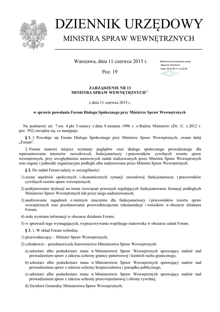 DZIENNIK URZĘDOWY MINISTRA SPRAW WEWNĘTRZNYCH Warszawa, dnia 11 czerwca 2015 r. Elektronicznie podpisany przez: Sławomir Szantroch Poz. 19 Data: 2015-06-11 14:32:05 ZARZĄDZENIE NR 13 MINISTRA SPRAW WEWNĘTRZNYCH1) z dnia 11 czerwca 2015 r. w sprawie powołania Forum Dialogu Społecznego przy Ministrze Spraw Wewnętrznych Na podstawie art. 7 ust. 4 pkt 5 ustawy z dnia 8 sierpnia 1996 r. o Radzie Ministrów (Dz. U. z 2012 r. poz. 392) zarządza się, co następuje: § 1. 1. Powołuje się Forum Dialogu Społecznego przy Ministrze Spraw Wewnętrznych, zwane dalej „Forum”. 2. Forum stanowi miejsce wymiany poglądów oraz dialogu społecznego prowadzonego dla reprezentowania interesów zawodowych funkcjonariuszy i pracowników cywilnych resortu spraw wewnętrznych, przy uwzględnieniu ustawowych zadań realizowanych przez Ministra Spraw Wewnętrznych oraz organy i jednostki organizacyjne podległe albo nadzorowane przez Ministra Spraw Wewnętrznych. § 2. Do zadań Forum należy w szczególności: 1) ocena aspektów społecznych i ekonomicznych sytuacji zawodowej funkcjonariuszy i pracowników cywilnych resortu spraw wewnętrznych; 2) podejmowanie dyskusji na temat rozwiązań prawnych regulujących funkcjonowanie formacji podległych Ministrowi Spraw Wewnętrznych lub przez niego nadzorowanych; 3) analizowanie zagadnień o istotnym znaczeniu dla funkcjonariuszy i pracowników resortu spraw wewnętrznych oraz przedstawianie przewodniczącemu rekomendacji i wniosków w obszarze działania Forum; 4) stała wymiana informacji w obszarze działania Forum; 5) w sprawach tego wymagających, wypracowywanie wspólnego stanowiska w obszarze zadań Forum. § 3. 1. W skład Forum wchodzą: 1) przewodniczący – Minister Spraw Wewnętrznych; 2) członkowie – przedstawiciele kierownictwa Ministerstwa Spraw Wewnętrznych: a) sekretarz albo podsekretarz stanu w Ministerstwie Spraw Wewnętrznych sprawujący nadzór nad prowadzeniem spraw z zakresu ochrony granicy państwowej i kontroli ruchu granicznego, b) sekretarz albo podsekretarz stanu w Ministerstwie Spraw Wewnętrznych sprawujący nadzór nad prowadzeniem spraw z zakresu ochrony bezpieczeństwa i porządku publicznego, c) sekretarz albo podsekretarz stanu w Ministerstwie Spraw Wewnętrznych sprawujący nadzór nad prowadzeniem spraw z zakresu ochrony przeciwpożarowej i obrony cywilnej, d) Dyrektor Generalny Ministerstwa Spraw Wewnętrznych; Dziennik Urzędowy Ministra Spraw Wewnętrznych –2– Poz. 19 3) członkowie – przedstawiciele Ministerstwa Spraw Wewnętrznych: a) dyrektor komórki organizacyjnej właściwej w sprawach nadzoru nad Policją i Biurem Ochrony Rządu, b) dyrektor komórki organizacyjnej właściwej w sprawach nadzoru nad Państwową Strażą Pożarną, c) dyrektor komórki organizacyjnej właściwej w sprawach nadzoru nad Strażą Graniczną, d) dyrektor komórki organizacyjnej właściwej w sprawach wykonywania zadań dysponenta części budżetowej pozostającej we właściwości Ministra Spraw Wewnętrznych, e) dyrektor komórki organizacyjnej właściwej w sprawach wykonywania zadań z zakresu pomocy prawnej, f) dyrektor komórki organizacyjnej właściwej w sprawach nadzoru założycielskiego Ministra Spraw Wewnętrznych nad samodzielnymi publicznymi zakładami opieki zdrowotnej, g) Pełnomocnik Ministra Spraw Wewnętrznych do spraw kontaktów ze związkami zawodowymi – sekretarz Forum, h) Pełnomocnik Ministra Spraw Wewnętrznych do spraw równego traktowania w służbach mundurowych podległych lub nadzorowanych przez Ministra Spraw Wewnętrznych; 4) członkowie – przedstawiciele organów i jednostek organizacyjnych podległych Ministrowi Spraw Wewnętrznych lub przez niego nadzorowanych: a) Komendant Główny Policji oraz osoba wyznaczona przez Komendanta Głównego Policji, b) Komendant Główny Państwowej Straży Pożarnej oraz osoba wyznaczona przez Komendanta Głównego Państwowej Straży Pożarnej, c) Komendant Główny Straży Granicznej oraz osoba wyznaczona przez Komendanta Głównego Straży Granicznej, d) Szef Biura Ochrony Rządu oraz osoba wyznaczona przez Szefa Biura Ochrony Rządu; 5) członkowie – przedstawiciele związków zawodowych reprezentujących funkcjonariuszy organów i jednostek organizacyjnych podległych Ministrowi Spraw Wewnętrznych lub przez niego nadzorowanych: a) pięciu przedstawicieli Niezależnego Samorządnego Związku Zawodowego Policjantów, b) jeden przedstawiciel Niezależnego Samorządnego Związku Zawodowego Pracowników Pożarnictwa, c) dwóch przedstawicieli Związku Zawodowego Strażaków „Florian”, d) dwóch przedstawicieli Krajowej Sekcji Pożarnictwa Niezależnego Samorządnego Związku Zawodowego „Solidarność”, e) dwóch przedstawicieli Niezależnego Samorządnego Związku Zawodowego Funkcjonariuszy Straży Granicznej; 6) członkowie – przedstawiciele związków zawodowych reprezentujących pracowników cywilnych resortu spraw wewnętrznych: a) dwóch przedstawicieli Niezależnego Samorządnego Związku Zawodowego Pracowników Policji, b) jeden przedstawiciel Związku Zawodowego Pracowników Policji – Komisja Krajowa w Katowicach, c) trzech przedstawicieli Związku Wewnętrznych i Administracji, Zawodowego Pracowników Cywilnych Ministerstwa Spraw d) jeden przedstawiciel Niezależnego Związku Zawodowego Policji w Katowicach, e) jeden przedstawiciel Organizacji Międzyzakładowej Niezależnego Zawodowego „Solidarność” Pracowników Cywilnych Policji. Samorządnego Związku 2. Przewodniczący, z własnej inicjatywy lub na wniosek członka, może zapraszać do udziału w posiedzeniach Forum osoby spoza jego składu, w szczególności ekspertów w zakresie spraw objętych zadaniami Forum. Eksperci mają prawo wyrażania swoich opinii i rekomendacji. Dziennik Urzędowy Ministra Spraw Wewnętrznych –3– Poz. 19 3. W posiedzeniach Forum stale lub doraźnie uczestniczą, bez prawa udziału w uzgadnianiu wspólnego stanowiska, osoby wskaza