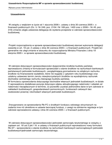 Uzasadnienie Rozporządzenia MF w sprawie sprawozdawczości budżetowej Wpisany przez Administrator Uzasadnienie W związku z wejściem w życie od 1 stycznia 2006 r. ustawy z dnia 30 czerwca 2005 r. o finansach publicznych (Dz. U. Nr 249, poz. 2104 i Nr 169 poz. 1420 oraz z 2006 r. Nr 45, poz. 319) zmianie uległa ustawowa delegacja do wydania przepisów w zakresie sprawozdawczości budżetowej. Projekt rozporządzenia w sprawie sprawozdawczości budżetowej stanowi wykonanie delegacji zawartej w art. 18 ust. 2 ustawy z dnia 30 czerwca 2005 r. o finansach publicznych. Projekt ten generalnie nie uległ zmianie w stosunku do rozporządzenia Ministra Finansów z dnia 19 sierpnia 2005 r. w sprawie sprawozdawczości budżetowej. W zakresie dotyczącym sprawozdawczości dysponentów środków budżetu państwa wprowadzono zmianę w formularzach sprawozdań o stanie środków na rachunkach bankowych państwowych jednostek budżetowych, uwzględniającą gromadzenie na odrębnym rachunku środków na finansowanie wydatków, które nie wygasły z upływem roku budżetowego oraz ustalony ustawowo termin zwrotu niewykorzystanych środków na wyodrębniony rachunek dochodów centralnego rachunku bieżącego budżetu państwa. W formularzu sprawozdania dotyczącego dochodów własnych jednostek budżetowych, w dziale C wprowadzono dodatkowe pozycje dotyczące odpisu aktualizującego należności i odsetek od należności niezapłaconych w terminie, co pozwoliło uzyskać jednorodne dane w tym zakresie w zakładach budżetowych, gospodarstwach pomocniczych, funduszach celowych bez osobowości prawnej i dochodach własnych jednostek budżetowych. Zrezygnowano ze sprawozdania Rb-FC o środkach funduszu celowego otrzymanych na zadania inne niż określone w ustawie tworzącej fundusz, z uwagi na odmienne regulacje w tym zakresie wprowadzone ustawą z dnia 30 czerwca 2005 r. o finansach publicznych. W zakresie dotyczącym sprawozdawczości jednostek samorządu terytorialnego w związku z zapisem art. 18 ust 2 pkt 1 lit. e ustawy o finansach publicznych wprowadzono nowy formularz Rb-ST - sprawozdanie o stanie środków na rachunkach bankowych samorządowych jednostek budżetowych/jednostek samorządu terytorialnego. 1/4 Uzasadnienie Rozporządzenia MF w sprawie sprawozdawczości budżetowej Wpisany przez Administrator W sprawozdaniu Rb-27S miesięczne/roczne z wykonania planu dochodów budżetowych jednostki samorządu terytorialnego kolumnę „Skutki decyzji wydanych przez organy podatkowe na podstawie ustawy z dnia z dnia 29 sierpnia 1997 r. - Ordynacja podatkowa (Dz. U. z 2005 r. Nr 8, poz. 60, Nr 85, poz. 727, Nr 86, poz. 732 i Nr 143, poz. 1199 oraz z 2006 r. Nr 66, poz. 470, obliczone za okres sprawozdawczy" podzielono na dwie kolumny tj. „umorzenia zaległości podatkowych" i „rozłożenia na raty, odroczenia terminu płatności". Takie same zmiany wprowadzono w formularzu Rb-PDP. W sprawozdaniu Rb-28S miesięczne/roczne z wykonania planu wydatków budżetowych jednostki samorządu terytorialnego zmieniony został nagłówek kolumny 10, w zakresie powołania się na przepisy ustawy o finansach publicznych. W sprawozdaniach Rb-Z i Rb-N w główce formularza usunięto kolumnę „część". W związku z zapisem art. 18 ust 2 pkt 1 lit. c ustawy o finansach publicznych wprowadzono nowy formularz Rb-ZUS - sprawozdanie z wykonania planu finansowego Zakładu Ubezpieczeń Społecznych. Z uwagi na określony w § 2 rozporządzenia Ministra Polityki Społecznej z dnia 31 marca 2005 r. w sprawie sposobu prowadzenia gospodarki finansowej Kasy Rolniczego Ubezpieczenia Społecznego (Dz. U. Nr 68, poz. 599) plan finansowy KRUS, obowiązek sporządzania sprawozdania z wykonania planu finansowego Kasy Rolniczego Ubezpieczenia Społecznego jest realizowany poprzez sporządzanie odrębnych sprawozdań z wykonania planów finansowych funduszy: emerytalno-rentowego, prewencji i rehabilitacji oraz administracyjnego, co zostało określone w § 4 pkt 1 lit. p rozporządzenia. Zapis art. 18 ust 2 pkt 3 ww. ustawy jest realizowany poprzez wprowadzenie nowego formularza Rb-Z-PPP - sprawozdanie o stanie zobowiązań z tytułu umów partnerstwa publiczno-prywatnego. 1. Pozostałe, dotychczasowe formularze sprawozdań pozostają bez zmian. 2. Ponadto w związku z propozycjami zgłaszanymi przez dysponentów środków budżetu państwa i jednostki samorządu terytorialnego wprowadzono zapis, że sprawozdania jednostkowe oraz łączne i zbiorcze będą sporządzane w złotych i groszach, tj. tak jak prowadzone są księgi rachunkowe, bez konieczności zaokrąglania. 3. Jednostki samorządu terytorialnego będą mogły przekazywać sprawozdania wyłącznie w formie elektronicznej, tylko wtedy, gdy autentyczność ich pochodzenia i integralność ich treści będą zagwarantowane bezpiecznym podpisem elektronicznym zgodnie z ustawą z dnia 18 września 2001 r. o podpisie elektronicznym (Dz. U. Nr 130, poz. 1450, z późn. zm), weryfikowanym przy pomocy ważnego kwalifikowanego certyfikatu. Formaty wymiany danych zostaną zamieszczone na stronie internetowej Biuletynu Informacji Publicznej, o którym mowa w art. 8 ustawy z dnia 6 września 2001 r. o dostępie do informacji 2/4 Uzasadnienie Rozporządzenia MF w sprawie sprawozdawczości budżetowej Wpisany przez Administrator publicznej (Dz. U Nr 112, poz. 1198 z późn. zm.). Sprawozdanie w formie elektronicznej do regionalnych izb obrachunkowych będą przekazywane z wykorzystaniem aplikacji wskazanej przez Ministerstwo Finansów. Niniejsze rozporządzenie nie powoduje skutków finansowych dla budżetu państwa i budżetów jednostek samorządu terytorialnego. Stosownie do postanowień art. 241 ustawy o finansach publicznych akty wykonawcze wydane na podstawie ustawy z dnia 26 listopada 1998 r. o finansach publicznych (Dz.U. z 2003 r. Nr 15, poz. 148 z późn. zm) zachowują moc do czasu wejścia w życie nowych przepisów wykonawczych, nie dłużej jednak niż do dnia 30 cz