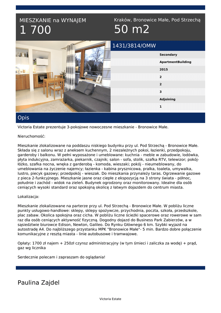 Kraków, Bronowice Małe, Pod Strzechą MIESZKANIE na WYNAJEM 50 m2 1 700 1431/3814/OMW Secondary ApartmentBuilding 2015 2 2 3 Adjoining 1 Opis Victoria Estate prezentuje 3-pokojowe nowoczesne mieszkanie - Bronowice Małe. Nieruchomość: Mieszkanie zlokalizowane na poddaszu niskiego budynku przy ul. Pod Strzechą - Bronowice Małe. Składa się z salonu wraz z aneksem kuchennym, 2 niezależnych pokoi, łazienki, przedpokoju, garderoby i balkonu. W pełni wyposażone i umeblowane: kuchnia - meble w zabudowie, lodówka, płyta indukcyjna, zamrażarka, piekarnik, czajnik; salon - sofa, stolik, szafka RTV, telewizor; pokójłóżko, szafka nocna, wnęka z garderobą - komoda, wieszaki; pokój - nieumeblowany, do umeblowania na życzenie najemcy; łazienka - kabina prysznicowa, pralka, toaleta, umywalka, lustro, piecyk gazowy; przedpokój - wieszak. Do mieszkania przynależy taras. Ogrzewanie gazowe z pieca 2-funkcyjnego. Mieszkanie jasne oraz ciepłe z ekspozycją na 3 strony świata - północ, południe i zachód - widok na zieleń. Budynek ogrodzony oraz monitorowany. Idealne dla osób ceniących wysoki standard oraz spokojną okolicę z łatwym dojazdem do centrum miasta. Lokalizacja: Mieszkanie zlokalizowane na parterze przy ul. Pod Strzechą - Bronowice Małe. W pobliżu liczne punkty usługowo-handlowe: sklepy, sklepy spożywcze, przychodnia, poczta, szkoła, przedszkole, plac zabaw. Okolica spokojna oraz cicha. W pobliżu liczne ścieżki spacerowe oraz rowerowe w sam raz dla osób ceniących aktywność fizyczną. Dogodny dojazd do Business Park Zabierzów, a w sąsiedztwie biurowce Edison, Newton, Galileo. Do Rynku Głównego 6 km. Szybki wyjazd na autostradę A4. Do najbliższego przystanku MPK "Bronowice Małe"- 5 min. Bardzo dobre połączenie komunikacyjne z resztą miasta - linie autobusowe i tramwajowe. Opłaty: 1700 zł najem + 250zł czynsz administracyjny (w tym śmieci i zaliczka za wodę) + prąd, gaz wg licznika Serdecznie polecam i zapraszam do oglądania! Paulina Zajdel Victoria Estate tel. +48 789 453 049 email: [email protected] Victoria Estate Powered by TCPDF (www.tcpdf.org)