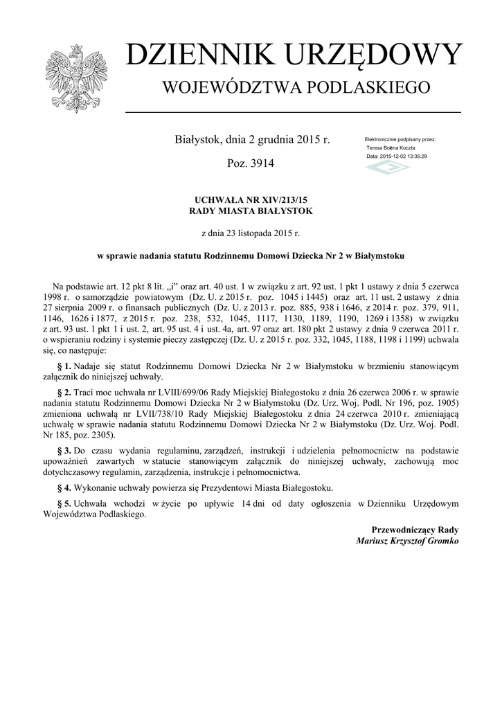 Uchwała Nr XIV/213/15 z dnia 23 listopada 2015 r.
