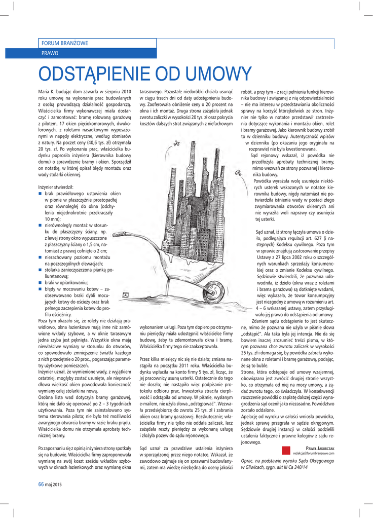 FORUM BRANŻOWE PRAWO ODSTĄPIENIE OD UMOWY Maria K. budując dom zawarła w sierpniu 2010 roku umowę na wykonanie prac budowlanych z osobą prowadzącą działalność gospodarczą. Właścicielka firmy wykonawczej miała dostarczyć i zamontować: bramę rolowaną garażową z pilotem, 17 okien pięciokomorowych, dwukolorowych, z roletami nasadkowymi wyposażonymi w napędy elektryczne, według obmiarów z natury. Na poczet ceny (40,6 tys. zł) otrzymała 20 tys. zł. Po wykonaniu prac, właścicielka budynku poprosiła inżyniera (kierownika budowy domu) o sprawdzenie bramy i okien. Sporządził on notatkę, w której opisał błędy montażu oraz wady stolarki okiennej. Inżynier stwierdził: brak prawidłowego ustawienia okien w pionie w płaszczyźnie prostopadłej oraz równoległej do okna (odchylenia niejednokrotnie przekraczały 10 mm); nierównoległy montaż w stosunku do płaszczyzny ściany, np. z lewej strony okno wypuszczone z płaszczyzny ściany o 1,5 cm, natomiast z prawej cofnięte o 2 cm; niezachowany poziomu montażu na poszczególnych elewacjach; stolarka zanieczyszczona pianką poliuretanową; braki w opiankowaniu; błędy w mocowaniu kotew – zaobserwowano braki dybli mocujących kotwy do ościeży oraz brak pełnego zaczepienia kotew do profilu ościeżnicy. Poza tym okazało się, że rolety nie działają prawidłowo, okna łazienkowe mają inne niż zamówione wkłady szybowe, a w oknie tarasowym jedna szyba jest pęknięta. Wszystkie okna mają niewłaściwe wymiary w stosunku do otworów, co spowodowało zmniejszenie światła każdego z nich przeciętnie o 20 proc., pogarszając parametry użytkowe pomieszczeń. Inżynier uznał, że wymienione wady, z wyjątkiem ostatniej, mogłyby zostać usunięte, ale nieprawidłowa wielkość okien powodowała konieczność wymiany całej stolarki na nową. Osobna lista wad dotyczyła bramy garażowej, którą nie dało się operować po 2 – 3 tygodniach użytkowania. Poza tym nie zainstalowano systemu sterowania pilota; nie było też możliwości awaryjnego otwarcia bramy w razie braku prądu. Właścicielka domu nie otrzymała aprobaty technicznej bramy. Po zapoznaniu się z opinią inżyniera strony spotkały się na budowie. Właścicielka firmy zaproponowała wymianę na swój koszt sześciu wkładów szybowych w oknach łazienkowych oraz wymianę okna 66 maj 2015 tarasowego. Pozostałe niedoróbki chciała usunąć w ciągu trzech dni od daty udostępnienia budowy. Zaoferowała obniżenie ceny o 20 procent na okna i ich montaż. Druga strona zażądała jednak zwrotu zaliczki w wysokości 20 tys. zł oraz pokrycia kosztów dalszych strat związanych z niefachowym wykonaniem usługi. Poza tym dopiero po otrzymaniu pieniędzy miała udostępnić właścicielce firmy budowę, żeby ta zdemontowała okna i bramę. Właścicielka firmy tego nie zaakceptowała. Przez kilka miesięcy nic się nie działo; zmiana nastąpiła na początku 2011 roku. Właścicielka budynku wpłaciła na konto firmy 5 tys. zł, licząc, że jej pracownicy usuną usterki. Ostatecznie do tego nie doszło; nie nastąpiło więc podpisanie protokołu odbioru prac. Inwestorka straciła cierpliwość i odstąpiła od umowy. W piśmie, wysłanym e-mailem, nie użyła słowa „odstępować”. Wezwała przedsiębiorcę do zwrotu 25 tys. zł i zabrania okien oraz bramy garażowej. Bezskutecznie; właścicielka firmy nie tylko nie oddała zaliczek, lecz zażądała reszty pieniędzy za wykonaną usługę i złożyła pozew do sądu rejonowego. Sąd uznał za prawdziwe ustalenia inżyniera w sporządzonej przez niego notatce. Wskazał, że zawodowo zajmuje się on sprawami budowlanymi, zatem ma wiedzę niezbędną do oceny jakości robót, a przy tym – z racji pełnienia funkcji kierownika budowy i związanej z nią odpowiedzialności – nie ma interesu w przedstawianiu okoliczności sprawy na korzyść którejkolwiek ze stron. Inżynier nie tylko w notatce przedstawił zastrzeżenia dotyczące wykonania i montażu okien, rolet i bramy garażowej. Jako kierownik budowy zrobił to w dzienniku budowy. Autentyczność wpisów w dzienniku (po okazaniu jego oryginału na rozprawie) nie była kwestionowana. Sąd rejonowy wskazał, iż powódka nie przedłożyła aprobaty technicznej bramy, mimo wezwań ze strony pozwanej i kierownika budowy. Powódka wyrażała wolę usunięcia niektórych usterek wskazanych w notatce kierownika budowy, nigdy natomiast nie potwierdziła istnienia wady w postaci złego zwymiarowania otworów okiennych ani nie wyraziła woli naprawy czy usunięcia tej usterki. Sąd uznał, iż strony łączyła umowa o dzieło, podlegająca regulacji art. 627 (i następnych) Kodeksu cywilnego. Poza tym w sprawie znajdują zastosowanie przepisy Ustawy z 27 lipca 2002 roku o szczególnych warunkach sprzedaży konsumenckiej oraz o zmianie Kodeksu cywilnego. Sędziowie stwierdzili, że pozwana udowodniła, iż dzieło (okna wraz z roletami i brama garażowa) są dotknięte wadami, więc wykazała, że towar konsumpcyjny jest niezgodny z umową w rozumieniu art. 4 – 6 wskazanej ustawy, zatem przysługiwało jej prawo do odstąpienia od umowy. Zdaniem sądu odstąpienie to jest skuteczne, mimo że pozwana nie użyła w piśmie słowa „odstąpić”. Ala taka była jej intencja. Nie da się bowiem inaczej zrozumieć treści pisma, w którym pozwana chce zwrotu zaliczek w wysokości 25 tys. zł i domaga się, by powódka zabrała wykonane okna z roletami i bramę garażową, podając, że są to buble. Strona, która odstępuje od umowy wzajemnej, obowiązana jest zwrócić drugiej stronie wszystko, co otrzymała od niej na mocy umowy, a żądać zwrotu tego, co świadczyła. W konsekwencji roszczenie powódki o zapłatę dalszej części wynagrodzenia sąd ocenił jako niezasadne. Powództwo zostało oddalone. Apelację od wyroku w całości wniosła powódka, jednak sprawę przegrała w sądzie okręgowym. Sędziowie drugiej instancji