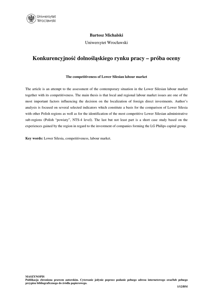 Bartosz Michalski Uniwersytet Wrocławski Konkurencyjność dolnośląskiego rynku pracy – próba oceny The competitiveness of Lower Silesian labour market The article is an attempt to the assessment of the contemporary situation in the Lower Silesian labour market together with its competitiveness. The main thesis is that local and regional labour market issues are one of the most important factors influencing the decision on the localization of foreign direct investments. Author’s analysis is focused on several selected indicators which constitute a basis for the comparison of Lower Silesia with other Polish regions as well as for the identification of the most competitive Lower Silesian administrative sub-regions (Polish “powiaty”, NTS-4 level). The last but not least part is a short case study based on the experiences gained by the region in regard to the investment of companies forming the LG Philips capital group. Key words: Lower Silesia, competitiveness, labour market. MASZYNOPIS Publikacja chroniona prawem autorskim. Cytowanie jedynie poprzez podanie pełnego adresu internetowego oraz/lub pełnego przypisu bibliograficznego do źródła papierowego. 1/12/BM Wprowadzenie Integracja Polski z Unią Europejską uruchomiła szereg procesów o niespotykanej jak dotąd skali i dynamice, które stanowią dla polskiej gospodarki niemałe wyzwanie. Jednym z takich „szoków integracyjnych” jest emigracja Polaków w poszukiwaniu lepszych warunków pracy i życia. Następuje wobec tego klasyczny proces „głosowania nogami” (ang. voting by feet) powiązany w skrajnej postaci ze zjawiskiem drenażu mózgów (ang. brain drain), względnie tzw. migracja przedsiębiorczości. W ocenie piszącego te słowa polska gospodarka wobec tych problemów pozostaje obecnie w dużej mierze bezradna. Konieczna jest zatem refleksja nad poszczególnymi elementami długookresowej strategii rozwoju gospodarczego. Jednym z nich są m.in. kwestie rynku pracy. W kontekście napływu bezpośrednich inwestycji zagranicznych zagadnienie to ma silny wpływ na kształtowanie wizerunku Polski oraz realne atuty, przy pomocy których możliwe jest pozyskiwanie potrzebnego kapitału. Należy w tym miejscu wskazać, iż korporacje międzynarodowe kierują się w swoim działaniu wyłącznie poszukiwaniem nowych przewag strategicznych (kluczowych kompetencji, ang. core competences), które współcześnie w największym stopniu zależą od ilości i jakości wiedzy zakumulowanej w konkretnym regionie (miejscu) inwestycji. Dlatego w wymiarze międzypaństwowym (względnie międzyregionalnym) pojawia się nowy rodzaj konkurencji o „mądre głowy”, z którymi to wiążą się konkretne nadzieje na zdynamizowanie wzrostu gospodarczego i poprawę jakości życia. Zgodnie z teoriami wyjaśniającymi przyczyny międzynarodowej migracji obecna sytuacja stanowi splot trzech zasadniczych czynników. Pierwszym z nich są zmiany technologiczne ułatwiające przemieszczanie i komunikowanie się, co sprzyja tworzeniu tzw. rodzin czy związków weekendowych, kiedy to małżonkowie (partnerzy) widują się jedynie w dni wolne od pracy, większość czasu spędzając z dala od swojego nominalnego miejsca wspólnego zamieszkania. Drugim czynnikiem są kwestie społeczno-ekonomiczne koncentrujące się przede wszystkim na problemie szeroko rozumianych różnic w poziomie rozwoju dzielących Polskę i wysoko rozwinięte kraje Europy Zachodniej. Wreszcie trzecią przyczyną są względy psychologiczne ujmowane w kategoriach „rewolucji rosnących MASZYNOPIS Publikacja chroniona prawem autorskim. Cytowanie jedynie poprzez podanie pełnego adresu internetowego oraz/lub pełnego przypisu bibliograficznego do źródła papierowego. 2/12/BM aspiracji”1 wraz z towarzyszącym jej szybkim wzrostem formalnego poziomu wykształcenia i znajomości języków obcych. Brak możliwości uzyskania pracy zgodnej z określonymi wymaganiami i stwarzającej możliwość życia na określonym (również zgodnym z oczekiwaniami) poziomie stanowi element, który z łatwością wpisuje się w zdefiniowane wyżej trzy rodzaje czynników wypychających (ang. push-factors), skłaniających do poważnego rozważenia decyzji o wyjeździe. Wobec tak zarysowanych tendencji na znaczeniu tracą czynniki ograniczające mobilność pracy, a które w teorii regionalnej integracji gospodarczej określane są mianem nieuchwytnych kosztów migracji2. Są to m.in.: możliwość asymilacji, uprzedzenia kulturowe i socjalne, niepewność zabezpieczenia pracy, różnego rodzaju przesądy, uprzedzenia, skłonność do pozostawania w miejscu urodzenia. Jeśliby przyjąć regionalną optykę spojrzenia na problem konkurencyjności, to szereg zadań stoi nie tylko przed administracją centralną, lecz także przed władzami samorządowymi. Dolny Śląsk jako jeden z potencjalnie najbardziej atrakcyjnych pod względem inwestycyjnym regionów Polski3, dysponując z jednej strony określonymi atutami i korzystając do dobrej „medialnej koniunktury”, musi zdawać sobie sprawę z własnych słabości oraz zarysowanych wyżej zagrożeń natury makroekonomicznej i społecznej wynikających z silnych powiązań z Niemcami4. Niniejszy artykuł stanowi próbę zidentyfikowania kluczowych atutów dolnośląskiego rynku pracy stanowiących o jego konkurencyjności i powiązania ich z innymi silnymi stronami regionu5. 1 W tym kontekście wspomina się także o frustracjach wywołanych rozdźwiękiem pomiędzy oczekiwaniami i realnymi możliwościami oraz oddziaływaniem samych środków masowego przekazu (mediów) kształtujących określoną percepcję zjawisk społecznych, gospodarczych i politycznych. 2 Zob. S. Ładyka, Z teorii integracji gospodarczej, Teoretyczne aspekty korzyści z międzynarodowej regionalnej integracji gospodarczej, SGH, Warszawa 2001, s. 132. 3 Zob. szerzej Atrakcyjność inwestycyjna regionów i podregionów Polski 2006, T. Kalinowski (red.), Instytut b