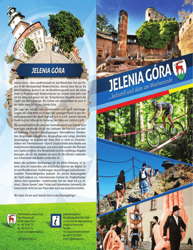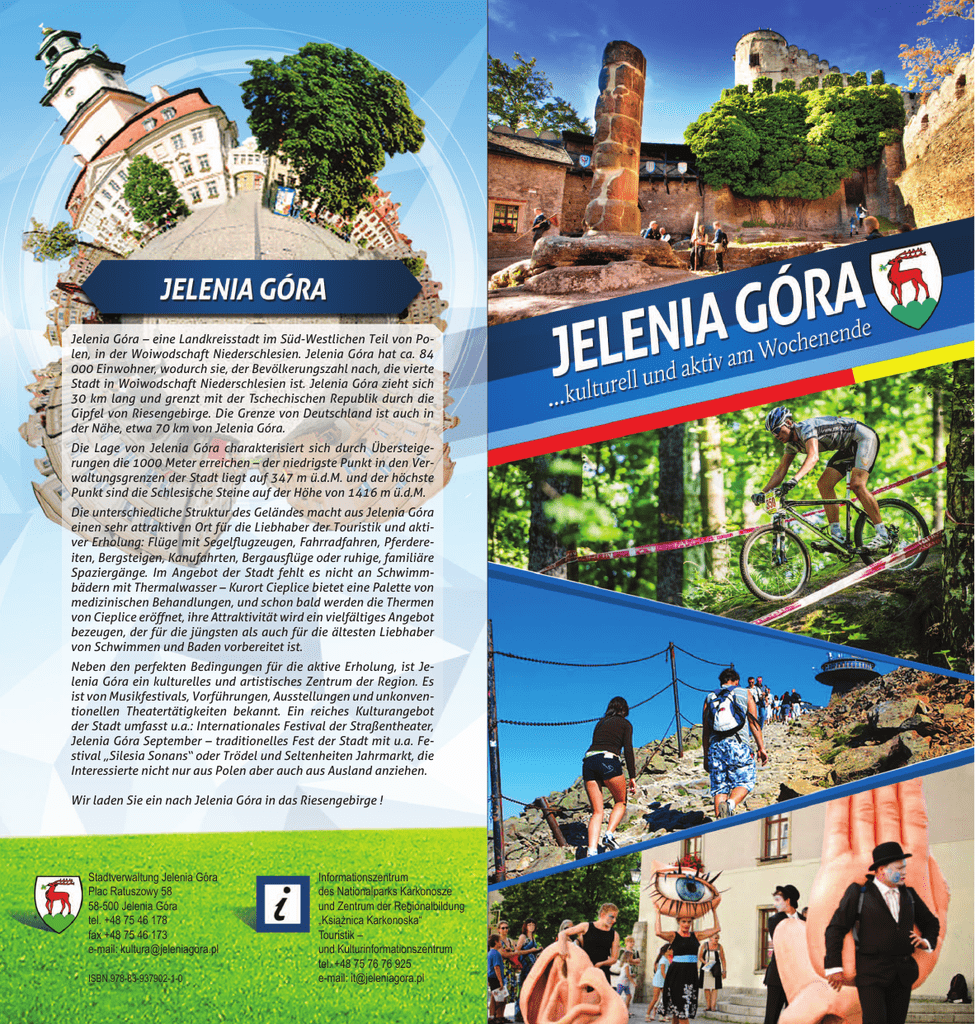 Jelenia Góra – eine Landkreisstadt im Süd-Westlichen Teil von Polen, in der Woiwodschaft Niederschlesien. Jelenia Góra hat ca. 84 000 Einwohner, wodurch sie, der Bevölkerungszahl nach, die vierte Stadt in Woiwodschaft Niederschlesien ist. Jelenia Góra zieht sich 30 km lang und grenzt mit der Tschechischen Republik durch die Gipfel von Riesengebirge. Die Grenze von Deutschland ist auch in der Nähe, etwa 70 km von Jelenia Góra. Die Lage von Jelenia Góra charakterisiert sich durch Übersteigerungen die 1000 Meter erreichen – der niedrigste Punkt in den Verwaltungsgrenzen der Stadt liegt auf 347 m ü.d.M. und der höchste Punkt sind die Schlesische Steine auf der Höhe von 1416 m ü.d.M. Die unterschiedliche Struktur des Geländes macht aus Jelenia Góra einen sehr attraktiven Ort für die Liebhaber der Touristik und aktiver Erholung: Flüge mit Segelflugzeugen, Fahrradfahren, Pferdereiten, Bergsteigen, Kanufahrten, Bergausflüge oder ruhige, familiäre Spaziergänge. Im Angebot der Stadt fehlt es nicht an Schwimmbädern mit Thermalwasser – Kurort Cieplice bietet eine Palette von medizinischen Behandlungen, und schon bald werden die Thermen von Cieplice eröffnet, ihre Attraktivität wird ein vielfältiges Angebot bezeugen, der für die jüngsten als auch für die ältesten Liebhaber von Schwimmen und Baden vorbereitet ist. Neben den perfekten Bedingungen für die aktive Erholung, ist Jelenia Góra ein kulturelles und artistisches Zentrum der Region. Es ist von Musikfestivals, Vorführungen, Ausstellungen und unkonventionellen Theatertätigkeiten bekannt. Ein reiches Kulturangebot der Stadt umfasst u.a.: Internationales Festival der Straßentheater, Jelenia Góra September – traditionelles Fest der Stadt mit u.a. Festival „Silesia Sonans“ oder Trödel und Seltenheiten Jahrmarkt, die Interessierte nicht nur aus Polen aber auch aus Ausland anziehen. Wir laden Sie ein nach Jelenia Góra in das Riesengebirge ! Stadtverwaltung Jelenia Góra Plac Ratuszowy 58 58-500 Jelenia Góra tel. +48 75 46 178 fax +48 75 46 173 e-mail: [email protected] ISBN 978-83-937902-1-0 Informationszentrum des Nationalparks Karkonosze und Zentrum der Regionalbildung „Książnica Karkonoska“ Touristik – und Kulturinformationszentrum tel. +48 75 76 76 925 e-mail: [email protected] JELENIA GÓRA Kleine und GroSSe Innenstadtstrecke, also Stadtverwaltung Jelenia Góra Plac Ratuszowy 58 58-500 Jelenia Góra tel. 75 75 46 100 fax 75 75 46 159 email: [email protected] www.jeleniagora.pl https://www.facebook.com/MiastoJeleniaGora Verleger: Linkeo Interaktywnie Redaktion: Linkeo Interaktywnie, Stadtverwaltung von Jelenia Góra Texte: Linkeo Interaktywnie, Stadtverwaltung von Jelenia Góra Fotos: Linkeo Interaktywnie, Robert Witakowski, Piotr Byszkowski, Vento Studio Jacek Gajda, Karol Woliński, Archiv der Stadtverwaltung von Jelenia Góra Übersetzung: Oliwia Roloff Wurde aus den Mitteln der Stadt Jelenia Góra herausgegeben ISBN 978-83-937902-1-0 Stadt zu sehen ist r e d n i was Wenn Sie eine Wochenendesreise nach Jelenia Góra planen , sollten Sie sich die Zeit nehmen um die interessantesten Sehenswürdigkeiten in der Stadtnähe zu besuchen. Wir bieten Ihnen zwei Routen an: die Kleine Innenstadtstrecke von Jelenia Góra und die Große Innenstadtstrecke von Jelenia Góra. Das Stadtzentrum, reich an Denkmälern aus verschiedenen Epochen, können Sie zu Fuß erkunden, andere Teile von Jelenia Góra - Maciejowa, Czarne, Goduszyn, Sobieszów, Cieplice und Jagniątków empfehlen wir mit Verkehrsmitteln zu erkunden – Auto, öffentlicher Verkehr oder Fahrrad. Die Kleine Innenstadtstrecke von Jelenia Góra Unsere Reise beginnt an Krzywousty Hügel, der etwa 1 km westlich von der Innenstadt entfernt ist. 20 Minuten spazieren ab Bushaltestelle ermöglich die Ankunft an einem Ort, wo den Legenden nach, der Bolesław Krzywousty die Errichtung einer Burg anordnete, die der Kern späteren Siedlung war. Bis dem XV Jahrhundert gab es hier eine Burg, aber es ist nicht mal eine Spur geblieben. Heute ist der Krzywousty Hügel ein Ziel der Spaziergänge vor allem wegen dem Aussichtsturm aus dem Anfang des XX Jh., der als „Grzybek” bekannt ist. Aus dem Aussichtsturm hat man ein Panoramablick über Jelenia Góra, im Hintergrund von Riesengebirge, Kaczawskie Berge (Bober - Katzbach - Gebirge) und Rudawy Janowickie (Landeshuter Kamm). Der Höhepunkt ist die Grodzka Bastei die an der Ecke von Podwale und der Grodzka Straße liegt – ein Gebäude aus dem XVI Jh. mit einer Gerüstkonstruktion, die ein Überbleibsel der Stadtbefestigung ist, im XVIII Jh. in ein Wohnhaus umgewandelt und einer vom Grodzka Bastei sichtbarer Turm der Burgpforten, der das einzige verbleibende Teil der Burgpforten ist, die früher den Eingang zur Stadt bewacht haben. In dem XVI Jahrhundert Turm gab es mal u.a. ein Stadtgefängnis und heute an der Bekrönung des Turms gibt es eine Terrasse mit einem hervorragenden Aussichtspunkt. Der führende Punkt jedes Besuchs in Jelenia Góra ist der Markt, wo wir nach ein paar Gehminuten ab dem Burgpfortenturm antreffen. Die bunten Bürgershäuser rund um das Rathaus aus den XVIII Jh., sind die in Schlesien einzige, ganz erhaltene Bogengänge, so dass man heute, in den sich unten befindenden Kaffees entspannen kann und die Zeit mit Freunden verbringt. In der Mitte des Marktes ragt das Rathaus, die Aufmerksamkeit mit seiner Form auf – der Sitz der Stadtverwaltung. Der neoklassische GebäudekörAbb. 2 Stelzenläufer per ist auf der Höhe des 1 Stocks mit einer abgedeckten Galerie verbunden und mit einem s.g. „Haus der sieben Bürger” – wo sich ursprünglich u.a.: Verkaufsstände der Händler oder Apotheke befand. Heute, zusammen mit dem Rathaus, gründen sie den Sitz der Stadtverwaltung. Die Galerie wurde in den frühen XX Jh. angebaut, um den Beamten den Übergang zwischen den Gebäuden erleichtern, als die Straßenbahn verkehrte. Heute erinnert an die Abb. 1 Aussichtsturm „Grzybek“ 4 Abb. 3 Ratha