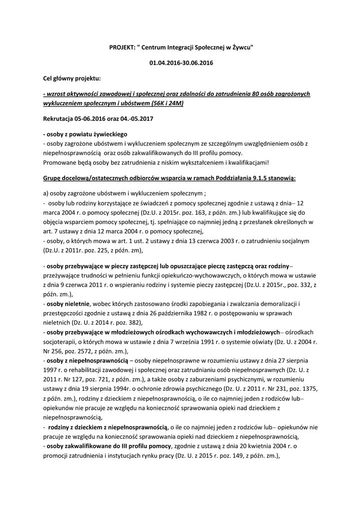 PROJEKT: " Centrum Integracji Społecznej w Żywcu" 01.04.2016-30.06.2016 Cel główny projektu: - wzrost aktywności zawodowej i społecznej oraz zdolności do zatrudnienia 80 osób zagrożonych wykluczeniem społecznym i ubóstwem (56K i 24M) Rekrutacja 05-06.2016 oraz 04.-05.2017 - osoby z powiatu żywieckiego - osoby zagrożone ubóstwem i wykluczeniem społecznym ze szczególnym uwzględnieniem osób z niepełnosprawnością oraz osób zakwalifikowanych do III profilu pomocy. Promowane będą osoby bez zatrudnienia z niskim wykształceniem i kwalifikacjami! Grupę docelową/ostatecznych odbiorców wsparcia w ramach Poddziałania 9.1.5 stanowią: a) osoby zagrożone ubóstwem i wykluczeniem społecznym ; - osoby lub rodziny korzystające ze świadczeń z pomocy społecznej zgodnie z ustawą z dnia 12 marca 2004 r. o pomocy społecznej (Dz.U. z 2015r. poz. 163, z późn. zm.) lub kwalifikujące się do objęcia wsparciem pomocy społecznej, tj. spełniające co najmniej jedną z przesłanek określonych w art. 7 ustawy z dnia 12 marca 2004 r. o pomocy społecznej, - osoby, o których mowa w art. 1 ust. 2 ustawy z dnia 13 czerwca 2003 r. o zatrudnieniu socjalnym (Dz.U. z 2011r. poz. 225, z późn. zm), - osoby przebywające w pieczy zastępczej lub opuszczające pieczę zastępczą oraz rodziny przeżywające trudności w pełnieniu funkcji opiekuńczo-wychowawczych, o których mowa w ustawie z dnia 9 czerwca 2011 r. o wspieraniu rodziny i systemie pieczy zastępczej (Dz.U. z 2015r., poz. 332, z późn. zm.), - osoby nieletnie, wobec których zastosowano środki zapobiegania i zwalczania demoralizacji i przestępczości zgodnie z ustawą z dnia 26 października 1982 r. o postępowaniu w sprawach nieletnich (Dz. U. z 2014 r. poz. 382), - osoby przebywające w młodzieżowych ośrodkach wychowawczych i młodzieżowych ośrodkach socjoterapii, o których mowa w ustawie z dnia 7 września 1991 r. o systemie oświaty (Dz. U. z 2004 r. Nr 256, poz. 2572, z późn. zm.), - osoby z niepełnosprawnością – osoby niepełnosprawne w rozumieniu ustawy z dnia 27 sierpnia 1997 r. o rehabilitacji zawodowej i społecznej oraz zatrudnianiu osób niepełnosprawnych (Dz. U. z 2011 r. Nr 127, poz. 721, z późn. zm.), a także osoby z zaburzeniami psychicznymi, w rozumieniu ustawy z dnia 19 sierpnia 1994r. o ochronie zdrowia psychicznego (Dz. U. z 2011 r. Nr 231, poz. 1375, z późn. zm.), rodziny z dzieckiem z niepełnosprawnością, o ile co najmniej jeden z rodziców lub opiekunów nie pracuje ze względu na konieczność sprawowania opieki nad dzieckiem z niepełnosprawnością, - rodziny z dzieckiem z niepełnosprawnością, o ile co najmniej jeden z rodziców lub opiekunów nie pracuje ze względu na konieczność sprawowania opieki nad dzieckiem z niepełnosprawnością, - osoby zakwalifikowane do III profilu pomocy, zgodnie z ustawą z dnia 20 kwietnia 2004 r. o promocji zatrudnienia i instytucjach rynku pracy (Dz. U. z 2015 r. poz. 149, z późn. zm.), - osoby niesamodzielne, o których mowa w Wytycznych w zakresie realizacji przedsięwzięć w obszarze włączenia społecznego i zwalczania ubóstwa z wykorzystaniem środków w Europejskiego Funduszu Społecznego i Europejskiego Funduszu Rozwoju Regionalnego na lata 2014-2020. , - osoby bezdomne lub dotknięte wykluczeniem z dostępu do mieszkań w rozumieniu Wytycznych Ministra Infrastruktury i Rozwoju w zakresie monitorowania postępu rzeczowego i realizacji programów operacyjnych na lata 2014-2020, b) otoczenie osób zagrożonych wykluczeniem społecznym, w zakresie niezbędnym do wsparcia osób wykluczonych lub zagrożonych wykluczeniem społecznym w ramach programu. Rekrutacja we współpracy z PUP i OPS-ami - działania informacyjno-promocyjne (ogłoszenia w lokalnej prasie, radio, ulotki dystrybuowane w OPS, PUP, przychodniach, biurach organizacji pozarządowych, spotkania z potencjalnymi uczestnikami) Rekrutacja 80 osób (56 kobiet i 24 mężczyzn), które mają przejść cykl szkoleń i warsztatów rozwoju osobistego i umiejętności społecznych zwiększających postawy prospołeczne i prozatrudnieniowe Lista rezerwowych - 5 osób Pracownie: 1. Asystencko-opiekuńcza - 5 osób na rok w sumie 10 osób - Partner nr 1 Miasto Żywiec 2. Remontowo-renowacyjna- 10 osób na rok w sumie 20 osób – Lider 3. Gospodarczo-postprodukcyjna - 5 osób na rok w sumie 10 osób - Lider (4 osoby)/Partner nr 2 RONDO (6 osób) W sumie 20 osób na rok - 40 osób na cały projekt. Wskaźniki: mierzone do 3 miesięcy po zakończonym udziale w projekcie - wskaźnik efektywności społeczno-zatrudnieniowej wynosi co najmniej 56% - wskaźnik efektywności zatrudnieniowej wynosi co najmniej 22% - w ramach ścieżki reintegracji co najmniej 20% uczestników, którzy zakończyli udział w projekcie zostanie skierowanych po dalsze wsparcie do OWES MIERZALNE WSKAŹNIKI PROJEKTU WSKAŹNIKI PRODUKTU Ogółem 1. Liczba osób zagrożonych ubóstwem lub wykluczeniem społecznym 80 (56K i 24M) LIDER - 64 (42K i 22M) Partner nr 1 (Miasto Żywiec) - 10 (10K i 0M) Partner nr 2 (RONDO) - 6 (4K i 2M) 2. Liczba osób z niepełnosprawnościami 9 (6K i 3M) LIDER 6 (3K i 3M) Partner nr 1 (Miasto Żywiec) 2 (2K i 0M) Partner nr 2 (RONDO) - 1 (0K i 1M) WSKAŹNIKI REZULTATU 1. Liczba osób zagrożonych ubóstwem lub wykluczeniem społecznym, które uzyskały kwalifikacje po opuszczeniu programu 28 (18K i 10M) LIDER - 25 (16K i 9M) Partner nr 1 (Miasto Żywiec) - 2 (2K i 0M) Partner nr 2 (RONDO) - 1 (0K i 1M) 2. Liczba osób zagrożonych ubóstwem lub wykluczeniem społecznym, poszukujących pracy po opuszczeniu programu 62 (42K i20M) LIDER - 50 (32K i 18M) Partner nr 1 (Miasto Żywiec) - 8 (8K i 0M) Partner nr 2 (RONDO) - 4 (2K i 2M) 3. Liczba osób zagrożonych ubóstwem lub wykluczeniem społecznym, pracujących po opuszczeniu programu (łącznie z pracujących na swój rachunek) 18 (14K i 4M) LIDER - 14 (10K i 4M) Partner nr 1 (Miasto Żywiec) - 2 (2K i 0M) Partner nr 2 (RONDO)