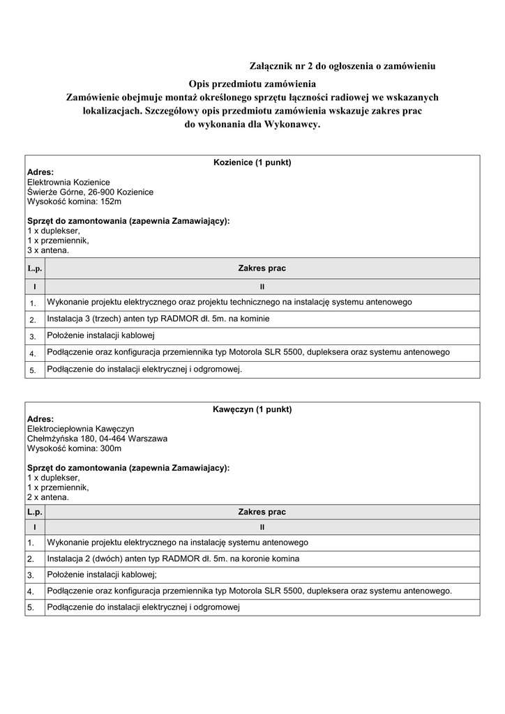 Załącznik nr 2 do ogłoszenia o zamówieniu Opis przedmiotu zamówienia Zamówienie obejmuje montaż określonego sprzętu łączności radiowej we wskazanych lokalizacjach. Szczegółowy opis przedmiotu zamówienia wskazuje zakres prac do wykonania dla Wykonawcy. Kozienice (1 punkt) Adres: Elektrownia Kozienice Świerże Górne, 26-900 Kozienice Wysokość komina: 152m Sprzęt do zamontowania (zapewnia Zamawiający): 1 x duplekser, 1 x przemiennik, 3 x antena. L.p. Zakres prac I II 1. Wykonanie projektu elektrycznego oraz projektu technicznego na instalację systemu antenowego 2. Instalacja 3 (trzech) anten typ RADMOR dł. 5m. na kominie 3. Położenie instalacji kablowej 4. Podłączenie oraz konfiguracja przemiennika typ Motorola SLR 5500, dupleksera oraz systemu antenowego 5. Podłączenie do instalacji elektrycznej i odgromowej. Kawęczyn (1 punkt) Adres: Elektrociepłownia Kawęczyn Chełmżyńska 180, 04-464 Warszawa Wysokość komina: 300m Sprzęt do zamontowania (zapewnia Zamawiajacy): 1 x duplekser, 1 x przemiennik, 2 x antena. L.p. Zakres prac I II 1. Wykonanie projektu elektrycznego na instalację systemu antenowego 2. Instalacja 2 (dwóch) anten typ RADMOR dł. 5m. na koronie komina 3. Położenie instalacji kablowej; 4. Podłączenie oraz konfiguracja przemiennika typ Motorola SLR 5500, dupleksera oraz systemu antenowego. 5. Podłączenie do instalacji elektrycznej i odgromowej Punkty Alarmowe (30 punktów) Adres: teren m. st. Warszawy (adresy Punktów Alarmowych Zamawiający przekaże Wykonawcy jako załącznik do Umowy) Sprzęt do zamontowania (zapewnia Zamawiający): 30 x dookólna antena bazowa (1 sztuka = 1 Punkt Alarmowy) L.p. Zakres prac I II 1. Transport nowej anteny na dach budynku 2. Demontaż starej anteny - odkręcenie uchwytów mocujących antenę od stałej części budynku 3. Odpięcie kabla antenowego 4. Montaż nowej anteny - przymocowanie anteny do stałej części budynku 5. Doczepienie kabla antenowego do nowej anteny 6. Sprawdzenie sprawności systemu antenowego za pomocą miernika SWR - współczynnika fali stojącej 7. Zniesienie starej anteny z dachu budynku 8. Przestrojenie Punktu Alarmowego 9. Sprawdzenie sprawności Punktu Alarmowego ……………………………....………….. (podpis)