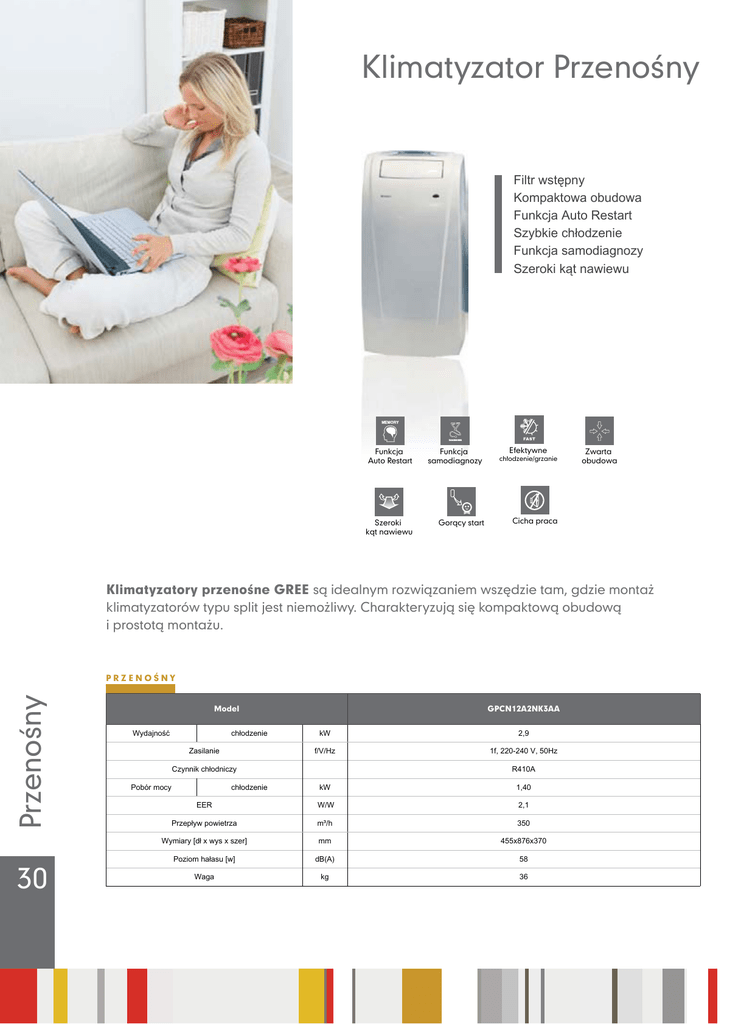 Klimatyzator Przenośny Filtr wstępny Kompaktowa obudowa Funkcja Auto Restart Szybkie chłodzenie Funkcja samodiagnozy Szeroki kąt nawiewu Funkcja Auto Restart Funkcja samodiagnozy Szeroki kąt nawiewu Gorący start Efektywne chłodzenie/grzanie Zwarta obudowa Cicha praca Klimatyzatory przenośne GREE są idealnym rozwiązaniem wszędzie tam, gdzie montaż klimatyzatorów typu split jest niemożliwy. Charakteryzują się kompaktową obudową i prostotą montażu. Przenośny PRZENOśNY 30 Model Wydajność chłodzenie Zasilanie GPCN12A2NK3AA kW 2,9 f/V/Hz 1f, 220-240 V, 50Hz Czynnik chłodniczy Pobór mocy chłodzenie R410A kW 1,40 EER W/W 2,1 Przepływ powietrza m³/h 350 Wymiary [dł x wys x szer] mm 455x876x370 Poziom hałasu [w] dB(A) 58 Waga kg 36