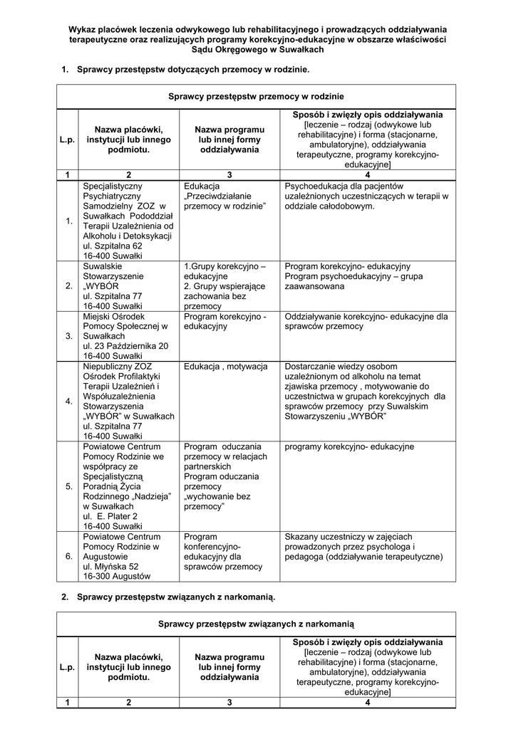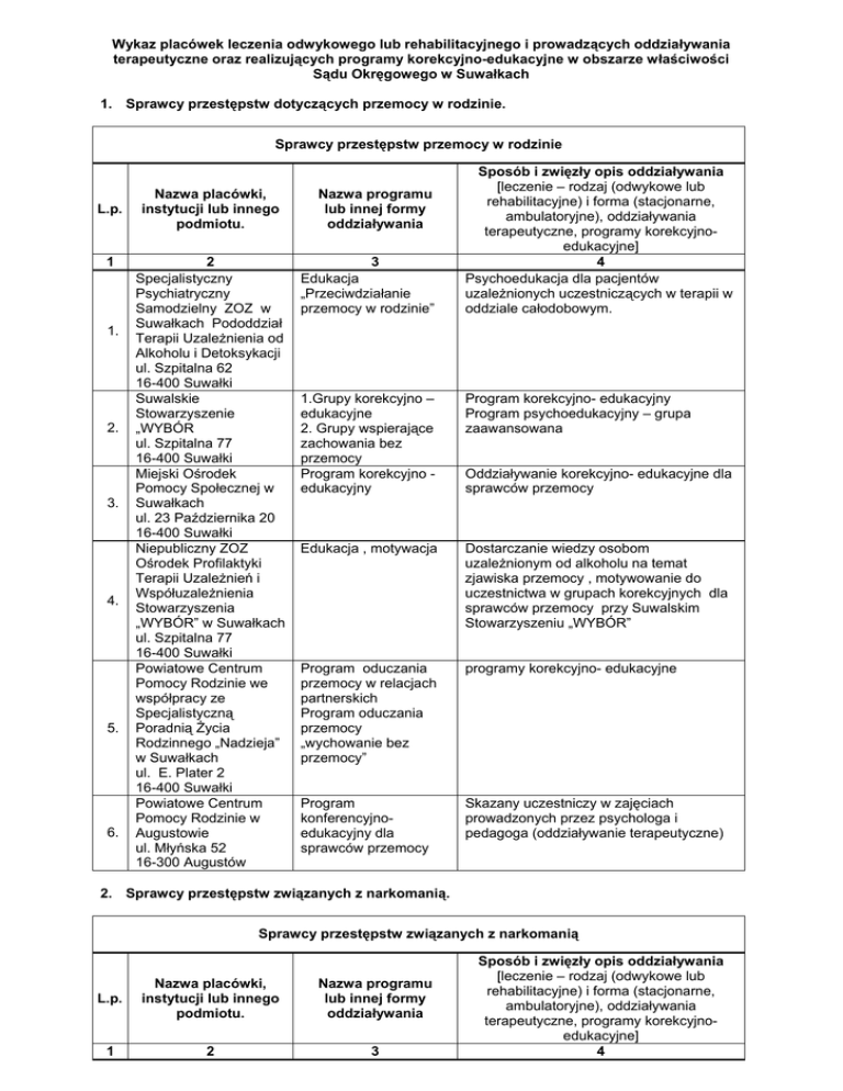 Wykaz placówek leczenia odwykowego lub rehabilitacyjnego i prowadzących oddziaływania terapeutyczne oraz realizujących programy korekcyjno-edukacyjne w obszarze właściwości Sądu Okręgowego w Suwałkach 1. Sprawcy przestępstw dotyczących przemocy w rodzinie. Sprawcy przestępstw przemocy w rodzinie L.p. 1 1. 2. 3. 4. 5. 6. Nazwa placówki, instytucji lub innego podmiotu. 2 Specjalistyczny Psychiatryczny Samodzielny ZOZ w Suwałkach Pododdział Terapii Uzależnienia od Alkoholu i Detoksykacji ul. Szpitalna 62 16-400 Suwałki Suwalskie Stowarzyszenie „WYBÓR ul. Szpitalna 77 16-400 Suwałki Miejski Ośrodek Pomocy Społecznej w Suwałkach ul. 23 Października 20 16-400 Suwałki Niepubliczny ZOZ Ośrodek Profilaktyki Terapii Uzależnień i Współuzależnienia Stowarzyszenia „WYBÓR” w Suwałkach ul. Szpitalna 77 16-400 Suwałki Powiatowe Centrum Pomocy Rodzinie we współpracy ze Specjalistyczną Poradnią Życia Rodzinnego „Nadzieja” w Suwałkach ul. E. Plater 2 16-400 Suwałki Powiatowe Centrum Pomocy Rodzinie w Augustowie ul. Młyńska 52 16-300 Augustów Nazwa programu lub innej formy oddziaływania 3 Edukacja „Przeciwdziałanie przemocy w rodzinie” Sposób i zwięzły opis oddziaływania [leczenie – rodzaj (odwykowe lub rehabilitacyjne) i forma (stacjonarne, ambulatoryjne), oddziaływania terapeutyczne, programy korekcyjnoedukacyjne] 4 Psychoedukacja dla pacjentów uzależnionych uczestniczących w terapii w oddziale całodobowym. 1.Grupy korekcyjno – edukacyjne 2. Grupy wspierające zachowania bez przemocy Program korekcyjno edukacyjny Program korekcyjno- edukacyjny Program psychoedukacyjny – grupa zaawansowana Edukacja , motywacja Dostarczanie wiedzy osobom uzależnionym od alkoholu na temat zjawiska przemocy , motywowanie do uczestnictwa w grupach korekcyjnych dla sprawców przemocy przy Suwalskim Stowarzyszeniu „WYBÓR” Program oduczania przemocy w relacjach partnerskich Program oduczania przemocy „wychowanie bez przemocy” programy korekcyjno- edukacyjne Program konferencyjnoedukacyjny dla sprawców przemocy Skazany uczestniczy w zajęciach prowadzonych przez psychologa i pedagoga (oddziaływanie terapeutyczne) Oddziaływanie korekcyjno- edukacyjne dla sprawców przemocy 2. Sprawcy przestępstw związanych z narkomanią. Sprawcy przestępstw związanych z narkomanią L.p. Nazwa placówki, instytucji lub innego podmiotu. Nazwa programu lub innej formy oddziaływania 1 2 3 Sposób i zwięzły opis oddziaływania [leczenie – rodzaj (odwykowe lub rehabilitacyjne) i forma (stacjonarne, ambulatoryjne), oddziaływania terapeutyczne, programy korekcyjnoedukacyjne] 4 1. 2. Specjalistyczny Psychiatryczny Samodzielny ZOZ w Suwałkach Poradnia Leczenia Uzależnień od Substancji Psychoaktywnych ul. Szpitalna 62 16-400 Suwałki Poradnia Terapii Uzależnień w Augustowie ul. Szpitalna 12A 16-300 Augustów Leczenie uzależnień ambulatoryjnie -sesje terapii indywidualnej i grupowej dla osób uzależnionych i wspóluzależnionych Terapia Oddziaływania terapeutyczne(skazany uczestniczy w terapii indywidualnej lub zbiorowej – leczenie ambulatoryjne) 3. Sprawcy przestępstw związanych z alkoholizmem. Sprawcy przestępstw związanych z alkoholizmem L.p. 1 1. 2. 3. 4. 5. Nazwa placówki, instytucji lub innego podmiotu. 2 Specjalistyczny Psychiatryczny Samodzielny ZOZ w Suwałkach Pododdział Terapii Uzależnienia od Alkoholu i Detoksykacji ul. Szpitalna 62 16-400 Suwałki Specjalistyczny Psychiatryczny Samodzielny ZOZ w Suwałkach Poradnia Leczenia Uzależnienia i Współuzależnienia od Alkoholu ul. Szpitalna 62 16-400 Suwałki Niepubliczny ZOZ Ośrodek Profilaktyki Terapii Uzależnień i Współuzależnienia Stowarzyszenia „WYBÓR” w Suwałkach ul. Szpitalna 77 16-400 Suwałki Suwalskie Stowarzyszenie „WYBÓR ul. Szpitalna 77 16-400 Suwałki Poradnia Terapii Uzależnień w Augustowie ul. Szpitalna 12A 16-300 Augustów Nazwa programu lub innej formy oddziaływania 3 Edukacja, „Przeciwdziałanie przemocy w rodzinie” Sposób i zwięzły opis oddziaływania [leczenie – rodzaj (odwykowe lub rehabilitacyjne) i forma (stacjonarne, ambulatoryjne), oddziaływania terapeutyczne, programy korekcyjnoedukacyjne] 4 Psychoterapia indywidualna Konfrontacje Leczenie ambulatoryjne Terapia indywidualna i grupowa Psychoterapia dla osób uzależnionych i wspóluzależnionych terapia Terapia dzienna uzależnienia od alkoholu Program z Duluth Program zintegrowany Program korekcyjno-edukacyjny Program wspierający zachowania bez przemocy i bez uzależnień Terapia Leczenie ambulatoryjne (skazany uczestniczy w terapii) 4. Sprawcy przestępstw przeciwko bezpieczeństwu w ruchu drogowym. Sprawcy przestępstw przeciwko bezpieczeństwu w ruchu drogowym L.p. Nazwa placówki, Nazwa programu Sposób i zwięzły opis oddziaływania instytucji lub innego podmiotu. 1 1. 2. 3. 4. 2 Specjalistyczny Psychiatryczny Samodzielny ZOZ w Suwałkach Pododdział Terapii Uzależnienia od Alkoholu i Detoksykacji ul. Szpitalna 62 16-400 Suwałki Niepubliczny ZOZ Ośrodek Profilaktyki Terapii Uzależnień i Współuzależnienia Stowarzyszenia „WYBÓR” w Suwałkach ul. Szpitalna 77 16-400 Suwałki Terapeuta z Poradni Leczenia Uzależnienia i Współuzależnienia od Alkoholu SPS ZOZ w Suwałkach Poradnia Terapii Uzależnień w Augustowie ul. Szpitalna 12A 16-400 Suwałki lub innej formy oddziaływania 3 Edukacja [leczenie – rodzaj (odwykowe lub rehabilitacyjne) i forma (stacjonarne, ambulatoryjne), oddziaływania terapeutyczne, programy korekcyjnoedukacyjne] 4 Psychoterapia Elementy oddziaływań konfrontujących. Edukacja Dostarczanie wiedzy osobom uzależnionym od alkoholu Program psychokorekcyjny dla kierowców Psychoedukacja Program psychologicznokorekcyjny dla kierowników sprawców wypadków Skazany uczestniczy w programie realizowanym z udziałem psychologa. 5. Sprawcy przestępstw z użyciem przemocy. Sprawcy przestępstw z użyciem przemocy L.p. 1 1. 2. 3. Nazwa placówki, instytu