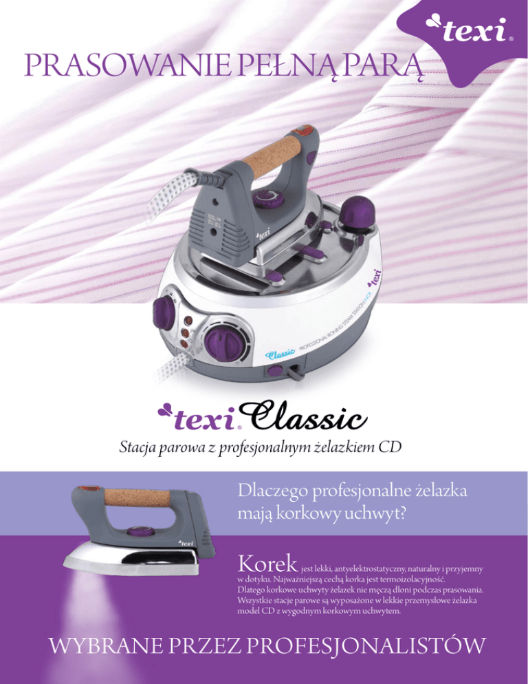 prasowanie pełną parą Classic Stacja parowa z profesjonalnym żelazkiem CD Dlaczego profesjonalne żelazka mają korkowy uchwyt? Korek jest lekki, antyelektrostatyczny, naturalny i przyjemny w dotyku. Najważniejszą cechą korka jest termoizolacyjność. Dlatego korkowe uchwyty żelazek nie męczą dłoni podczas prasowania. Wszystkie stacje parowe są wyposażone w lekkie przemysłowe żelazka model CD z wygodnym korkowym uchwytem. wybrane przez profesjonalistów Classic Stacja parowa z profesjonalnym żelazkiem CD Generator pary Texi Classic z żelazkiem CD został zaprojektowany do prasowania w atelier krawieckim, sklepie odzieżowym, hotelu i domu. Wysoka jakość pary i profesjonalne, lekkie, ergonomiczne żelazko pozwalają prasować z przemysłową wydajnością i minimalnym wysiłkiem. Można prasować klasycznie na stole do prasowania, a także odparowywać odzież na wisząco. Profesjonalne żelazko prasuje w każdej pozycji bez ryzyka poplamień. Korkowy uchwyt żelazka jest przyjemny w dotyku, nie nagrzewa się jak plastik, nie męczy dłoni. Do generatorów pary texi można stosować wodę z kranu, jednakże podczas intensywnej eksploatacji woda zmiękczona przedłuży bezobsługową pracę urządzenia. silikonowe podkładki żelazka płynna regulacja ilości pary i wybór funkcji pracy automatyczne zwijanie przewodu kontrolka braku wody Texi Classic napięcie moc profesjo- boiler automat. nalne płynna zwijanie ciśnienie żelazko stal regulacja woda pary nierdze- ilości pary z kranu przetexi wodu wna CD 220 V 2.100 W 3,5 bara - 240 V ✓ ✓ ✓ ✓ ✓ waga w kartonie wymiary kartonu 5,1 kg 38,0 x 30,5 x 27,0 cm CD IRON PTFE SHOE Wszystkim, którzy chcą prasować bezpiecznie i bez wysiłku, polecamy używanie stopy texi. Stopa przeciwpołyskowa PTFE chroni materiał przed wyświeceniem i przypaleniem, podnosi jakość pary, gwarantuje gładkość prasowania i równomierne rozproszenie pary. Chroni stopę żelazka. sprzedaż w internecie atelier Producent zastrzega sobie prawo do wprowadzania, bez uprzedzenia, zmian parametrów technicznych, wyposażenia i specyfikacji oferowanych urządzeń. sklep dom