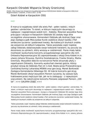 Karpacki Ośrodek Wsparcia Straży Granicznej Źródło: http://www.kow.strazgraniczna.pl/kar/aktualnosci/10528,Dzien-Kobiet-w-Karpackim-OSG.html Wygenerowano: Czwartek, 2 marca 2017, 11:58 Dzień Kobiet w Karpackim OSG Autor: 8 marca to wyjątkowy dzień dla wielu Pań - pełen radości, miłych gestów i uśmiechów. To dzień, w którym mężczyźni doceniają co najlepsze i najpiękniejsze wokół nich – Kobiety. Również wszystkie Panie pracujące i służące w Karpackim Oddziale SG zostały tego dnia szczególnie uhonorowane. Komendant Oddziału płk Andrzej Zając oraz jego Zastępca ppłk Mieczysław Kurek osobiście złożyli każdej z Pań serdeczne życzenia i podarowali kwiaty. Na kobiecych biurkach zrobiło się wiosennie od żółtych tulipanów. Także pozostała część męskiej załogi Oddziału obdarowywała swoje koleżanki kwiatami, by poczuły się docenione za uśmiech, który wnoszą w codzienność. Panie miały także możliwość wysłuchania koncertu przygotowanego specjalnie dla nich. Orkiestra Reprezentacyjna SG zaprezentowała z okazji Dnia Kobiet m.in. utwory Johana Straussa, Dymitra Szostakowicza, Franka Sinatry, Marka Grechuty. Wszystkie obecne na koncercie Panie otrzymały płyty z repertuarem Orkiestry. Koncertu wysłuchali również goście, którzy przybyli dzisiaj do Oddziału Pani dr n.med. Beata Janas Przewodnicząca Centralnej Komisji Lekarskiej MSWiA oraz gen.bryg. Marek Borkowski Zastępca Komendanta Głównego SG. W trakcie koncertu gen.bryg. Marek Borkowski złożył wszystkim Paniom życzenia, by zawsze były traktowane przez mężczyzn tak, jak na to zasługują – z najwyższym szacunkiem. Na zakończenie koncertu Panowie zaśpiewali Paniom „100 lat”. >>> GALERIA ZDJĘĆ <<< 8 marca to wyjątkowy dzień dla wielu Pań - pełen radości, miłych gestów i uśmiechów. To dzień, w którym mężczyźni doceniają co najlepsze i najpiękniejsze wokół nich – Kobiety. Również wszystkie Panie pracujące i służące w Karpackim Oddziale SG zostały tego dnia szczególnie uhonorowane. Komendant Oddziału płk Andrzej Zając oraz jego Zastępca ppłk Mieczysław Kurek osobiście złożyli każdej z Pań serdeczne życzenia i podarowali kwiaty. Na kobiecych biurkach zrobiło się wiosennie od żółtych tulipanów. Także pozostała część męskiej załogi Oddziału obdarowywała swoje koleżanki kwiatami, by poczuły się docenione za uśmiech, który wnoszą w codzienność. Panie miały także możliwość wysłuchania koncertu przygotowanego specjalnie dla nich. Orkiestra Reprezentacyjna SG zaprezentowała z okazji Dnia Kobiet m.in. utwory Johana Straussa, Dymitra Szostakowicza, Franka Sinatry, Marka Grechuty. Wszystkie obecne na koncercie Panie otrzymały płyty z repertuarem Orkiestry. Koncertu wysłuchali również goście, którzy przybyli dzisiaj do Oddziału Pani dr n.med. Beata Janas Przewodnicząca Centralnej Komisji Lekarskiej MSWiA oraz gen.bryg. Marek Borkowski Zastępca Komendanta Głównego SG. W trakcie koncertu gen.bryg. Marek Borkowski złożył wszystkim Paniom życzenia, by zawsze były traktowane przez mężczyzn tak, jak na to zasługują – z najwyższym szacunkiem. Na zakończenie koncertu Panowie zaśpiewali Paniom „100 lat”. >>> GALERIA ZDJĘĆ <<<