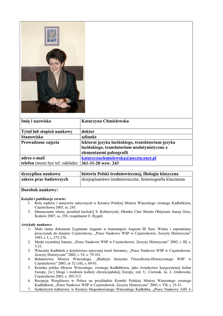 Imię i nazwisko Katarzyna Chmielewska Tytuł lub stopień naukowy Stanowisko Prowadzone zajęcia doktor adiunkt lektorat języka łacińskiego, translatorium języka łacińskiego, translatorium neolatynistyczne z elementanmi paleografii adres e-mail [email protected] telefon (może być tel. zakładu) 361-31-20 wew. 243 dyscyplina naukowa zakres prac badawczych historia Polski średniowiecznej, filologia klasyczna dziejopisarstwo średniowieczne, historiografia klasztorna Dorobek naukowy: Książki i publikacje zwarte: 1. Rola wątków i motywów antycznych w Kronice Polskiej Mistrza Wincentego zwanego Kadłubkiem, Częstochowa 2003, ss. 245. 2. [tłumaczenie tekstu, przekład łaciński] S. Kobierzycki, Obsidio Clari Montis Oblężenie Jasnej Góry, Kraków 2007, ss. 258. (współautor E. Rygał) Artykuły naukowe: 1. Mało znany dokument Zygmunta Augusta w transumpcie Augusta III Sasa. Ważny i zapomniany przyczynek do dziejów Częstochowy, „Prace Naukowe WSP w Częstochowie. Zeszyty Historyczne” 1993, t. I, s. 273-276. 2. Maski rzymskiej Junony, „Prace Naukowe WSP w Częstochowie. Zeszyty Historyczne” 2002, t. III, s. 5-21. 3. Wincenty Kadłubek a dziedzictwo antycznej teorii literatury, „Prace Naukowe WSP w Częstochowie. Zeszyty Historyczne” 2002, t. VI, s. 79-101. 4. Bohaterowie Mistrza Wincentego, „Biuletyn Instytutu Filozoficzno-Historycznego WSP w Częstochowie” 2003, nr 32 (10), s. 69-81. 5. Kronika polska Mistrza Wincentego, zwanego Kadłubkiem, jako świadectwo koegzystencji kultur Europy, [w:] Drogi i rozdroża kultury chrześcijańskiej Europy, red. U. Cierniak, ks. J. Grabowski, Częstochowa 2003, s. 305-312. 6. Recepcja Wergiliusza w Polsce na przykładzie Kroniki Polskiej Mistrza Wincentego zwanego Kadłubkiem, „Prace Naukowe WSP w Częstochowie. Zeszyty Historyczne” 2003, t. VII, s. 25-31. 7. Synkretyzm kulturowy w Kronice błogosławionego Wincentego Kadłubka, „Prace Naukowe AJD w 8. 9. 10. 11. 12. 13. 14. 15. 16. 17. 18. 19. 20. 21. 22. 23. 24. Częstochowie. Zeszyty Historyczne” 2006, t. IX, s. 337-347. Ideologia i literatura w Kronice Polskiej Mistrza Wincentego, zwanego Kadłubkiem, [w:] Piśmiennictwo pragmatyczne w Polsce do końca XVIII wieku, red. J. Gancewski, A. Wałkówski, Ostróda 2007, s. 77-85. Recepcja rzymskiej literatury antycznej w Kronice polskiej Mistrza Wincentego, [w:] Onus Athlanteum. Studia nad Kroniką biskupa Wincentego, red. A. Dąbrówka, W. Wojtowicz, Warszawa 2009, s. 215-230. „Maćkowo” opata Macieja Heringa. Na marginesie „Kroniki NMP na Piasku”, „Prace Naukowe AJD w Częstochowie. Zeszyty Historyczne” 2009, t. X, s. 64-70. Dwoistość tradycji antycznych w Kronice polskiej Mistrza Wincentego zwanego Kadłubkiem, [w:] Częstochowskie Teki Historyczne, t. I, red M. Trąbski, N. Morawiec, R. W. Szwed, Częstochowa 2010, s. 27-38. Obraz Krakowa w Kronice polskiej Mistrza Wincentego zwanego Kadłubkiem, [w:] Obrazy stolic w piśmiennictwie polskim, red A. Tyszka, Łódź 2010, s.167-173. Et paciebantur pauperes defectum magnum. Bieda w śląskich średniowiecznych kronikach kanoników regularnych, [w:] Zbytek i ubóstwo w starożytności i średniowieczu, red. L. Kostuch, K. Ryszewska, Kielce, 2010, s.345-356. Postać biskupa w kronikach klasztorów kanoników regularnych w Kłodzku i na wrocławskim Piasku, [w:] Duchowieństwo i laicy, red. A. Wałkówski, Warszawa 2010, s. 81-92. Między chęcią a zakazem. Trudy kierowania klasztorem w czasie konfliktów miedzy władzą świecką a kościelną w relacjach średniowiecznych kronik śląskich, [w:] W poszukiwaniu prawdy. Chrześcijańska Europa między wiarą a polityką, red. U Cierniak, A. Szyndler, Częstochowa 2010, t.2, s. 111-122. „Ad laudem bonorum et vindicandam malorum” – o powodach spisania śląskich średniowiecznych kronik kanoników regularnych, [w:] Klio viae et invia. Opuscula Marco Cetwiński dedicata, red. A. Odrzywolska-Kidawa, Warszawa 2010, s. 589-600. Bibliografia prac prof. dr hab. Marka Cetwińskiego za lata 1968-2010, (zestawienie), [w:] Klio viae et invia. Opuscula Marco Cetwiński dedicata, red. A. Odrzywolska-Kidawa, Warszawa 2010, s. XVIIXXXIV. Krak i jego potomstwo. Jak Jan Długosz zmieniał opowieść Mistrza Wincentego, „Zeszyty Długoszowskie”, 2011, nr X, s. 53-62 Alter Alexander, alter Cato, Tullius alter. O zabiegach językowych średniowiecznych kronikarzy, [w:] Zjawisko nobilitacji i deprecjacji w języku. Słowa i teksty, red. R. Bizior, D. Suska, Częstochowa 2012, s. 191-206. Dzieckiem w kolebce kto łeb urwał Hydrze.... Motyw heroicznego dzieciństwa w mitologii starożytnych Greków i Rzymian, [w:] Dziecko II, red. E. Lewik-Tsirigotis, G. Pietruszewska-Kobiela, Z. Włodarczyk, Wieluń 2012, s. 13-26. Śląscy kanonicy regularni wobec konfliktów zbrojnych. Wojsko i wojna w średniowiecznych kronikach klasztornych, [w:] Kościół i społeczeństwo. Studia nad obiegiem informacji i konfliktami zbrojnymi w dawnych i nowych wiekach, red. J. Grabowski, Warszawa 2012 (rzeczywisty rok wydania: 2013), s. 195-208. O pożytkach z donosu - trudne losy reformy w klasztorze kanoników kłodzkich, [w:] Kościół i społeczeństwo. Studia nad obiegiem informacji i konfliktami zbrojnymi w dawnych i nowych wiekach, red. J. Grabowski, Warszawa 2012 (rzeczywisty rok wydania: 2013), s. 51-62. Nos divine providencie cuncta tribuimus – sakralne funkcje średniowiecznych kronik, [w:] Piśmiennictwo sakralne w dziejach Polski do końca XVIII wieku na tle powszechnym, red. St. Bułajewski, J. Gancewski, A. Wałkówski, Józefów 2012 (rzeczywisty rok wydania: 2013), s. 159-170. Bezpieczeństwo w klasztorze. Bóg gwarantem bezpieczeństwa zakonników, [w:] Si vis pacem, para bellum. Bezpieczeństwo i polityka Polski. Księga jubileuszowa ofiarowana profesorowi Tadeuszowi Dubickiemu, red. R. Majzner, Częstochowa-Włocławek 2013, s. 1051-1060. Artykuły recenzyjne: 1. Ewa A. Mądrowska, Domini naturales. Portrety pols