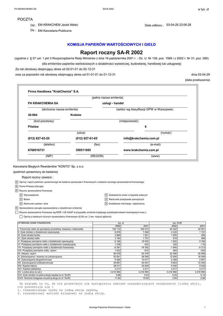 FH KRAKCHEMIA SA SA-R 2002 w tys. zł POCZTA Od : EM KRAKCHEM Jacek Malec Data odbioru : 03-04-29 23:06:28 Do : EM Kancelaria Publiczna KOMISJA PAPIERÓW WARTOŚCIOWYCH I GIEŁD Raport roczny SA-R 2002 (zgodnie z § 57 ust. 1 pkt 3 Rozporządzenia Rady Ministrów z dnia 16 października 2001 r. - Dz. U. Nr 139, poz. 1569 i z 2002 r. Nr 31, poz. 280) (dla emitentów papierów wartościowych o działalności wytwórczej, budowlanej, handlowej lub usługowej) Za rok obrotowy obejmujący okres od 02-01-01 do 02-12-31 oraz za poprzedni rok obrotowy obejmujący okres od 01-01-01 do 01-12-31 dnia 03-04-29 (data przekazania) Firma Handlowa "KrakChemia" S.A. (pełna nazwa emitenta) FH KRAKCHEMIA SA usługi - handel (skrócona nazwa emitenta) 30-964 (sektor wg klasyfikacji GPW w Warszawie) Kraków (kod pocztowy) (miejscowość) Pilotów 6 (ulica) (012) 627-63-20 (numer) (012) 627-61-65 (telefon) 6760016731 [email protected] (fax) (e-mail) 350511695 (NIP) www.krakchemia.com.pl (REGON) (www) Kancelaria Biegłych Rewidentów "KONTO" Sp. z o.o. (podmiot uprawniony do badania) Raport roczny zawiera : X Opinię i raport podmiotu uprawnionego do badania sprawozda ń finansowych z badania rocznego sprawozdania finansowego X Pismo Prezesa Zarządu X Roczne sprawozdanie finansowe X Wprowadzenie X Zestawienie zmian w kapitale własnym X Bilans X Rachunek przepływów pieniężnych X Rachunek zysków i strat X Dodatkowe informacje i objaśnienia X Sprawozdanie zarządu (sprawozdanie z działalności emitenta) Roczne sprawozdanie finansowe wg MSR / US GAAP w przypadku emitenta będącego przedsiębiorstwem leasingowym wraz z Opinią o badanym rocznym sprawozdaniu finansowym (§ 59 ust. 2 ww. rozporz ądzenia) WYBRANE DANE FINANSOWE I. Przychody netto ze sprzedaży produktów, towarów i materiałów II. Zysk (strata) z działalności operacyjnej III. Zysk (strata) brutto IV. Zysk (strata) netto V. Przepływy pieniężne netto z działalności operacyjnej VI. Przepływy pieniężne netto z działalności inwestycyjnej VII. Przepływy pieniężne netto z działalności finansowej VIII. Przepływy pieniężne netto, razem IX. Aktywa, razem X. Zobowiązania i rezerwy na zobowiązania XI. Zobowiązania długoterminowe XII. Zobowiązania krótkoterminowe XIII. Kapitał własny XIV. Kapitał zakładowy XV. Liczba akcji (w szt.) XVI. Zysk (strata) na jedną akcję zwykłą (w zł / EUR) XVIII. Wartość księgowa na jedną akcję (w zł / EUR) tys. zł 2002 156 110 8 976 3 889 3 164 6 166 1 238 -6 381 1 023 90 078 52 061 9 280 39 891 38 017 3 217 3 216 990 0,98 11,82 2001 156 573 7 268 1 821 1 707 18 905 -425 -19 392 -912 93 378 58 569 10 917 45 037 34 809 3 217 3 216 990 0,53 10,82 tys. EUR 2002 40 342 2 320 1 005 818 1 593 320 -1 649 264 22 406 12 950 2 308 9 923 9 456 3 217 3 216 990 0,25 2,94 2001 42 901 1 191 499 468 5 180 -116 -5 313 -250 25 586 16 048 2 991 12 340 9 538 3 217 3 216 990 0,14 2,96 Ze względu na to, że nie przewiduje się wystąpienia zdarzeń uzasadniających zwiększenie liczby akcji, nie prezentuje się : 1. rozwodnionego zysku na jedną akcję zwykłą, 2. rozwodnionej wartość księgowej na jedną akcję. Komisja Papierów Wartościowych i Giełd 1 FH KRAKCHEMIA SA SA-R 2002 w tys. zł OPINIA PODMIOTU UPRAWNIONEGO DO BADANIA SPRAWOZDAŃ FINANSOWYCH O BADANYM ROCZNYM SPRAWOZDANIU FINANSOWYM OPINIA NIEZALEŻNEGO BIEGŁEGO REWIDENTA Dla Walnego Zgromadzenia Akcjonariuszy Firmy Handlowej “KrakChemia" S.A. 30-964 Kraków ul. Pilotów 6 Przeprowadziliśmy badanie załączonego sprawozdania finansowego Firmy Handlowej “KrakChemia" S.A. z siedzibą 30-964 Kraków ul. Pilotów 6, na które składa się : 1) wprowadzenie do sprawozdania finansowego; 2) bilans sporządzony na dzień 31 grudnia 2002 r, który po stronie aktywów i pasywów zamyka się sumą 90 077 558,14 zł. 3) rachunek zysków i strat za rok obrotowy od 01 stycznia 2002 roku do 31 grudnia 2002 r. wykazujący zysk netto w wysokości 3 163 703,28 zł 4) zestawienie zmian w kapitale własnym za rok obrotowy od 01 stycznia 2002 roku do 31 grudnia 2002 r. wykazujący wzrost kapitału własnego o kwotę 3 207 905,28 zł. 5) rachunek przepływów pieniężnych za rok obrotowy od 01 stycznia 2002 roku do 31 grudnia 2002 r. wykazujący zwiększenie stanu środków pieniężnych o kwotę 1 023 052,92 zł 6) dodatkowe informacje i objaśnienia. Zgodnie z art. 52 ust.1 znowelizowanej ustawy o rachunkowości za sporządzenie tego sprawozdania finansowego odpowiada Zarząd Spółki Firmy Handlowej “KrakChemia" S.A. Naszym zadaniem było zbadanie i wyrażenie opinii o rzetelności, prawidłowości i jasności tego sprawozdania finansowego oraz prawidłowości ksiąg rachunkowych stanowiących podstawę jego sporządzenia. Badanie sprawozdania finansowego przeprowadziliśmy stosownie do postanowień : 1 rozdziału 7 ustawy z dnia 29 września 1994 r. o rachunkowości (Dz.U. z 2002 r. Nr.76 poz.964), Komisja Papierów Wartościowych i Giełd 2 FH KRAKCHEMIA SA SA-R 2002 w tys. zł 2) norm wykonywania zawodu biegłego rewidenta, wydanych przez Krajową Radę Biegłych Rewidentów w Polsce. 3) Kodeksu spółek handlowych. Badanie sprawozdania finansowego zaplanowaliśmy i przeprowadziliśmy w taki sposób, aby uzyskać racjonalną pewność, pozwalającą na wyrażenie opinii o sprawozdaniu. W szczególności badanie obejmowało sprawdzenie poprawności zastosowanych przez jednostkę zasad (polityki) rachunkowości i znaczących szacunków, sprawdzenie w przeważającej mierze w sposób wyrywkowy - dowodów i zapisów księgowych, z których wynikają liczby i informacje zawarte w sprawozdaniu finansowym, jak i całościową ocenę sprawozdania finansowego. Uważamy, że badanie dostarczyło wystarczającej podstawy do wyrażenia miarodajnej opinii. Naszym zdaniem, zbadane sprawozdanie finansowe, obejmujące dane liczbowe i objaśnienia słowne: a) przedstawia rzetelnie i jasno wszystkie informacje istotne dla oceny sytuacji majątkowej i finans