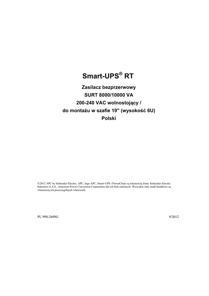 Smart-UPS® RT Zasilacz bezprzerwowy SURT 8000/10000 VA 200-240 VAC wolnostojący / do montażu w szafie 19'' (wysokość 6U) Polski ©2012 APC by Schneider Electric. APC, logo APC, Smart-UPS i PowerChute są własnością firmy Schneider Electric Industries S.A.S., American Power Conversion Corporation lub ich firm zależnych. Wszystkie inne znaki handlowe są własnością ich poszczególnych właścicieli. PL 990-2689G 9/2012 Wstęp APC® by Schneider Electric Smart-UPS® RT to wysokowydajny zasilacz bezprzerwowy (ang. uninterruptible power supply, UPS) zabezpieczający urządzenia elektroniczne przed całkowitymi zanikami lub długotrwałymi spadkami napięcia w sieci zasilającej, krótkotrwałymi spadkami napięcia i przepięciami. Zasilacz UPS eliminuje niewielkie wahania napięcia oraz pozwala na odseparowanie sprzętu elektronicznego od większych wahań napięcia poprzez automatyczne odłączenie sprzętu od sieci zasilającej. Pozwala także na kontynuowanie pracy zasilanego sprzętu poprzez zasilanie z akumulatora wewnętrznego aż do chwili przywrócenia stabilnego zasilania lub do całkowitego rozładowania akumulatora. INSTALACJA Przed przystąpieniem do instalacji należy zapoznać się z arkuszem zawierającym instrukcje bezpieczeństwa. Rozpakowanie Należy sprawdzić zasilacz przy odbiorze. W razie stwierdzenia uszkodzeń należy powiadomić przewoźnika i sprzedawcę. Opakowanie nadaje się do przerobu wtórnego; należy je zachować do ponownego użycia lub usunąć w sposób zgodny z przepisami. Należy sprawdzić zawartość opakowania, w którym powinny się znajdować: zasilacz UPS (z odłączonymi akumulatorami) dwa panele przednie komplet dokumentacji zawierający: tylko modele XLT/XLTW: płytę CD z oprogramowaniem płytę CD z podręcznikami użytkownika zasilacza Smart-UPS RT tylko model XLI: sześć wyjściowych kabli zasilających kabel szeregowy dokumentację produktu, instrukcję bezpieczeństwa i informacje o gwarancji dokumentację karty zarządzającej Network Management Card Wyjmowanie akumulatorów Zasilacz jest ciężki. Aby zmniejszyć ciężar zasilacza, należy wyjąć akumulatory. Instrukcje rozpakowywania zamieszczono na kartonie, w którym dostarczone zostało urządzenie. Dane techniczne TEMPERATURA od 0° do 40°C od -15 do 45°C akumulator zasilacza UPS ładować co sześć miesięcy Urządzenie przeznaczone jest do użytku w pomieszczeniach zamkniętych. Podłoże w miejscu instalacji musi być odpowiednio wytrzymałe. EKSPLOATACJA PRZECHOWYWANIE 3000 m 15000 m WILGOTNOŚĆ wilgotność względna od 0% do 95%, bez kondensacji Nie należy używać zasilacza w pomieszczeniach zapylonych lub takich, w których temperatura i wilgotność nie spełniają podanych wymogów. EKSPLOATACJA PRZECHOWYWANIE MAKSYMALNA WYSOKOŚĆ Należy upewnić się, że otwory wentylacyjne z przodu i z tyłu zasilacza nie są zasłonięte. WAGA UPS UPS Z 111 kg 129 kg OPAKOWANIEM 1 Podłączanie do instalacji Podłączenie zasilacza do instalacji elektrycznej musi być wykonane przez elektryka z uprawnieniami. 1. Zainstalować bezpiecznik w obwodzie wejściowym instalacji elektrycznej zgodnie z odpowiednimi normami elektrycznymi (patrz tabele poniżej). 2. WYŁĄCZYĆ (pozycja OFF) bezpiecznik obwodu wejściowego zasilacza (patrz A) oraz bezpieczniki instalacji elektrycznej na wejściu. 3. Zdjąć osłonę zacisków (zob. B). 4. Usunąć okrągłe zaślepki. 5. Poprowadzić przewody przez osłonę zacisków do listew zaciskowych. W pierwszej kolejności poprowadzić przewody do zacisków uziemienia. Instalację należy wykonać zgodnie z obowiązującymi normami elektrycznymi krajowymi i lokalnymi. (Patrz tabele i rysunek.) 6. Użyj odpowiednich przepustów w celu zabezpieczenia mechanicznego wejściowych i wyjściowych przewodów zasilających. MODELE XLT, XLJ I XLTW Połączenie wejściowe Połączenie wyjściowe (opcjonalnie) Podłączyć do zacisków L1, L2 i . Podłączyć do zacisków L1A, L2A i . Model Okablowanie Napięcie Prąd przy pełnym obciążeniu (nominalny) Zabezpieczenie (typowo) Przekrój przewodu (typowo) SURT8000XLJ, SURT8000XLT, SURT8000XLTW SURT10000XLJ, SURT10000XLT, SURT10000XLTW Wejściowe i wyjściowe 200/208/220/240 V 40 A 10mm2* #8 AWG Wejściowe i wyjściowe 200/208/220/240 V XLJ-50 A XLT-48 A XLTW-48 A 50 A / 2-biegunowy, tylko dla okablowania wejściowego 60 A lub 63 A / 2biegunowy tylko dla okablowania wejściowego 16mm2* #6 AWG MODELE XLI Połączenie wejściowe Połączenie wyjściowe (opcjonalnie) Jednofazowe: Podłącz do zacisków L1, N i . Trójfazowe: Podłącz do zacisków L1, L2, L3, N i Podłącz do zacisków L1A, N1 i . . Model Okablowanie Liczba faz Napięcie Prąd przy pełnym obciążeniu (nominalny) Zabezpieczenie (typowo) Przekrój przewodu (typowo) SURT8000XLI Wejście 1 220/230/240 V 40 A 50 A / 2-biegunowy 10mm2* Wejście 3L+N 380/400/415 V 50 A / 4-biegunowy 10mm2* Wyjście 1 220/230/240 V 15 A / fazę podczas pracy normalnej, 40A na L1 w trybie 40 A (nie wymagany) 10mm2* Wejście Wejście 1 3L+N 220/230/240 V 380/400/415 V 63 A / 2-biegunowy 63 A / 4-biegunowy 16mm2* 16mm2* Wyjście 1 220/230/240 V 50 A 18 A / fazę podczas pracy normalnej, 50A na L1 w trybie obejściowym 50 A (nie wymagany) 16mm2* SURT10000XLI * Podano typowe zalecane przekroje przewodów. Rzeczywisty przekrój przewodu musi być zgodny z wymaganą obciążalnością prądową oraz lokalnymi i krajowymi normami i przepisami elektrycznymi. 2 7. Tylko model XLI: W przypadku zasilania trójfazowego, należy ustawić selektor faz zasilania (zob. C) w pozycji oznaczonej „3”. W przypadku zasilania jednofazowego, należy pozostawić przełącznik w pozycji ustawionej fabrycznie: „1”. MODELE XLT/XLJ/XLTW WYJŚCIE L1A L2A WEJŚCIE L1 L2 A B MODEL XLI WYJŚCIE L1A N1 WEJŚCIE L1 L2 A L3 N C B 8. Włączyć bezpieczniki wejsciowe. 9. Sprawdzić napięcia fazowe. 10. Założyć panel dostępu. 3 Instalacja i podłączenie modułów akumulatorowych 