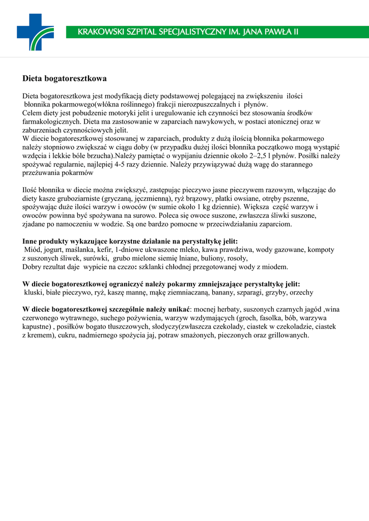 Dieta bogatoresztkowa Dieta bogatoresztkowa jest modyfikacją diety podstawowej polegającej na zwiększeniu ilości błonnika pokarmowego(włókna roślinnego) frakcji nierozpuszczalnych i płynów. Celem diety jest pobudzenie motoryki jelit i uregulowanie ich czynności bez stosowania środków farmakologicznych. Dieta ma zastosowanie w zaparciach nawykowych, w postaci atonicznej oraz w zaburzeniach czynnościowych jelit. W diecie bogatoresztkowej stosowanej w zaparciach, produkty z dużą ilością błonnika pokarmowego należy stopniowo zwiększać w ciągu doby (w przypadku dużej ilości błonnika początkowo mogą wystąpić wzdęcia i lekkie bóle brzucha).Należy pamiętać o wypijaniu dziennie około 2–2,5 l płynów. Posiłki należy spożywać regularnie, najlepiej 4-5 razy dziennie. Należy przywiązywać dużą wagę do starannego przeżuwania pokarmów Ilość błonnika w diecie można zwiększyć, zastępując pieczywo jasne pieczywem razowym, włączając do diety kasze gruboziarniste (gryczaną, jęczmienną), ryż brązowy, płatki owsiane, otręby pszenne, spożywając duże ilości warzyw i owoców (w sumie około 1 kg dziennie). Większa część warzyw i owoców powinna być spożywana na surowo. Poleca się owoce suszone, zwłaszcza śliwki suszone, zjadane po namoczeniu w wodzie. Są one bardzo pomocne w przeciwdziałaniu zaparciom. Inne produkty wykazujące korzystne działanie na perystaltykę jelit: Miód, jogurt, maślanka, kefir, 1-dniowe ukwaszone mleko, kawa prawdziwa, wody gazowane, kompoty z suszonych śliwek, surówki, grubo mielone siemię lniane, buliony, rosoły, Dobry rezultat daje wypicie na czczo: szklanki chłodnej przegotowanej wody z miodem. W diecie bogatoresztkowej ograniczyć należy pokarmy zmniejszające perystaltykę jelit: kluski, białe pieczywo, ryż, kaszę mannę, mąkę ziemniaczaną, banany, szparagi, grzyby, orzechy W diecie bogatoresztkowej szczególnie należy unikać: mocnej herbaty, suszonych czarnych jagód ,wina czerwonego wytrawnego, suchego pożywienia, warzyw wzdymających (groch, fasolka, bób, warzywa kapustne) , posiłków bogato tłuszczowych, słodyczy(zwłaszcza czekolady, ciastek w czekoladzie, ciastek z kremem), cukru, nadmiernego spożycia jaj, potraw smażonych, pieczonych oraz grillowanych. Wybrane produkty spożywcze zalecane(z dużą zawartością błonnika, ułatwiające wypróżnienia) Oraz produkty z mniejszą zawartością błonnika Większa zawartość błonnika Produkt Otręby pszenne Siemię lniane Fasola (nasiona) Jabłka suszone Płatki jęczmienne Śliwki suszone Ryż brązowy Muesli z owocami suszonymi Orzeszki arachidowe Porzeczki czarne Porzeczki czerwone Płatki kukurydziane Chrupki kukurydziane Płatki owsiane Maliny Rodzynki Pumpernikiel Chleb chrupki Groszek zielony Kasza gryczana Chleb żytni razowy Bób Kasza jęczmienna (pęczak) Bułki grahamki Brukselka Chleb graham Seler korzeniowy Pietruszka korzeń błonnik (g/100g produktu) 42,4 28 15,7 10,3 9,6 9,4 8,7 8 7,3 7,9 7,7 6,6 7,6 6,9 6,7 6,5 9,4 6 6 5,9 8,4 5,8 5,4 6,7 5,4 6,4 4,9 4,9 Mniejsza zawartość błonnika Produkt Marchew Ryż biały Czarne jagody Agrest Makarony Szpinak Kapusta Brokuły Rzodkiewka Kasza manna Buraki Bułki pszenne Kapusta kwaszona Kiwi Gruszka Papryka Jabłko Grejpfrut Pomarańcze, mandarynki Ziemniaki Truskawki Cebula Banany Śliwki Winogrona Sałata Pomidory Wiśnie Dżemy, marmolady Mięso i wędliny, Ryby Produkty mleczne Tłuszcze (masło, oleje) Literatura: M. Jarosz. Zasady prawidłowego żywienia w szpitalach. IŻŻ, 2011. M. Jarosz. Praktyczny podręcznik dietetyki. IŻŻ, 2011 błonnik (g/100g produktu) 3,6 2,4 3,2 3 2,7 2,6 2,5 2,5 2,5 2,5 2,2 1,8 2,1 2,1 2,1 2 2 1,9 1,9 1,5 1,8 1,7 1,7 1,6 1,5 1,4 1,2 1 0,5-2,8 0 0 0 0