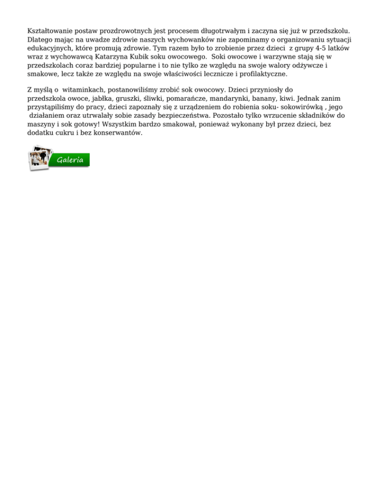 Kształtowanie postaw prozdrowotnych jest procesem długotrwałym i zaczyna się już w przedszkolu. Dlatego mając na uwadze zdrowie naszych wychowanków nie zapominamy o organizowaniu sytuacji edukacyjnych, które promują zdrowie. Tym razem było to zrobienie przez dzieci z grupy 4-5 latków wraz z wychowawcą Katarzyna Kubik soku owocowego. Soki owocowe i warzywne stają się w przedszkolach coraz bardziej popularne i to nie tylko ze względu na swoje walory odżywcze i smakowe, lecz także ze względu na swoje właściwości lecznicze i profilaktyczne. Z myślą o witaminkach, postanowiliśmy zrobić sok owocowy. Dzieci przyniosły do przedszkola owoce, jabłka, gruszki, śliwki, pomarańcze, mandarynki, banany, kiwi. Jednak zanim przystąpiliśmy do pracy, dzieci zapoznały się z urządzeniem do robienia soku- sokowirówką , jego działaniem oraz utrwalały sobie zasady bezpieczeństwa. Pozostało tylko wrzucenie składników do maszyny i sok gotowy! Wszystkim bardzo smakował, ponieważ wykonany był przez dzieci, bez dodatku cukru i bez konserwantów.