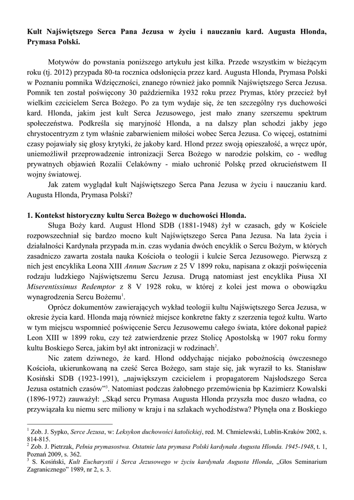 Kult Najświętszego Serca Pana Jezusa w życiu i nauczaniu kard. Augusta Hlonda, Prymasa Polski. Motywów do powstania poniższego artykułu jest kilka. Przede wszystkim w bieżącym roku (tj. 2012) przypada 80-ta rocznica odsłonięcia przez kard. Augusta Hlonda, Prymasa Polski w Poznaniu pomnika Wdzięczności, znanego również jako pomnik Najświętszego Serca Jezusa. Pomnik ten został poświęcony 30 października 1932 roku przez Prymas, który przecież był wielkim czcicielem Serca Bożego. Po za tym wydaje się, że ten szczególny rys duchowości kard. Hlonda, jakim jest kult Serca Jezusowego, jest mało znany szerszemu spektrum społeczeństwa. Podkreśla się maryjność Hlonda, a na dalszy plan schodzi jakby jego chrystocentryzm z tym właśnie zabarwieniem miłości wobec Serca Jezusa. Co więcej, ostatnimi czasy pojawiały się głosy krytyki, że jakoby kard. Hlond przez swoją opieszałość, a wręcz upór, uniemożliwił przeprowadzenie intronizacji Serca Bożego w narodzie polskim, co - według prywatnych objawień Rozalii Celakówny - miało uchronić Polskę przed okrucieństwem II wojny światowej. Jak zatem wyglądał kult Najświętszego Serca Pana Jezusa w życiu i nauczaniu kard. Augusta Hlonda, Prymasa Polski? 1. Kontekst historyczny kultu Serca Bożego w duchowości Hlonda. Sługa Boży kard. August Hlond SDB (1881-1948) żył w czasach, gdy w Kościele rozpowszechniał się bardzo mocno kult Najświętszego Serca Pana Jezusa. Na lata życia i działalności Kardynała przypada m.in. czas wydania dwóch encyklik o Sercu Bożym, w których zasadniczo zawarta została nauka Kościoła o teologii i kulcie Serca Jezusowego. Pierwszą z nich jest encyklika Leona XIII Annum Sacrum z 25 V 1899 roku, napisana z okazji poświęcenia rodzaju ludzkiego Najświętszemu Sercu Jezusa. Drugą natomiast jest encyklika Piusa XI Miserentissimus Redemptor z 8 V 1928 roku, w której z kolei jest mowa o obowiązku wynagrodzenia Sercu Bożemu1. Oprócz dokumentów zawierających wykład teologii kultu Najświętszego Serca Jezusa, w okresie życia kard. Hlonda mają również miejsce konkretne fakty z szerzenia tegoż kultu. Warto w tym miejscu wspomnieć poświęcenie Sercu Jezusowemu całego świata, które dokonał papież Leon XIII w 1899 roku, czy też zatwierdzenie przez Stolicę Apostolską w 1907 roku formy kultu Boskiego Serca, jakim był akt intronizacji w rodzinach2. Nic zatem dziwnego, że kard. Hlond oddychając niejako pobożnością ówczesnego Kościoła, ukierunkowaną na cześć Serca Bożego, sam staje się, jak wyraził to ks. Stanisław Kosiński SDB (1923-1991), „największym czcicielem i propagatorem Najsłodszego Serca Jezusa ostatnich czasów”3. Natomiast podczas żałobnego przemówienia bp Kazimierz Kowalski (1896-1972) zauważył: „Skąd sercu Prymasa Augusta Hlonda przyszła moc duszo władna, co przywiązała ku niemu serc miliony w kraju i na szlakach wychodźstwa? Płynęła ona z Boskiego 1 Zob. J. Sypko, Serce Jezusa, w: Leksykon duchowości katolickiej, red. M. Chmielewski, Lublin-Kraków 2002, s. 814-815. 2 Zob. J. Pietrzak, Pełnia prymasostwa. Ostatnie lata prymasa Polski kardynała Augusta Hlonda. 1945-1948, t. 1, Poznań 2009, s. 362. 3 S. Kosiński, Kult Eucharystii i Serca Jezusowego w życiu kardynała Augusta Hlonda, „Głos Seminarium Zagranicznego” 1989, nr 2, s. 3. Serca Jezusowego. Jemu to zgasły Książę Kościoła od najwcześniejszej młodości zbudował w sercu swoim tron chwały i czujnej miłości. Konieczność i pożyteczność Jego czci w Polsce najlepiej rozumiał. Toteż miłowanie Boskiego Serca przelewało się z serca Prymasa na naród i Rzeczypospolitą, i doprowadziło ją aż do progu poświęcenia się Polski nieskończenie miłosiernemu Sercu Boskiego Zbawiciela”4. 2. Przejawy kultu Serca Jezusa w życiu Prymasa. Źródeł pobożności ukierunkowanej m.in. na kult Serca Bożego trzeba doszukiwać się w życiu Prymasa jeszcze w pobożności jego rodziców. Później ten rys duchowości został pogłębiony i umocniony przez fakt wstąpienia do Towarzystwa Salezjańskiego. Jak zaznacza to wspomniany powyżej ks. Kosiński, kard. Hlondowi w ukształtowaniu jego duchowości pomógł właśnie fakt, że „znalazł się w zakładach ks. Bosko, wielkiego apostoła i czciciela Najświętszego Serca Jezusowego i Eucharystii. Opatrzność Boża tak pokierowała jego krokami, że miał to wielkie szczęście przez trzy lata przebywać w zakładzie przy bazylice Serca Jezusowego w Rzymie”5. Fakt ten na tyle wpłynął na duchowość młodego Augusta, że później będąc dyrektorem różnych zakładów salezjańskich, jak również będąc prowincjałem austrowęgierskiej inspektorii, starał się zapalić wszystkich - zarówno swoich wychowanków, jak i współbraci w zgromadzeniu - ideą miłości do Najświętszego Serca Jezusa. Świadczy o tym choćby nawet napisany w czerwcu 1905 roku artykuł do „Wiadomości Salezjańskich” zatytułowany: Najsłodsze Serce Pana Jezusa. W artykule tym Hlond poleca zwrócić uwagę i promuje m.in. Związek mszalny Najsłodszego Serca Jezusowego6 i uważa, że zaangażowanie w to stowarzyszenie sprowadzi obfitość łask Boskiego Serca7. Kult do Serca Bożego w duchowości sługi Bożego Augusta Hlonda nie zanikł również wtedy, gdy został w 1922 roku administratorem apostolskim Śląska Polskiego. Nie tylko tym kultem sam starał się żyć, ale polecał go innym. Kulminacją tego zaangażowania było uroczyste ofiarowanie w 1923 roku w Królewskiej Hucie (dzisiaj Chorzów) całego Śląska Polskiego Najświętszemu Sercu Pana Jezusa. Akt oddania odbył się w ramach trwającego II Zjazdu Katolickiego, którego zresztą pomysłodawcą był również Hlond. W następujący sposób argumentował to wydarzenie: „Na podziękowanie Bogu za wszystkie łaski udzielone naszej krainie, dla przebłagania Go za jej grzechy i oziębłość religijną, dla wyproszenia zbłą