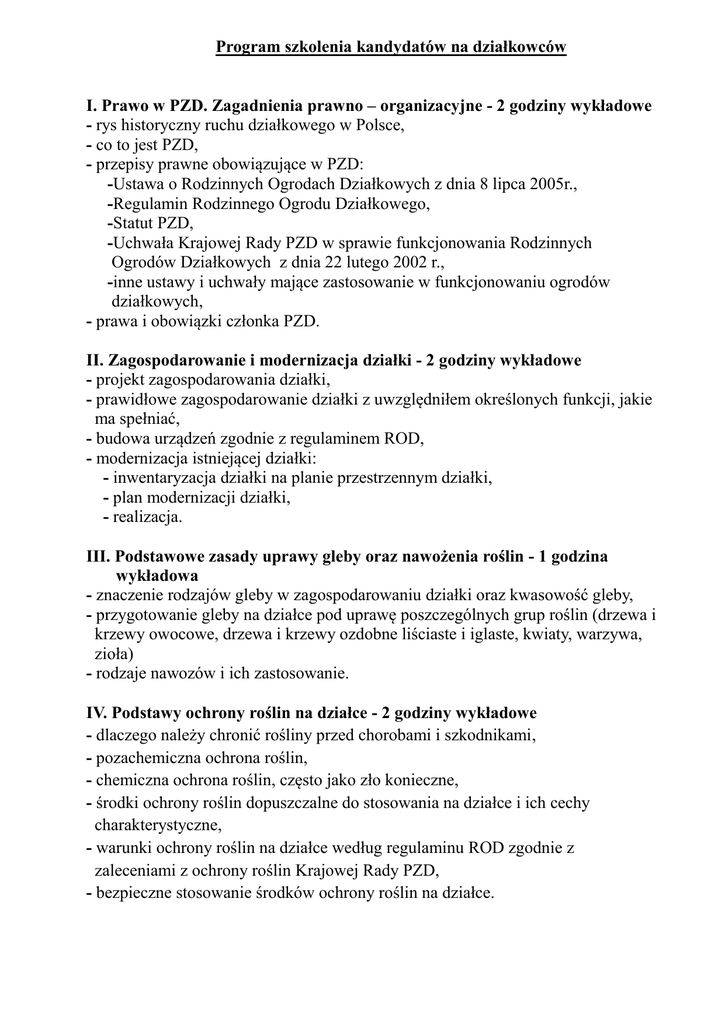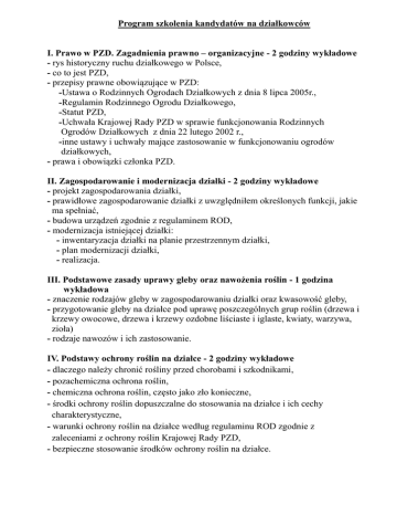 Program szkolenia kandydatów na działkowców I. Prawo w PZD. Zagadnienia prawno – organizacyjne - 2 godziny wykładowe - rys historyczny ruchu działkowego w Polsce, - co to jest PZD, - przepisy prawne obowiązujące w PZD: -Ustawa o Rodzinnych Ogrodach Działkowych z dnia 8 lipca 2005r., -Regulamin Rodzinnego Ogrodu Działkowego, -Statut PZD, -Uchwała Krajowej Rady PZD w sprawie funkcjonowania Rodzinnych Ogrodów Działkowych z dnia 22 lutego 2002 r., -inne ustawy i uchwały mające zastosowanie w funkcjonowaniu ogrodów działkowych, - prawa i obowiązki członka PZD. II. Zagospodarowanie i modernizacja działki - 2 godziny wykładowe - projekt zagospodarowania działki, - prawidłowe zagospodarowanie działki z uwzględniłem określonych funkcji, jakie ma spełniać, - budowa urządzeń zgodnie z regulaminem ROD, - modernizacja istniejącej działki: - inwentaryzacja działki na planie przestrzennym działki, - plan modernizacji działki, - realizacja. III. Podstawowe zasady uprawy gleby oraz nawożenia roślin - 1 godzina wykładowa - znaczenie rodzajów gleby w zagospodarowaniu działki oraz kwasowość gleby, - przygotowanie gleby na działce pod uprawę poszczególnych grup roślin (drzewa i krzewy owocowe, drzewa i krzewy ozdobne liściaste i iglaste, kwiaty, warzywa, zioła) - rodzaje nawozów i ich zastosowanie. IV. Podstawy ochrony roślin na działce - 2 godziny wykładowe - dlaczego należy chronić rośliny przed chorobami i szkodnikami, - pozachemiczna ochrona roślin, - chemiczna ochrona roślin, często jako zło konieczne, - środki ochrony roślin dopuszczalne do stosowania na działce i ich cechy charakterystyczne, - warunki ochrony roślin na działce według regulaminu ROD zgodnie z zaleceniami z ochrony roślin Krajowej Rady PZD, - bezpieczne stosowanie środków ochrony roślin na działce. V. Podstawowe wiadomości z dziedziny sadownictwa - 1godzina wykładowa - lokalizacja kwatery sadowniczej na działce, - podkładki, gatunki i odmiany drzew i krzewów owocowych zalecanych w uprawie na działce, - uprawa drzew i krzewów owocowych. VI. Podstawowe wiadomości z dziedziny warzywnictwa - 1godzina wykładowa - lokalizacja warzywnika na działce, - gatunki i odmiany warzyw zalecanych w uprawie na działce, - jakie warzywa warto uprawiać na działce i dlaczego, - uprawa warzyw. VII. Podstawowe wiadomości z dziedziny roślin ozdobnych - 1 godzina wykładowa - rozplanowanie roślin ozdobnych na działce ze względu na funkcje, jakie powinny spełniać, - gatunki i odmiany ozdobnych drzew i krzewów liściastych i iglastych zalecanych na działce, - rabaty kwiatowe, - uprawa roślin ozdobnych, - trawnik na działce. VIII. Uprawa ziół i ziołolecznictwo - 1 godzina wykładowa - dlaczego warto uprawiać zioła i rośliny przyprawowe, - zastosowanie roślin zielarskich (przyprawowych i leczniczych), - ogólne zasady uprawy ziół, - przegląd gatunków roślin zielarskich, - zakładanie ogródka ziołowego na działce. IX. Ekologia na działce - 1 godzina wykładowa - co to jest ekologia, - ekologiczne prowadzenie działki, - działania ekologiczne na działce (kompostownik, budki lęgowe, karmniki, nawozy organiczne i zielone) - pozachemiczna ochrona roślin, - znaczenie uprawy ekologicznej dla zdrowia rodziny działkowca. Łączny czas trwania szkolenia 12 godzin Program szkolenia zakłada przekazanie kandydatom niezbędnej wiedzy w stopniu podstawowym koniecznej do funkcjonowania w ROD i uprawy działki. Znaczny nacisk w programie położono na zagospodarowanie i modernizację działki. Wiedza ta powinna być rozwijana i doskonalona poprzez zalecaną literaturę związkową. Niezbędna literatura 1. „ Prawo w PZD” 2. „Vademecum działkowca” 3. „Album projektów zagospodarowania działek w ROD” 4. miesięcznik „działkowiec” Literatura przydatna przy zagospodarowaniu i modernizacji działki „Architekt zieleni radzi”, „Ogród dla zapracowanych” „Ogród na trudnym terenie”, „Ogród skalny”, „Ogród w pojemnikach”, „Ogród w stylu”, „Ogród wrzosowiskowy”, „Ogród łatwy w uprawie”, „Problemy z oczkiem wodnym”, „Ogród wodny”, „Nowoczesne nawadnianie” , „Zadaszenia”, „Ogrodzenia”. Literatura przydatna przy uprawie gleby i oraz nawożeniu roślin „Najważniejsze nawożenie”, „Przewodnik po nawozach”, „Wszystko o kompoście”, „Ściółki, mulcze, rośliny okrywowe”. Literatura przydatna przy ochronie roślin „Ochrona roślin bez chemii”, „Preparaty roślinne”, „Ochrona iglaków”, „Ochrona krzewów liściastych”, „Ochrona pnączy”, „Ochrona warzyw”, „Szkodniki glebowe”, „Gryzonie”, „Kret w ogrodzie”, „Ślimaki”. Literatura przydatna w dziedzinie sadownictwa „Sztuka cięcia drzew i krzewów owocowych”, „Kupujemy i sadzimy owocowe”, „Owocowe rarytasy”, „Brzoskwinie i morele”, „Czereśnie i wiśnie”, „Grusze”, „Jabłoń”, „Śliwy”, „Leszczyna”, „Porzeczki i agrest”, „Borówka wysoka”, „Winorośl”, „Dlaczego nie owocują?”. Literatura przydatna w dziedzinie warzywnictwa „Intensywna uprawa warzyw”, „Sekrety warzyw”, „Pomidor i papryka”, „Jak uprawiać pod osłonami”, „Warzywa dyniowate”. Literatura przydatna w dziedzinie roślin ozdobnych „Cięcie drzew i krzewów ozdobnych”, „Najpiękniejsze byliny”, „Trawy ozdobne”, „Kwiaty jednoroczne i dwuletnie”, „Ogrodowe pnącza”, „Karłowe drzewa i krzewy iglaste”, „Karłowe drzewa i krzewy liściaste”, „Rozmnażamy drzewa i krzewy liściaste”, „Wszystko o rabatach”, „Trawy ozdobne”, „Trawnik przez cały rok”. Literatura przydatna w uprawie ziół na działce „Ogród ziołowy”, „Zioła na działce” Literatura przydatna w ekologii na działce „Zdrowe odżywianie”
