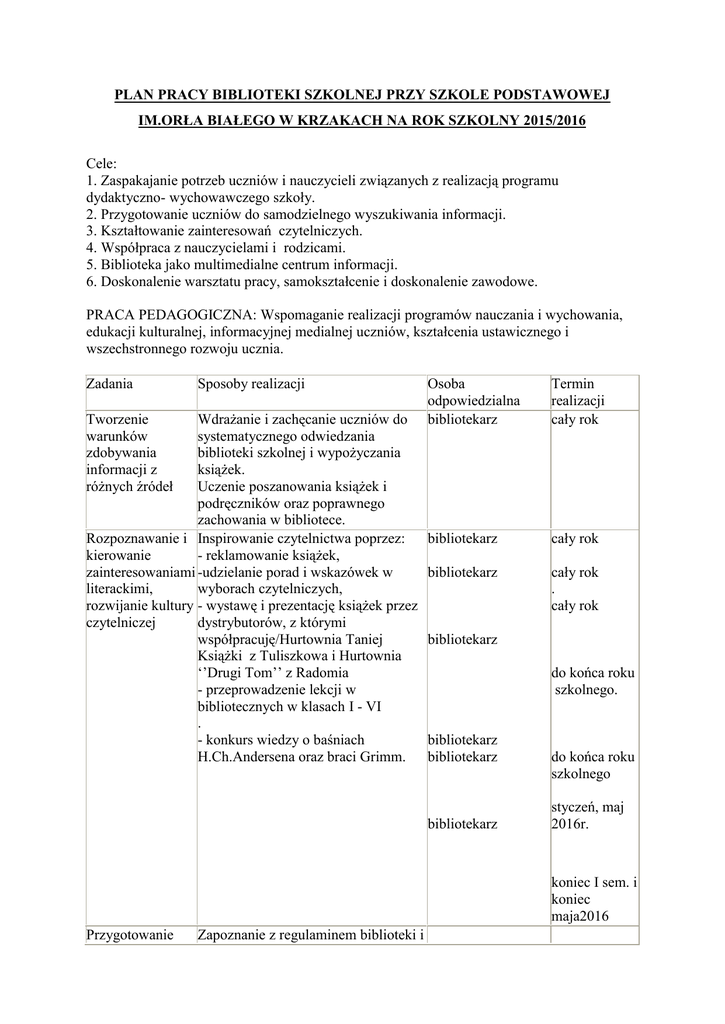 PLAN PRACY BIBLIOTEKI SZKOLNEJ PRZY SZKOLE
