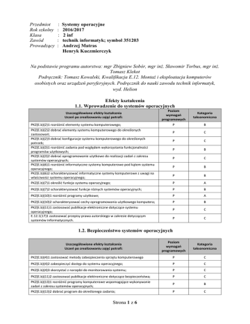 Przedmiot Rok szkolny Klasa Zawód Prowadzący : : : : : Systemy operacyjne 2016/2017 2 inf technik informatyk; symbol 351203 Andrzej Matras Henryk Kuczmierczyk Na podstawie programu autorstwa: mgr Zbigniew Sobór, mgr inż. Sławomir Torbus, mgr inż. Tomasz Klekot Podręcznik: Tomasz Kowalski, Kwalifikacja E.12. Montaż i eksploatacja komputerów osobistych oraz urządzeń peryferyjnych. Podręcznik do nauki zawodu technik informatyk, wyd. Helion Efekty kształcenia 1.1. Wprowadzenie do systemów operacyjnych Poziom wymagań programowych Kategoria taksonomiczna P B P C P C P B P C P B P B PKZ(E.b)(7)1 określić funkcje systemu operacyjnego; P A PKZ(E.b)(7)2 scharakteryzować funkcje różnych systemów operacyjnych; P B PKZ(E.b)(10)1 rozróżnić programy użytkowe; P A PKZ(E.b)(10)2 scharakteryzować cechy oprogramowania użytkowego komputera; P B P C P C Uszczegółowione efekty kształcenia Uczeń po zrealizowaniu zajęć potrafi: PKZ(E.b)(2)1 rozróżnić elementy systemu komputerowego; PKZ(E.b)(2)2 dobrać elementy systemu komputerowego do określonych zastosowań; PKZ(E.b)(2)3 dobrać konfiguracje systemu komputerowego do określonych potrzeb; PKZ(E.b)(3)1 rozróżnić zadania pod względem wykorzystania funkcjonalności programów użytkowych; PKZ(E.b)(3)2 dobrać oprogramowanie użytkowe do realizacji zadań z zakresu systemów operacyjnych; PKZ(E.b)(6)1 rozróżnić informatyczne systemy komputerowe pod kątem systemu operacyjnego; PKZ(E.b)(6)2 scharakteryzować informatyczne systemy komputerowe z uwagi na właściwości systemu operacyjnego; PKZ(E.b)(11)1 zastosować publikacje elektroniczne dotyczące systemu operacyjnego; E.12.1(17)1 zastosować przepisy prawa autorskiego w zakresie dotyczącym systemów informatycznych. 1.2. Bezpieczeństwo systemów operacyjnych Poziom wymagań programowych Kategoria taksonomiczna PKZ(E.b)(4)1 zastosować metody zabezpieczenia sprzętu komputerowego P C PKZ(E.b)(4)2 zabezpieczyć dostęp do systemu operacyjnego; P C PKZ(E.b)(4)3 skorzystać z narzędzi do monitorowania systemu; P C PKZ(E.b)(11)2 zastosować publikacje elektroniczne dotyczące bezpieczeństwa; P C PKZ(E.b)(13)1 rozróżnić programy komputerowe wspomagające wykonywanie zadań z zakresu systemów operacyjnych; P B PKZ(E.b)(13)2 dobrać program do określonego zadania; P C Uszczegółowione efekty kształcenia Uczeń po zrealizowaniu zajęć potrafi: Strona 1 z 6 P B E.12.1(14)2 opracować wskazania dotyczące użytkowania systemu operacyjnego; P C E.12.1(18)1 zidentyfikować licencje oprogramowania komputerowego; P A E.12.1(18)2 scharakteryzować licencje oprogramowania komputerowego; P B P B P C E.12.3(7)1 rozróżnić oprogramowanie diagnostyczne i monitorujące pracę komputera osobistego; E.12.3(7)2 dobrać oprogramowanie diagnostyczne i monitorujące pracę komputera osobistego do określonych zadań. Lp. 1-2 3-10 Temat BHP, regulamin, PSO, charakterystyka przedmiotu 1.1. Wprowadzenie do systemów operacyjnych Podstawowe pojęcia dotyczące systemu komputerowego, architektura systemów operacyjnych: Podstawowe pojęcia informatyczne Co to jest system operacyjny Cechy systemu operacyjnego Budowa systemu operacyjnego Typologia systemów operacyjnych Rozwój systemów operacyjnych- historia i współczesne systemy operacyjne. systemy op. Microsoft systemy operacyjne op. na unix MacOS X Systemy sieciowe Efekty kształcenia Przewidzianych godzin E.12.1(14)1 rozróżnić działania użytkownika dotyczące systemu operacyjnego; 2 PKZ(E.b)2 PKZ(E.b)3 PKZ(E.b)6 PKZ(E.b)7 E.12.1 . 12 11-14 Dyski i partycje w Windows Typy partycji Tworzenie partycji, zarządzanie partycjami Fragmentacja i defragmentacja PKZ(E.b)7 PKZ(E.b)10 4 15-22 Instalacja systemu Windows operacyjnego na stacji roboczej Wirtualizacja, programy do wirtualizacji Instalacja programu do wirtualizacji Instalacja Windowsa XP i Windowsa 7 na stacji roboczej E.12.1. PKZ(E.b)3 PKZ(E.b)10 10 23-26 Uruchamianie systemu operacyjnego Windows Kolejność uruchamiania Pliki biorące udział w starcie systemu Usuwanie problemów ze startem systemu Instalacja konsoli Praca w konsoli E.12.1 6 Strona 2 z 6 27-34 Konfiguracja i zrządzanie systemem operacyjnym Windows, aplikacje systemowe, instalowanie i usuwanie aplikacji, Obsługa zasobów (foldery, pliki) w Windows, Dostosowywanie pulpitu i okien do własnych potrzeb. Menu Start. Pasek zadań. Pliki zarejestrowane i niezarejestrowane. Wybór aplikacji do otwarcia plików niezarejestrowanych. Menu kontekstowe Katalog główny, ścieżka dostępu. Eksplorator Windows. Atrybuty plików. Panel sterowania Programy narzędziowe Profile użytkownika w Windows. Narzędzia administracyjne Mapowanie dysków, udostępnianie zasobów PKZ(E.b)2 PKZ(E.b)3 PKZ(E.b)7 PKZ(E.b)10 E.12.1 18 35-38 Urządzenia peryferyjne, instalacja sprzętu, Instalacja sterowników urządzeń zewnętrznych Aktualizacja sterowników Usuwanie awarii i problemów ze sprzętem PKZ(E.b)2 E.12.1 6 39-40 Drukowanie, Konfiguracja drukarki lokalnej. Drukowanie z poziomu aplikacji Windows. Menadżer wydruku. Opcje drukowania. Drukowanie do pliku. Drukowanie w sieci. PKZ(E.b)2 E.12.1 2 41-54 Polecenia systemów operacyjnych, interfejs graficzny i znakowy systemów operacyjnych, Polecenia wiersza poleceń Zarządzanie zasobami komputera przy pomocy wiersza poleceń WinXP Pliki wsadowe Windows Pliki wsadowe Windows- wprowadzenie Proste pliki wsadowe Pliki wsadowe z użyciem IF GOTO Polecenia z parametrem Pliki wsadowe- ćwiczenia Polecenie SET Zmienne środowiskowe, SHIFT Pętla FOR Polecenia konsoli odzyskiwania systemu PKZ(E.b)2 E.12.1 12 63-66 Rejestr systemu, Rejestr systemu, pliki rejestru. Sposoby tworzenia kopii zapasowej rejestru. Edytor rejestru, dane, klucze i ich zawartość. Pliki wpisów rejestru. Programy do optymalizacji, naprawy rejestru. PKZ(E.b)2 E.12.1 PKZ(E.b)4 6 Strona 3 z 6 Instalacja Linux na stacji roboczej, zarządzanie partycjami w Linuksie Podstawowe informacje o systemie Typy partycji Typy insta