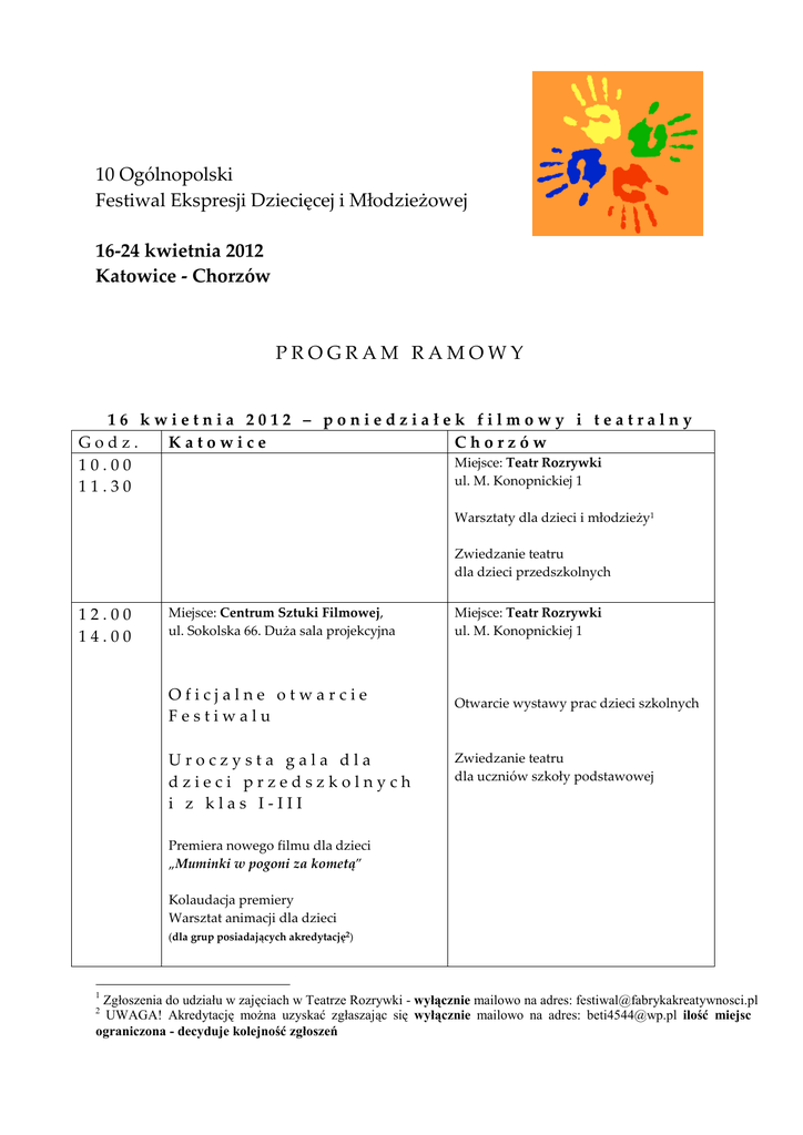 10 Ogólnopolski Festiwal Ekspresji Dziecięcej i Młodzieżowej 16-24 kwietnia 2012 Katowice - Chorzów PROGRAM RAMOWY 16 kwietnia 2012 – poniedziałek filmowy i teatralny Katowice Chorzów Godz. Miejsce: Teatr Rozrywki 10.00 ul. M. Konopnickiej 1 11.30 Warsztaty dla dzieci i młodzieży1 Zwiedzanie teatru dla dzieci przedszkolnych 12.00 14.00 Miejsce: Centrum Sztuki Filmowej, ul. Sokolska 66. Duża sala projekcyjna Miejsce: Teatr Rozrywki ul. M. Konopnickiej 1 Oficjalne otwarcie Festiwalu Otwarcie wystawy prac dzieci szkolnych Uroczysta gala dla dzieci przedszkolnych i z klas I-III Zwiedzanie teatru dla uczniów szkoły podstawowej Premiera nowego filmu dla dzieci „Muminki w pogoni za kometą” Kolaudacja premiery Warsztat animacji dla dzieci (dla grup posiadających akredytację2) 1 Zgłoszenia do udziału w zajęciach w Teatrze Rozrywki - wyłącznie mailowo na adres: [email protected] UWAGA! Akredytację można uzyskać zgłaszając się wyłącznie mailowo na adres: [email protected] ilość miejsc ograniczona - decyduje kolejność zgłoszeń 2 17 kwietnia 2012 – wtorek – teatr i plastyka Chorzów Godz. Katowice Miejsce: Teatr Lalki i Aktora „Ateneum” 9.30 ul. Św. Jana 10.30 Spektakl teatralny dla dzieci przedszkolnych i z klas I-III (dla grup posiadających akredytację3) 10.00 14.30 Miejsce: Sala Audytoryjna Biblioteka Śląska, pl. Rady Europy 1 Miejsce: ul. Wolności (plac obok Poczty) Spektakle teatralne Happening plastyczny dla dzieci przedszkolnych – prezentacje dzieci i młodzieży niepełnosprawnej4 12.00 13.30 Miejsce: Centrum Sztuki Filmowej, Katowice ul. Sokolska 66 Miejsce: Chorzowskie Centrum Kultury ul. H. Sienkiewicza 3 Warsztat animacji filmowej dla dorosłych – Animacja poklatkowa Uroczyste otwarcie wystawy prac dzieci przedszkolnych Prowadzenie - Aniela Lubieniecka (Wrocław) Sesja 1 – dla studentów (zapisy zamknięte) 15.00 17.30 Miejsce: Centrum Sztuki Filmowej, Katowice ul. Sokolska 66 Warsztat animacji filmowej dla dorosłych – Animacja poklatkowa Prowadzenie - Aniela Lubieniecka (Wrocław) Sesja 2 – dla nauczycieli (zapisy zamknięte) 13.00 15.00 Miejsce: Scena „Galeria”, Teatr Lalki i Aktora „Ateneum”, ul. 3 maja Spektakle teatralne – prezentacje dzieci przedszkolnych i wczesnoszkolnych5 15.30 Miejsce: Scena „Galeria”, Teatr Lalki i Aktora „Ateneum”, ul. 3 maja Prezentacja spektaklu Teatru Ruchu „Szukając siebie”, na motywach prozy B. Krupskiej, w wykonaniu studentów specjalności Muzykoterapia Akademii Muzycznej w Katowicach 3 UWAGA! Akredytację można uzyskać zgłaszając się wyłącznie mailowo na adres: [email protected] Zgłoszenia zespołów do dnia 26 marca 2012 wyłącznie mailowo na adres: [email protected] 5 Zgłoszenia zespołów do dnia 26 marca 2012 wyłącznie mailowo na adres: [email protected] 4 18 kwietnia 2012 – środa- ekspresja doświadczana i celebracja Chorzów Godz. Katowice Miejsce: Przedszkola Miejskie 10.00 Warsztaty artystyczne dla dzieci przedszkolnych 14.00 Miejsce: Sala Audytoryjna Biblioteka Śląska, Pl. Rady Europy 1 Jubileuszowa gala dla przyjaciół Festiwalu Wręczenie nagród 10 Festiwalu „Federio Jubileo” osobom zasłużonym dla propagowania idei ekspresji dziecięcej Bankiet dla zaproszonych gości 19 kwietnia 2012 – czwartek –literatura, teatr i film Chorzów Godz. Katowice Miejsce: Wydział Pedagogiki i Psychologii 9.00 Sala nr 203 (II piętro, stary budynek) 11.00 Ogólnopolska Konferencja Naukowa nt. Terapia poprzez sztukę – literatura i teatr Dyskusja oxfordzka nt. Sztuka czy terapia? (uczestniczą pracownicy i studenci Uniwersytetu Śląskiego, Akademii Muzycznej im. K. Szymanowskiego i Śląskiej Wyższej Szkoły Zarządzania im. gen. J. Ziętka w Katowicach) 12.00 14.00 Miejsce: Centrum Sztuki Filmowej, ul. Sokolska 66. Duża sala projekcyjna Pokaz specjalny filmu dla zaproszonych gości festiwalu Miejsce: Górnośląska Wyższa Szkoła Przedsiębiorczości, im. K. Goduli ul. Racławicka 23 15.00 20.00 Ogólnopolska Konferencja Naukowa nt. Terapia przez sztukę – literatura i teatr Warsztaty dla studentów, nauczycieli, terapeutów pracujących z dziećmi i młodzieżą w zakresie edukacji estetycznej i sztuki (edycja 1) 20 kwietnia 2012 – piątek – naukowo i śpiewająco Godz. Chorzów Miejsce: Górnośląska Wyższa Szkoła Przedsiębiorczości, im. K. Goduli ul. Racławicka 23 14.00 20.00 Ogólnopolska Konferencja Naukowa nt. Terapia przez sztukę – literatura i teatr6 Warsztaty dla studentów, nauczycieli, terapeutów pracujących z dziećmi i młodzieżą w zakresie edukacji estetycznej i sztuki (edycja 2) Miejsce: Młodzieżowy Dom Kultury, Chorzów, ul. Lompy Przegląd Piosenki Integracyjnej - dzień 1 - 19.04.2012 - dzień 2 - 20.04.2012 (impreza towarzysząca) 24 kwietnia 2012 – muzyczno - taneczny wtorek Godz. Katowice Miejsce: Sala Koncertowa Akademii Muzycznej im. K. Szymanowskiego ul. Zacisze 3 11.00 Otwarcie wernisażu zespołowych prac plastycznych dzieci wykonanych po premierze filmu „Muminki w pogoni za kometą” - hall AM 11.30 Koncert dla dzieci z zaproszonych przedszkoli i szkół w programie dziecięce prezentacje taneczne7 występ chóru (miejsca na widowni dla dzieci – grupy akredytowane8) 13.30 6 Uroczyste zamknięcie Festiwalu Zgłoszenia uczestnictwa w warsztatach: festiwal@fabrykakreatywności.pl Zgłoszenia zespołów do dnia 26 marca 2012 wyłącznie mailowo na adres: [email protected] 8 UWAGA! Akredytację można uzyskać zgłaszając się wyłącznie mailowo na adres: [email protected] 7 10 Ogólnopolski Festiwal Ekspresji Dziecięcej i Młodzieżowej 16-24 kwietnia 2012 Katowice - Chorzów Imprezy towarzyszące KATOWICE Warsztaty plastyczne dla dzieci przedszkolnych Cele: - motywowanie do wypowiadania się w różnych technikach plastycznych - rozwijanie wrażliwości na słowo, kształty i kolory, Adresat: dzieci przedszkolne w wieku 5-6 lat Harmonogram spotkań: Tematyka KOLOROTERAPIA BAJKOTERAPIA 