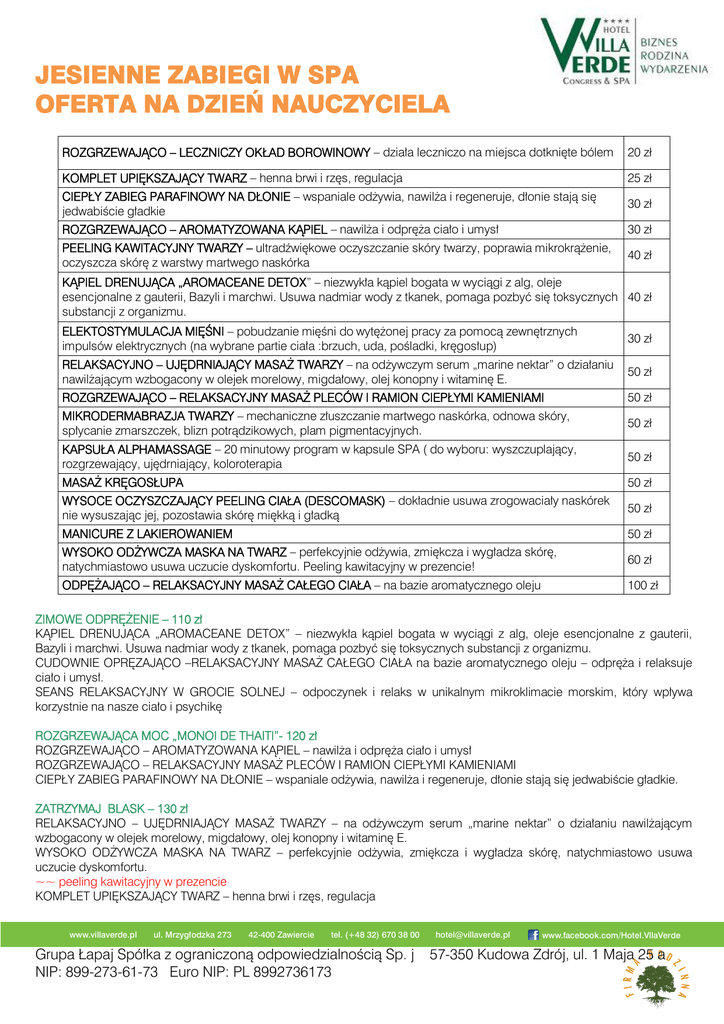 JESIENNE ZABIEGI W SPA OFERTA NA DZIEŃ NAUCZYCIELA ROZGRZEWAJĄCO – LECZNICZY OKŁAD BOROWINOWY – działa leczniczo na miejsca dotknięte bólem 20 zł KOMPLET UPIĘKSZAJĄCY TWARZ – henna brwi i rzęs, regulacja 25 zł CIEPŁY ZABIEG PARAFINOWY NA DŁONIE – wspaniale odżywia, nawilża i regeneruje, dłonie stają się jedwabiście gładkie 30 zł ROZGRZEWAJĄCO – AROMATYZOWANA KĄPIEL – nawilża i odpręża ciało i umysł 30 zł PEELING KAWITACYJNY TWARZY – ultradźwiękowe oczyszczanie skóry twarzy, poprawia mikrokrążenie, oczyszcza skórę z warstwy martwego naskórka 40 zł KĄPIEL DRENUJĄCA „AROMACEANE DETOX” – niezwykła kąpiel bogata w wyciągi z alg, oleje esencjonalne z gauterii, Bazyli i marchwi. Usuwa nadmiar wody z tkanek, pomaga pozbyć się toksycznych 40 zł substancji z organizmu. ELEKTOSTYMULACJA MIĘŚNI – pobudzanie mięśni do wytężonej pracy za pomocą zewnętrznych impulsów elektrycznych (na wybrane partie ciała :brzuch, uda, pośladki, kręgosłup) 30 zł RELAKSACYJNO – UJĘDRNIAJĄCY MASAŻ TWARZY – na odżywczym serum „marine nektar” o działaniu nawilżającym wzbogacony w olejek morelowy, migdałowy, olej konopny i witaminę E. 50 zł ROZGRZEWAJĄCO – RELAKSACYJNY MASAŻ PLECÓW I RAMION CIEPŁYMI KAMIENIAMI 50 zł MIKRODERMABRAZJA TWARZY – mechaniczne złuszczanie martwego naskórka, odnowa skóry, spłycanie zmarszczek, blizn potrądzikowych, plam pigmentacyjnych. 50 zł KAPSUŁA ALPHAMASSAGE – 20 minutowy program w kapsule SPA ( do wyboru: wyszczuplający, rozgrzewający, ujędrniający, koloroterapia 50 zł MASAŻ KRĘGOSŁUPA 50 zł WYSOCE OCZYSZCZAJĄCY PEELING CIAŁA (DESCOMASK) – dokładnie usuwa zrogowaciały naskórek nie wysuszając jej, pozostawia skórę miękką i gładką 50 zł MANICURE Z LAKIEROWANIEM 50 zł WYSOKO ODŻYWCZA MASKA NA TWARZ – perfekcyjnie odżywia, zmiękcza i wygładza skórę, natychmiastowo usuwa uczucie dyskomfortu. Peeling kawitacyjny w prezencie! 60 zł ODPĘŻAJĄCO – RELAKSACYJNY MASAŻ CAŁEGO CIAŁA – na bazie aromatycznego oleju 100 zł ZIMOWE ODPRĘŻENIE – 110 zł KĄPIEL DRENUJĄCA „AROMACEANE DETOX” – niezwykła kąpiel bogata w wyciągi z alg, oleje esencjonalne z gauterii, Bazyli i marchwi. Usuwa nadmiar wody z tkanek, pomaga pozbyć się toksycznych substancji z organizmu. CUDOWNIE OPRĘZAJĄCO –RELAKSACYJNY MASAŻ CAŁEGO CIAŁA na bazie aromatycznego oleju – odpręża i relaksuje ciało i umysł. SEANS RELAKSACYJNY W GROCIE SOLNEJ – odpoczynek i relaks w unikalnym mikroklimacie morskim, który wpływa korzystnie na nasze ciało i psychikę ROZGRZEWAJĄCA MOC „MONOI DE THAITI”- 120 zł ROZGRZEWAJĄCO – AROMATYZOWANA KĄPIEL – nawilża i odpręża ciało i umysł ROZGRZEWAJĄCO – RELAKSACYJNY MASAŻ PLECÓW I RAMION CIEPŁYMI KAMIENIAMI CIEPŁY ZABIEG PARAFINOWY NA DŁONIE – wspaniale odżywia, nawilża i regeneruje, dłonie stają się jedwabiście gładkie. ZATRZYMAJ BLASK – 130 zł RELAKSACYJNO – UJĘDRNIAJĄCY MASAŻ TWARZY – na odżywczym serum „marine nektar” o działaniu nawilżającym wzbogacony w olejek morelowy, migdałowy, olej konopny i witaminę E. WYSOKO ODŻYWCZA MASKA NA TWARZ – perfekcyjnie odżywia, zmiękcza i wygładza skórę, natychmiastowo usuwa uczucie dyskomfortu. ~~ peeling kawitacyjny w prezencie KOMPLET UPIĘKSZAJĄCY TWARZ – henna brwi i rzęs, regulacja www.villaverde.pl ul. Mrzygłodzka 273 42-400 Zawiercie tel. (+48 32) 670 38 00 Grupa Łapaj Spółka z ograniczoną odpowiedzialnością Sp. j NIP: 899-273-61-73 Euro NIP: PL 8992736173 [email protected] www.facebook.com/Hotel.VllaVerde 57-350 Kudowa Zdrój, ul. 1 Maja 25 a