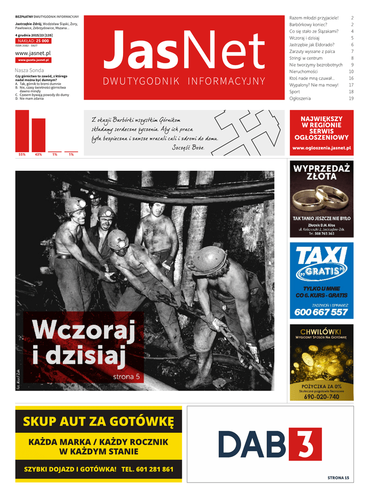 55% 43% 1% 1% STRONA 15 2 grudzień 2015 publicystyka www.JasNet.pl MATERIAŁ SPONSOROWANY Razem młodzi przyjaciele! Młodzi mieszkańcy naszego miasta z niecierpliwością czekają na „złote góry”, jakie obiecywane im były w czasie kolejnych wyborów samorządowych przez lokalnych liderów. Wtedy każdy chciał opiekować się młodymi, mówić ich głosem. Ba, nawet były plany, by zachęcić młodych do pozostawania w naszym mieście. Dzisiaj, po upływie roku od ostatniego plebiscytu samorządowego, możemy powiedzieć niemalże z pewnością, że po raz kolejny młodzież potrzebna była przy... właśnie wyborach. Dlaczego tak jest? Dlaczego nikomu nie chce się zająć młodzieżą na serio? To znaczy tak, by przygotować plan i zrealizować go od początku do końca, mówiąc na końcu „sprawdzam” i wyciągając wnioski z tego, co się udało, a co nie wyszło. Stowarzyszenie Samorządne Jastrzębie w swojej działalności zakłada mocne otwarcie na młodych i ich pomysły. Osobami zaangażowanymi we współpracę z młodymi jest Magdalena Korzec-Szymczyk oraz Anna Szczepaniak. Chcemy poprzez stały kontakt z młodzieżą pokazać, że osoby młode mają swoje pole działania w JastrzębiuZdroju.. Takie działania rozpoczęliśmy szeregiem inicjatyw w czasie wakacyjnym. Teraz chcemy podjąć współpracę z Młodzieżową Radą Miasta, która niedawno się ukonstytuowała . Ci młodzi ludzie z założenia mają być reprezentantem jastrzębskiej młodzieży, który jest traktowany poważnie a jego głos słyszalny i odpowiednio wysłuchiwany. Mi- mo młodego wieku powinni być traktowani z szacunkiem i z należytą uwagą. Z tym że mimo szumnych zapowiedzi młodzi ludzie zostali pozostawieni sami sobie. Są traktowani wzruszeniem ramion, jak „kukułcze jajo” z przeszłości, z którym nie wiadomo, co zrobić. „A bo im się nic nie chce” – słychać często. A jak ma się im chcieć, jak się ich nie traktuje poważne? A całą MRM po prostu „odfajkowuje”, jak zbyteczny kłopot. A przecież są wśród nich naprawdę bardzo wartościowe osoby, na które warto postawić! Mamy wrażenie, że dorośli politycy zasiadający w „dorosłej” Radzie Miasta zapomnieli o obowiązku wykuwania młodych talentów właśnie w Młodzieżowej Radzie Miasta. Czy nie stać dorosłych radnych oraz władz miasta na stworzenie planu współpracy z młodzieżą właśnie na bazie MRM? Temat MRM odgrzewany jest co jakiś czas. Jest to najczęściej czas, w którym organizowane są imprezy i środki finansowe, jakimi dysponują młodzi rajcy, przydatne są, by „pospinać” budżety tych przedsięwzięć. Pamięta się o młodzieży również wtedy, gdy trzeba przenieść parę stołów czy postawić scenę przed występem jakiejś gwiazdy. Czy w taki sposób zachęcimy młodych do lokalnego działania? Uważamy, że nie! Dlatego nasze Stowarzyszenie chce zaproponować młodzieży nowe otwarcie, pomoc w rozwiązywaniu problemów i współdziałanie w różnych przedsięwzięciach, na podstawie raem przygotowanego planu. Chcemy być ich przyjacielem, opiekunem, pomocnikiem, dla którego są oni bardzo ważni i wartościowi. I to nie z racji opłacanej funkcji w mieście ale po prostu z żywego zainteresowania ich sprawami. Nawiązaliśmy już z nimi stały kontakt. Poznaliśmy już nowo wybraną przewodniczącą Młodzieżowej Rady Miasta. Wiemy już, że Karolina, bo tak ma na imię, jest bardzo wartościową osobą, przygotowaną na ciężką, mozolną pracę dla przywrócenia właściwej pozycji dla młodych radnych, jako przedstawicieli całej jastrzębskiej młodzieży. Gotową do starań o ich właściwą pozycję w mieście. Zdajemy sobie wspólnie sprawę z tego, że czeka nas ogromny wysiłek, by młodzi ludzie widzieli sens działania już na etapie samorządów szkolnych, których rola powinna być też należycie doceniona. I już cieszymy się na taka współpracę! Chcemy, by głównym kierunkiem wspólnego działania było przywrócenie oczekiwanej roli Młodzieżowej Rady Miasta. Bo dotychczas nikt nie zdobył się nawet na taki „wysiłek”, aby młodym radnym przedstawić ich prawa i obowiązki, wynikające z mandatu radnego MRM. Uważamy, że nadszedł najwyższy czas na poważne potraktowanie młodzieży w Jastrzębiu-Zdroju. Należy to zrobić wielotorowo, tak by każda młoda osoba przekonała się, że warto działać lokalnie. Tylko w taki sposób będziemy szlifować młode talenty, które będą dostrzegać swoją przyszłość w naszym mieście. To doskonale wpisuje się Anna Szczepaniak Magdalena Korzec-Szymczyk filozofię działania naszego stowarzyszenia, które jest daleko od wielkiej polityki, a blisko miasta i jego mieszkańców. Chcemy by młodzi ludzie znaleźli sens pozostania i życia w tym mieście. Żeby wszystko nie kończyło się na narzekaniu, ze wszyscy stąd wyjeżdżają i nie robiło się nic. Zatem „razem młodzi przyjaciele!” we wspólnym kierunku, a za jakiś czas powiemy sobie„sprawdzam”! MATERIAŁ SPONSOROWANY Barbórkowy koniec? Ponure szare dni, drzewa bez liści i przelotne opady śniegu z deszczem to znak, że zbliża się Barbórka – święto wszystkich górników. Święto ludzi, którzy każdego dnia wychodząc do pracy nie mają pewności czy wrócą ze „swojej” ściany czy „swojego” przodka. Każde wyjście to niemal pożegnanie i świadomość, że może być różnie – pomyślnie lub tragicznie. I jak to sami mówią – taki jest żywot górnika, który przecież sam zdecydował, że tak właśnie będzie pracował. Lecz tutaj należy zadać sobie pytanie: – Czy na pewno wiedział i czy dzisiaj nie może czuć się w jakimś sensie oszukany ? Bo przecież pracujący dzisiaj górnicy z np. 20 letnim stażem zatrudniali się na całkiem innych warunkach niż dzisiaj pracują. Ich pozycja była zdecydowanie korzystniejsza niż dzisiaj, kiedy to górnictwo kojarzy się raczej z cięciami i s