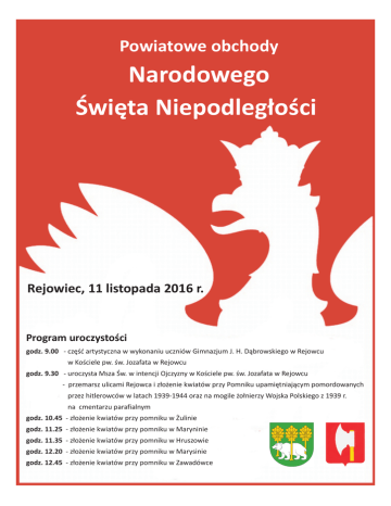 Powiatowe obchody Narodowego Œwiêta Niepodleg³oœci Rejowiec, 11 listopada 2016 r. Program uroczystoœci godz. 9.00 - czêœæ artystyczna w wykonaniu uczniów Gimnazjum J. H. D¹browskiego w Rejowcu w Koœciele pw. œw. Jozafata w Rejowcu godz. 9.30 - uroczysta Msza Œw. w intencji Ojczyzny w Koœciele pw. œw. Jozafata w Rejowcu - przemarsz ulicami Rejowca i z³o¿enie kwiatów przy Pomniku upamiêtniaj¹cym pomordowanych przez hitlerowców w latach 1939-1944 oraz na mogile ¿o³nierzy Wojska Polskiego z 1939 r. na cmentarzu parafialnym godz. 10.45 - z³o¿enie kwiatów przy pomniku w ¯ulinie godz. 11.25 - z³o¿enie kwiatów przy pomniku w Maryninie godz. 11.35 - z³o¿enie kwiatów przy pomniku w Hruszowie godz. 12.20 - z³o¿enie kwiatów przy pomniku w Marysinie godz. 12.45 - z³o¿enie kwiatów przy pomniku w Zawadówce