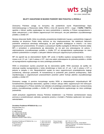 BILETY ZAKUPIONE W BIURZE PODRÓŻY BEZ PODATKU U ŹRÓDŁA Zwracamy Państwa uwagę na korzystny dla podatników wyrok Wojewódzkiego Sądu Administracyjnego w Rzeszowie (dalej: WSA) z dnia 28 stycznia 2016 r. (sygn. I SA/Rz 1162/15), zgodnie z którym spółka wypłacająca na rzecz pośredników z siedzibą w Polsce wynagrodzenie z tytułu zakupionych u nich biletów zagranicznych linii lotniczych, nie jest płatnikiem zryczałtowanego podatku u źródła CIT. Sprawa dotyczyła Spółki, która na potrzeby prowadzonej działalności kupuje u pośredników mających siedzibę na terytorium Polski bilety lotnicze na loty międzynarodowe. Na niektórych fakturach pośrednik umieszcza adnotację wskazującą, że jest agentem działającym w imieniu i na rzecz zagranicznych przewoźników. W związku z powyższym Spółka wystąpiła do Ministra Finansów (dalej: MF) z wnioskiem o potwierdzenie jej stanowiska, że nie jest ona zobowiązana do poboru i odprowadzenia zryczałtowanego podatku u źródła CIT od wynagrodzenia wypłacanego na rzecz polskich pośredników w związku z zakupem biletów lotniczych zagranicznych przewoźników. MF nie zgodził się ze stanowiskiem Spółki. MF uznał, iż Spółka wypłaca wynagrodzenie, o którym mowa w art. 21 ust. 1 pkt 4 ustawy o CIT. Jest ona zatem zobowiązana do pobrania podatku u źródła od wynagrodzenia wypłacanego na rzecz polskiego pośrednika. WSA w omawianym wyroku przychylił się do stanowiska spółki. WSA zauważył, że spółka nie dokonuje wypłaty wynagrodzenia z tytułu określonego w treści art. 21 ust. 1 pkt 4 ustawy o CIT, a jedynie w związku z nim. Bezpośrednich wypłat na rzecz zagranicznych przedsiębiorstw żeglugi powietrznej, dokonuje pośrednik. W konsekwencji to pośrednik jako podmiot profesjonalny, stale współpracujący z zagranicznymi przewoźnikami powinien pełnić funkcje płatnika zryczałtowanego podatku u źródła CIT. Zwracamy uwagę, iż pomimo korzystnego wyroku WSA w interpretacjach indywidualnych MF konsekwentnie prezentuje stanowisko, zgodnie z którym zakupu biletu zagranicznych linii lotniczych (nie posiadających w Polsce siedziby lub oddziału) od polskiego pośrednika wiąże się z koniecznością poboru zryczałtowanego podatku u źródła CIT od wynagrodzenia wypłacanego na rzecz polskiego pośrednika. Jeżeli powyższe zagadnienie dotyczy Państwa działalności i są Państwo zainteresowani naszą pomocą w przedmiotowym zakresie, uprzejmie prosimy o kontakt z Państwa opiekunem lub naszym sekretariatem. Doradztwo Podatkowe WTS&SAJA Sp. z o.o. Budynek Delta IV p. ul. Towarowa 35 61-896 Poznań tel. (+48) 61 643 45 50 fax. (+48) 61 643 45 51 Biuro w Warszawie Budynek Central Tower XXII p. Doradztwo Podatkowe WTS&SAJA Sp. z o.o. Budynek Delta IVp. ul. Towarowa 35 61-896 Poznań T +48 61 643 45 50 F +48 61 643 45 51 [email protected] www.wtssaja.pl Prezes Zarządu: Magdalena Saja NIP: 778-141-77-66 Sąd Rejonowy Poznań – Nowe Miasto i Wilda w Poznaniu, VIII Wydział Gospodarczy KRS 0000206176 Kapitał zakładowy: 200.000 PLN Al. Jerozolimskie 81 02-001 Warszawa Powyższy Newsletter stanowi informację o charakterze ogólnym, jego celem jest dostarczenie Państwu na bieżąco informacji o zmianach w prawie podatkowym, interpretacjach organów podatkowych, rozwoju linii orzeczniczej oraz ciekawych komentarzach. Doradztwo Podatkowe WTS&SAJA nie ponosi prawnej odpowiedzialności za żadne działania lub zaniechania podjęte w wyniku powyższych informacji. Doradztwo Podatkowe WTS&SAJA Sp. z o.o. Budynek Delta IVp. ul. Towarowa 35 61-896 Poznań T +48 61 643 45 50 F +48 61 643 45 51 [email protected] www.wtssaja.pl Prezes Zarządu: Magdalena Saja NIP: 778-141-77-66 Sąd Rejonowy Poznań – Nowe Miasto i Wilda w Poznaniu, VIII Wydział Gospodarczy KRS 0000206176 Kapitał zakładowy: 200.000 PLN
