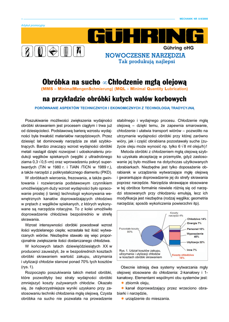• MECHANIK NR 8-9/2008 Artykuł promocyjny Gühring oHG NOWOCZESNE NARZĘDZIA Tak produkują najlepsi Obróbka na sucho • Chłodzenie mgłą olejową (MMS – MinimalMengenSchmierung) (MQL – Minimal Quantity Lubrication) na przykładzie obróbki kutych wałów korbowych PORÓWNANIE ASPEKTÓW TECHNICZNYCH I EKONOMICZNYCH Z TECHNOLOGIĄ TRADYCYJNĄ Poszukiwanie możliwości zwiększenia wydajności obróbki skrawaniem jest procesem ciągłym i trwa już od dziesięcioleci. Podstawową barierą wzrostu wydajności była trwałość materiałów narzędziowych. Przez dziesięć lat dominowały narzędzia ze stali szybkotnących. Bardzo znaczący wzrost wydajności obróbki metali nastąpił dzięki rozwojowi i udoskonaleniu produkcji węglików spiekanych (węgliki z ultradrobnego ziarna 0,3 ÷ 0,5 µm) oraz wprowadzeniu pokryć supertwardych (TiN w 1980 r. i TiAlN /TiCN w 1989 r.), a także narzędzi z polikrystalicznego diamentu (PKD). W obróbkach wiercenia, frezowania, a także gwintowania i rozwiercania podstawowym czynnikiem umożliwiającym duży wzrost wydajności było opracowanie prostej (i taniej) technologii wykonywania wewnętrznych kanałów doprowadzających chłodziwo w prętach z węglików spiekanych, z których wykonywane są narzędzia rotacyjne. To z kolei umożliwiło doprowadzenie chłodziwa bezpośrednio w strefę skrawania. Wzrost intensywności obróbki powodował wzrost ilości wydzielanego ciepła; wzrastała też ilość wytwarzanych wiórów. Niezbędne stawało się więc proporcjonalnie zwiększanie ilości dostarczanego chłodziwa. W końcowych latach dziewięćdziesiątych XX w producenci zauważyli, że w bezpośrednich kosztach obróbki skrawaniem wartość zakupu, utrzymania i utylizacji chłodziw stanowi ponad 70% tych kosztów (rys. 1). Rozpoczęto poszukiwania takich metod obróbki, które pozwoliłyby bez straty wydajności obróbki zmniejszyć koszty zużywanych chłodziw. Okazało się, że najkorzystniejsze wyniki uzyskano przy zastosowaniu techniki chłodzenia mgłą olejową. Czysta obróbka na sucho nie pozwalała na prowadzenie stabilnego i wydajnego procesu. Chłodzenie mgłą olejową – dzięki temu, że zapewnia smarowanie, chłodzenie i ułatwia transport wiórów – pozwoliło na utrzymanie wydajności obróbki przy której zarówno wióry, jak i część obrabiana pozostawały suche (zużycie oleju może wynosić np. tylko 6 ÷ 8 ml oleju/h) ! Metoda obróbki z chłodzeniem mgłą olejową szybko uzyskała akceptację w przemyśle, gdyż zastosowanie jej było możliwe na dotychczas użytkowanych obrabiarkach. Niezbędne jest tylko doposażenie obrabiarek w urządzenia wytwarzające mgłę olejową i gwarantujące doprowadzenie jej do strefy skrawania poprzez narzędzie. Narzędzia skrawające stosowane w tej obróbce formalnie niewiele różnią się od narzędzi stosowanych przy chłodzeniu emulsją, lecz ich modyfikacja jest niezbędna (rodzaj węglika; geometria narzędzia; sposób wykończenia powierzchni itp). Rys. 1. Udział kosztów zakupu, utrzymania i utylizacji chłodziw w kosztach obróbki skrawaniem Obecnie istnieją dwa systemy wytwarzania mgły olejowej stosowane do chłodzenia: 2-kanałowy i 1kanałowy. Elementami wspólnymi obu systemów jest: zbiornik oleju, kanał doprowadzający przez wrzeciono obrabiarki i narzędzie, urządzenie do mieszania. • MECHANIK NR 8-9/2008 Zalety chłodzenia mgłą olejową: redukcja czasu obróbki dzięki wyższym szybkościom skrawania, obrobione części pozostają suche, zbędne jest odtłuszczanie obrobionych części, wióry pozostają suche, nie ma wokół obrabiarki strefy zaolejenia, brak wydatków na gospodarkę chłodziwami, dłuższa trwałość narzędzi dzięki eliminacji szoku termicznego, mniejsze koszty na zakup nowych obrabiarek, eliminacja chorób „odchłodziwowych” wśród pracowników, ochrona środowiska. a) b) Rys. 2. System 2-kanałowy (a), system 1-kanałowy (b) System 2-kanałowy ma ponadto: oddzielne doprowadzenie mediów przez wrzeciono (kanał wewnętrzny i zewnętrzny) oraz wirującą lancę, mieszanie mediów następujące pomiędzy wrzecionem a narzędziem. W systemie 1-kanałowym mieszanie mediów następuje w zbiorniku oleju przed wlotem do wrzeciona. „Gotowa” mgła olejowa dostarczana jest przez wrzeciono i narzędzie (rys. 2). System 2-kanałowy jest stosowany przy dużych seriach produkcyjnych, w procesach obróbkowych z dużą liczbą wymian narzędzi (centra obróbkowe). System 1-kanałowy jest natomiast stosowany przy produkcji mało- i średnioseryjnej, na obrabiarkach o ograniczonej wielkości przestrzeni roboczej (centra tokarskie, linie automatyczne), a także przy adaptacji-przebudowie używanych obrabiarek, gdy stosowane jest równoległe chłodzenie emulsją i mgłą olejową. Rozwój urządzeń wytwarzających mgłę olejową był (i jest) bardzo intensywny. Zakres zastosowań i uzyskiwane parametry dostarczanej mgły olejowej są bardzo wysokie. Intensywność chłodzenia, wspomaganie ewakuacji wiórów oraz jakość smarowania pozwoliły nie tylko utrzymać parametry skrawania, lecz w wielu wypadkach znacznie je przekraczać (rys. 3). Rys. 3. Intensywność przepływu mediów chłodzących: – średnia szybkość przepływu czynnika chłodzącego [m/s]: MMS (powietrze): 30,4 m/s emulsja: 3,5 m/s – wydatek przepływu czynnika chłodzącego przez rowki wiórowe [l/h]: MMS: 6960 l/h (powietrza!) emulsja: 600 l/h Zastosowanie wiercenia z chłodzeniem mgłą olejową wymagało modyfikacji wielu parametrów wierteł, ale główną trudnością okazało się stabilne dostarczenie mgły olejowej do strefy skrawania. Na przejściu mgły olejowej z wrzeciona do oprawki narzędziowej i narzędzia następuje wykraplanie oleju i w efekcie do strefy skrawania dociera „suche” powietrze. Efektem jest pogorszenie warunków skrawania, a w konsekwencji duży • MECHANIK NR 8-9/2008 Rys. 4. Badanie różnych zakończeń uchwytów dla c