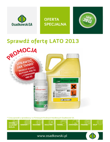 OFERTA SPECJALNA P Sprawdź ofertę LATO 2013 OCJA M RO DŹ,* W A SPR ANIO JAK T KUPIĆ: ESZ MOŻ N 400 SC SA BUTI MMAND + CO EC 4 80 * Cenę sprawdź u sprzedawcy i w Firmowych Punktach Handlowych Osadkowski SA. www.osadkowski.pl ŚRODKI OCHRONY ROŚLIN Przekaż uprawy pod ochronę ekspertów PROMOTOR AS 500 SL 5 l GLYFOS 360 SL 20 l Adiuwant do glifosatów (Glyfos 360 SL) o potrójnym działaniu Glifosat o szerokim zastosowaniu do desykacji do niszczenia chwastów po zbiorach i przygotowaniu gleby do siewu ozimin zwilża, kondycjonuje wodę, aktywuje obniża dawkę stosowanego glifosatu 59 64 netto 50 /sztuka netto 258 00 /sztuka brutto 278 64 brutto 26 /sztuka /sztuka ATPOLAN BIO 80 EC 1 l TARGA 10 EC 1 l Adiuwant aktywujący do herbicydów opartych na graminicydach (Targa 10 EC) Herbicyd rzepaczany przeznaczony do zwalczania chwastów jednoliściennych, w tym również perzu stosowany powschodowo obniżający dawkę aktywujący substancję aktywną ułatwiający jej wnikanie do wnętrza tkanek chwastów 16 brutto 17 28 /sztuka netto 00 /sztuka netto 139 00 /sztuka brutto 150 12 Oferta obowiązuje od 01.07 do 31.08.2013 lub do wyczerpania zapasów. /sztuka Nawozy dla gwarantowanych plonów NAWOZY OPTICOMPLEX 9 POLIFOSKA® 6 NPK 9,5:25:25 à 50/500 kg NPKS 6:20:30:7 à 50/500 kg przedsiewny nawóz trójskładnikowy wysoka zawartość składników bardzo dobra rozpuszczalność Markowy produkt w dobrej cenie! wieloskładnikowy nawóz mineralny o utrwalonej renomie optymalny skład nawóz typowo przedsiewny, polecany zwłaszcza pod rośliny ozime Zobacz, jak tanio możesz kupić* Rabat 50 00 brutto /tona SUPROFOS® 26 BALTIC GRANUKAL NPKS 3:12:26:9 à 50 kg 46% CaO, 2% MgO à 600 kg nawóz zawiera 3% N, 12% P2O5, 26% K2O, 9% SO3 oraz Ca, Mg i mikroelementy polecany do przedsiewnego nawożenia upraw polowych, a także na użytki zielone przydatny szczególnie na gleby ubogie w potas oraz rośliny o dużych wymaganiach względem potasu Zobacz, jak tanio możesz kupić* wapniowy nawóz odkwaszający z magnezem (węglanowy) nawóz granulowany, bardzo wygodny w stosowaniu działa szybko, polecany do stosowania również pogłównie netto 400 00 /tona brutto 432 00 /tona * Cenę sprawdź u sprzedawcy i w Firmowych Punktach Handlowych Osadkowski SA. Oferta obowiązuje od 01.07 do 31.08.2013 lub do wyczerpania zapasów. Zamawiaj rzepak wcześniej: – oszczędność – gwarancja dostępności* NASIONA *wycofanie zapraw z grupy neonikotynoidów do końca listopada 2013 r. może ograniczyć dostępność niektórych odmian LOHANA 3×1 j.s. (1,4 mln) VISION 3×1 j.s. (2,0 mln) Nr 1 w wynikach rejestrowych w 2012 r. w Polsce Najchętniej wybierany rzepak przez polskich rolników rewelacyjny potencjał plonotwórczy, potwierdzony w badaniach COBORU bardzo dobra odporność na wyleganie oraz suchą zgniliznę kapustnych i zgniliznę twardzikową wysoka zawartość tłuszczu brutto Rabat 20 00 /3×1 j.s. Plonowanie odmiany Lohana w badaniach rejestrowych COBORU bardzo wysoki i stabilny plon nasion, czołowa odmiana w Polsce pod względem powierzchni siewu bardzo szybki rozwój jesienny dobra i szybka regeneracja roślin po zimie brutto Rabat 30 00 /3×1 j.s. Plonowanie odmiany Lohana w badaniach rejestrowych COBORU 2011 r. 108% wzorca 36,1 dt/ha 2011 r. 104% wzorca 33,1 dt/ha 2010 r. 107% wzorca 41,5 dt/ha 2010 r. 104% wzorca 43,5 dt/ha TROUBADOUR F1 6×1 j.s. (0,75 mln) POZNANIAK F1 3×1 j.s. (1,5 mln) Wcześnie dojrzewa, niska, nie wymaga intensywnej regulacji Bardzo dobra zimotrwałość, grube ziarno ułatwiające siew bardzo dobra mrozoodporność – jedna z odmian, które najlepiej przezimowały w 2012 r. bardzo szybki rozwój jesienny uniwersalna pod kątem warunków klimatyczno-glebowych, sprawdza się na słabszych stanowiskach glebowych bardzo wysoki potencjał plonotwórczy dobra zimotrwałość potwierdzona wynikami COBORU bardzo dobra odporność na wyleganie brutto Rabat 40 00 /6×1 j.s. Rabat 40 00 Plon nasion odmiany Troubadour F1 [w dt/ha] w badaniach rozpoznawczych COBORU 2012 r. 2012 r. 103% wzorca brutto 42,9 dt/ha /3×1 j.s. Plon nasion odmiany Poznaniak F1 [w dt/ha] w badaniach PDO 2010–2012 wg COBORU 106% wzorca 2011 r. 116% wzorca 37,4 dt/ha 2012 r. 104% wzorca 43,0 dt/ha Rabat jest wyliczany od ceny podstawowej towaru. Decyduje data złożenia zamówienia. Promocja nie łączy się z innymi promocjami firmy Osadkowski SA. Oferta obowiązuje od 01.07 do 31.07.2013 lub do wyczerpania zapasów. 44,3 dt/ha 2010 r. Wybierz to, co najlepsze dla swoich maszyn NOŻYK KOSY HEDERU 84429103 NEW HOLLAND MASZYNY PODBIERACZ LEŻĄCEGO ŁANU 84134059 NEW HOLLAND Wykorzystywany przy zbiorze leżących zbóż netto netto 5 12 84 00 /sztuka /sztuka brutto brutto 6 30 103 32 OLEJ HYDRAULICZNO-PRZEKŁADNIOWY FUCHS AGRIFARM UTTO MP 20 l PAS BĘBNA MŁÓCĄCEGO KOMBAJNU NEW HOLLAND TC /sztuka /sztuka netto 325 20 /sztuka 400 brutto 00 /sztuka netto 894 31 /sztuka 1100 brutto 00 /sztuka Oferta obowiązuje od 01.07 do 31.08.2013 lub do wyczerpania zapasów. Dbamy o szczegóły – dodatki dla gospodarstw rolnych FARMA WILGOTNOŚCIOMIERZ Skala na 23 rodzaje ziaren Dokładność pomiaru: +/- 0,5% Wilgotnościomierz służący do pomiaru wilgotności i temperatury ziarna. Proste menu gwarantuje łatwość obsługi. Tester dostarczany jest wraz z pokrowcem ochronnym. netto 812 20 /sztuka brutto 999 00 /sztuka FOLIA IDEAL WRAP SIATKA I SZNUREK Biała, 500 mm × 1800 m i 750 mm × 1500 m grubość: 25 mikronów, prawidłowy naciąg: 70% Mamy w ofercie również siatki i sznurek rolniczy folia o podwyższonych parametrach, przede wszystkim wytrzymałościowych, stabilizacji UV oraz hermetyczności wielowarstwowa, produkowaną metodą tzw. wydmuchu przez firmę RANI PLAST z Finlandii nawijana na tuleje z tworzywa S il o m a GR AT x I S! 1 00 g 24 miesiące gwarancji od daty produkcji Oferta obowiązuje od 01.07 do 31.08.2013 lub do wyczerpania zapasów. Zadbaj o prawidłowe żywienie Twoich zwierząt ZWIE
