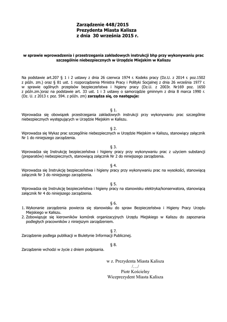 Zarządzenie 448/2015 Prezydenta Miasta Kalisza z dnia 30 września 2015 r. w sprawie wprowadzenia i przestrzegania zakładowych instrukcji bhp przy wykonywaniu prac szczególnie niebezpiecznych w Urzędzie Miejskim w Kaliszu Na podstawie art.207 § 1 i 2 ustawy z dnia 26 czerwca 1974 r. Kodeks pracy (Dz.U. z 2014 r. poz.1502 z późn. zm.) oraz § 81 ust. 1 rozporządzenia Ministra Pracy i Polityki Socjalnej z dnia 26 września 1977 r. w sprawie ogólnych przepisów bezpieczeństwa i higieny pracy (Dz.U. z 2003r. Nr169 poz. 1650 z późn.zm.)oraz na podstawie art. 33 ust. 1 i 3 ustawy o samorządzie gminnym z dnia 8 marca 1990 r. (Dz. U. z 2013 r. poz. 594. z późn. zm) zarządza się, co następuje: § 1. Wprowadza się obowiązek przestrzegania zakładowych instrukcji przy wykonywaniu prac szczególnie niebezpiecznych występujących w Urzędzie Miejskim w Kaliszu. § 2. Wprowadza się Wykaz prac szczególnie niebezpiecznych w Urzędzie Miejskim w Kaliszu, stanowiący załącznik Nr 1 do niniejszego zarządzenia. § 3. Wprowadza się Instrukcję bezpieczeństwa i higieny pracy przy wykonywaniu prac z użyciem substancji (preparatów) niebezpiecznych, stanowiącą załącznik Nr 2 do niniejszego zarządzenia. § 4. Wprowadza się Instrukcję bezpieczeństwa i higieny pracy przy wykonywaniu prac na wysokości, stanowiącą załącznik Nr 3 do niniejszego zarządzenia. § 5. Wprowadza się Instrukcję bezpieczeństwa i higieny pracy na stanowisku elektryka/konserwatora, stanowiącą załącznik Nr 4 do niniejszego zarządzenia. § 6. 1. Wykonanie zarządzenia powierza się stanowisku do spraw Bezpieczeństwa i Higieny Pracy Urzędu Miejskiego w Kaliszu. 2. Zobowiązuje się kierowników komórek organizacyjnych Urzędu Miejskiego w Kaliszu do zapoznania podległych pracowników z niniejszym zarządzeniem. § 7. Zarządzenie podlega publikacji w Biuletynie Informacji Publicznej. § 8. Zarządzenie wchodzi w życie z dniem podpisania. w z. Prezydenta Miasta Kalisza /…/ Piotr Kościelny Wiceprezydent Miasta Kalisza Załącznik Nr 1 do Zarządzenia Nr 448/2015 Prezydenta Miasta Kalisza z dnia 30 września 2015 r. Wykaz prac szczególnie niebezpiecznych w Urzędzie Miejskim w Kaliszu Prace szczególnie niebezpieczne mogą być wykonywane tylko przez osoby odpowiednio przeszkolone w zakresie bezpieczeństwa i higieny pracy, bez przeciwwskazań lekarskich do wykonywania prac tego typu. WYKAZ PRAC SZCZEGÓLNIE NIEBEZPIECZNYCH W URZĘDZIE MIEJSKIM W KALISZU Lp. Rodzaj pracy Stanowisko 1 Prace na powierzchni znajdującej się na wysokości co najmniej 1,0 m nad poziomem podłogi lub ziemi z użyciem drabin Sprzątaczka Konserwator Robotnik gospodarczy Archiwista 2 Praca przy ręcznym podnoszeniu i przenoszeniu ciężarów Sprzątaczka Robotnik gospodarczy Archiwista 3 Prace porządkowe w narażeniu na niebezpieczne substancje Sprzątaczka czyszczące Konserwator Robotnik gospodarczy 4 Prace montażowe, remontowe, konserwatorskie Konserwator Robotnik gospodarczy 5 Prace przy użyciu urządzeń elektrycznych takich jak: piła elektryczna do drewna, szlifierka kątowa, piła tarczowa, cykliniarka, frezarka, szlifierka taśmowa, spawarka Konserwator Robotnik gospodarczy 6 Prace przy urządzeniach elektroenergetycznych znajdujących Konserwator się całkowicie lub częściowo pod napięciem, z wyjątkiem prac polegających na wymianie w obwodach o napięciu do 1 kV bezpieczników i żarówek (świetlówek) 7 Prace w narażeniu na poparzenia podczas pracy w pobliżu gorących powierzchni Konserwator Robotnik gospodarczy 8 Obsługa ksero Pracownik poligrafii 9 Praca w trudnych warunkach atmosferycznych i nie zawsze bezpiecznym środowisku Gońcy 10 Transport Kierowca w z. Prezydenta Miasta Kalisza /…/ Piotr Kościelny Wiceprezydent Miasta Kalisza Załącznik Nr 2 do Zarządzenia Nr 448/2015 Prezydenta Miasta Kalisza z dnia 30 września 2015 r. Instrukcja bezpieczeństwa i higieny pracy przy wykonywaniu prac z użyciem substancji (preparatów) niebezpiecznych 1. Cel instrukcji: Opanowanie prawidłowych zasad bezpieczeństwa i higieny pracy związanych z użyciem substancji niebezpiecznych. 2. Wymagania: Na stanowisku pracy mogą być zatrudnieni pracownicy, którzy: 1) mają ukończone 18 lat, 2) zostali przeszkoleni w zakresie zasad bhp i ergonomii przy pracach związanych z użyciem substancji niebezpiecznych, 3) posiadający aktualne badania lekarskie bez przeciwwskazań do ww. prac, 4) wykazują się znajomością instrukcji oraz zapoznali się z kartami charakterystyki stosowanych substancji niebezpiecznych, 5) ubrani w odzież i obuwie robocze oraz środki ochrony indywidualnej przydzielone do stanowiska. 3. Zakazy obowiązujące na stanowisku pracy: 1) spożywanie posiłków na stanowisku pracy, 2) palenie tytoniu, 3) prowadzenie rozmów telefonicznych, 4) używanie ognia. Niedopuszczalne jest: 1) używanie substancji niebezpiecznych bez stosowania odpowiednich ochron osobistych (np. rękawice ochronne, półmaski), 2) używanie jednocześnie substancji, które w wyniku zmieszania uwalniać mogą toksyczne gazy lub spowodować oparzenia skórne, 3) zostawianie ww. środków w miejscach ogólnodostępnych (toalety, łazienki, pomieszczenia biurowe itp.). 4. Magazynowanie Składować w chłodnych pomieszczeniach (magazynach), zabezpieczonych przed działaniem promieni słonecznych i dobrze wentylowanych. Trzymać pojemniki szczelnie zamknięte. Zamykać pojemniki po użyciu lub opróżnieniu. Przechowywać w oryginalnie zamkniętych opakowaniach z dala od urządzeń i narzędzi iskrzących. 5. Podstawowe czynności przed rozpoczęciem pracy: Pracownik powinien: 1) sprawdzić kompletność wyposażenia na stanowisku pracy, 2) sprawdzić termin ważności stosowanych substancji. 6. Zasady i sposoby bezpiecznego wykonywania pracy: Pracownik powinien: 1) stosować odzież roboczą, obuwie robocze oraz środki ochrony indywidualnej przewidziane w zakładowej tabeli norm ich przydziału oraz w kartac
