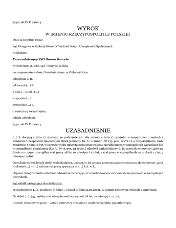 Sygn. akt IV U 210/14 WYROK W IMIENIU RZECZYPOSPOLITEJ POLSKIEJ Dnia 14 kwietnia 2014r. Sąd Okręgowy w Zielonej Górze IV Wydział Pracy i Ubezpieczeń Społecznych w składzie: Przewodniczący SSO Hanna Rawska Protokolant: st. sekr. sąd. Henryka Wolska po rozpoznaniu w dniu 7 kwietnia 2014r. w Zielonej Górze odwołania L. B. od decyzji (...) Z. z dnia (...) znak: (...) w sprawie L. B. przeciwko (...) Z. o emeryturę wcześniejszą oddala odwołanie Sygn. akt IV U 210/14 UZASADNIENIE (...) Z. decyzją z dnia 17.12.2013r. na podstawie art. 184 ustawy z dnia 17.12.1998r. o emeryturach i rentach z Funduszu Ubezpieczeń Społecznych (tekst jednolity Dz. U. z 2009r. Nr 153, poz. 1227) i § 4 rozporządzenia Rady Ministrów z 7.02.1983r. w sprawie wieku emerytalnego pracowników zatrudnionych w szczególnych warunkach lub w szczególnych charakterze (Dz. U. Nr 8, poz. 43 ze zm.) odmówił wnioskodawcy L. B. prawa do emerytury, gdyż na dzień 1.01.1999r. ma ogólny staż pracy 28 lat 10 miesięcy i 27 dni, a staż pracy w szczególnych warunkach 11 lat, 3 miesiące i 2 dni. Odwołanie od tej decyzji złożył wnioskodawca, wnosząc o jej zmianę przez przyznanie mu prawa do emerytury, gdyż w okresie (...) – (...) wykonywał pracę spawacza w (...) S.A. w Z.. Organ rentowy wniósł o oddalenie odwołania zarzucając, że wnioskodawca w w/w okresie nie pracował w szczególnych warunkach. Sąd ustalił następujący stan faktyczny: Wnioskodawca L. B. urodzony w dniu (...) złożył w dniu 12.12.2013r. w organie rentowym wniosek o emeryturę. Na dzień (...). jego ogólny staż ubezpieczeniowy wynosi 28 lat, 10 miesięcy i 27 dni, (dowód: świadectwa pracy – akta o emeryturę oraz akta o ustalenie kapitału początkowego). Organ rentowy przyjął pracę wnioskodawcy w szczególnych warunkach w wymiarze 11 lat, 3 miesiące i 2 dni, (dowód: świadectwa wykonywania pracy w szczególnych warunkach k. 21-24 i 28-41 tom II akt o emeryturę). Wnioskodawca w okresie od (...). do (...) pracował w (...) Zakładach (...) w N.. W świadectwie pracy podano stanowisko frezer, (dowód: świadectwo pracy k. 19 tom II akt o emeryturę). W zakładach tych wnioskodawca wykonywał prace w szczególnych warunkach polegające na wybijaniu, oczyszczaniu i wykańczaniu odlewów na stanowisku operatora maszyn do obróbki wiórowej, odlewów żeliwnych-frezera w okresach (...) (dowód: świadectwa pracy w szczególnych warunkach k. 21-23 tom II akt o emeryturę). Te okresy pracy organ rentowy uwzględnił wnioskodawcy do stażu pracy w szczególnych warunkach, (dowód: karta przebiegu zatrudnienia k. 19 i decyzja k. 17 akt o emeryturę). Wnioskodawca w okresie od dnia (...) do dnia (...) odbywał zasadniczą służbę wojskową. Po odbyciu służby wojskowej powrócił do tej samej pracy, którą wykonywał stale i w pełnym zakresie przed wcieleniem do jej odbycia, (dowód: zeznania wnioskodawcy k. 28). W dniu 3.09.1975r. wnioskodawca złożył podanie w (...) Przedsiębiorstwie (...) w Z. o zatrudnienie go w charakterze ślusarza. W dniu 15.09.1975r. została zawarta umowa o pracę na okres próbny, a 1.10.1975r. na czas nieokreślony i wnioskodawcy powierzono obowiązku ślusarza, (dowód: podanie k. 10, umowy o pracę k. 19, 20, angaże k. 23, 24 akt osobowych). Pracodawca uwzględniając prośbę przełożonego o podwyższenie wynagrodzenia wnioskodawcy z dniem 1.04.1977r. zaszeregował go do wyższej stawki i stanowiska ślusarz-spawacz. Pracę na tym stanowisku wnioskodawca wykonywał do dnia 30.09.1986r., (dowód: podanie k. 25, angaże k. 26-34 akt osobowych). Wnioskodawca nie miał uprawnień spawalniczych i nie mógł pracować jako spawacz. Jako ślusarz wykonywał takie prace ślusarskie jak: cięcie na maszynie metali, trasowanie, docinanie, dopasowywanie, łączenie elementów. Wykonywał jedynie drobne prace spawalnicze. W tym czasie przedsiębiorstwo wykonywało konstrukcje metalowe takie jak: kominy stalowe, rurociągi, kolana. Wnioskodawca wykonywał prace w brygadzie ślusarskiej, przy czym prace ślusarskie wykonywał w 90 % czasu pracy, a spawalnicze w 10 % czasu pracy, (dowód: zeznania świadków S. J. k. 13 i R. K. k. 14 oraz zeznania wnioskodawcy k. 28). Po odbyciu szkolenia wnioskodawca uzyskał z dniem 31.03.1984r. książkę spawacza. Przedsiębiorstwo zatrudniło wnioskodawcę z dniem 1.10.1986r. na stanowisku spawacza, (dowód: angaże k. 35, 36 akt osobowych i książka spawacza k. 20-27). Wnioskodawca został skierowany do pracy w charakterze spawacza na budowy eksportowe do NRD w okresach od (...). do (...). i od (...) do (...) Podjęcie tej pracy następowało w oparciu o umowy o pracę zawarte w dniach: 12.01.1988r. i 30.12.1988r. pomiędzy (...) Przedsiębiorstwem (...) w Z. a wnioskodawcą, (dowód: angaże k. 35, 36, umowy o pracę k. 39-46 akt osobowych). W okresie od (...) wnioskodawca pracował stale i w pełnym wymiarze czasu pracy w charakterze spawacza, (dowód: zeznania świadków: S. J. k. 13 i R. K. k. 14 oraz zeznania wnioskodawcy k. 28). Po powrocie z budowy eksportowej z dniem 1.07.1989r. wnioskodawca został zatrudniony w charakterze ślusarzabrygadzisty, wykonując tę pracę do dnia 20.06.1992r., (dowód: angaże k. 47-63, 67, 68 akt osobowych). W oparciu o umowę o pracę z (...) wnioskodawca został zatrudniony w charakterze spawacza na budowie eksportowej w NRD w okresie od (...) do (...) Po powrocie do kraju z wyłączeniem okresu zwolnienia chorobowego wnioskodawca pracował jako spawacz od (...) do(...) (dowód: umowa o pracę i aneks k. 70-72, karta zjazdowa k. 73, 74 i pismo wnioskodawcy k. 78 akt osobowych). (...) S.A. Z. stwierdził w świadectwie pracy, że wnioskodawca był zatrudniony w okresie od (...) do (...) w pełnym wymiarze czasu pracy, zajmował stanowisko ślusarz-spawacz, ostatnio stanowisko spawacz, (dowód: świadectwo pracy k. 7 akt osobowych i k. 28 tom II akt o emeryturę). (...) S.A. Z. stwierdził w świadectwie wykonywania pra