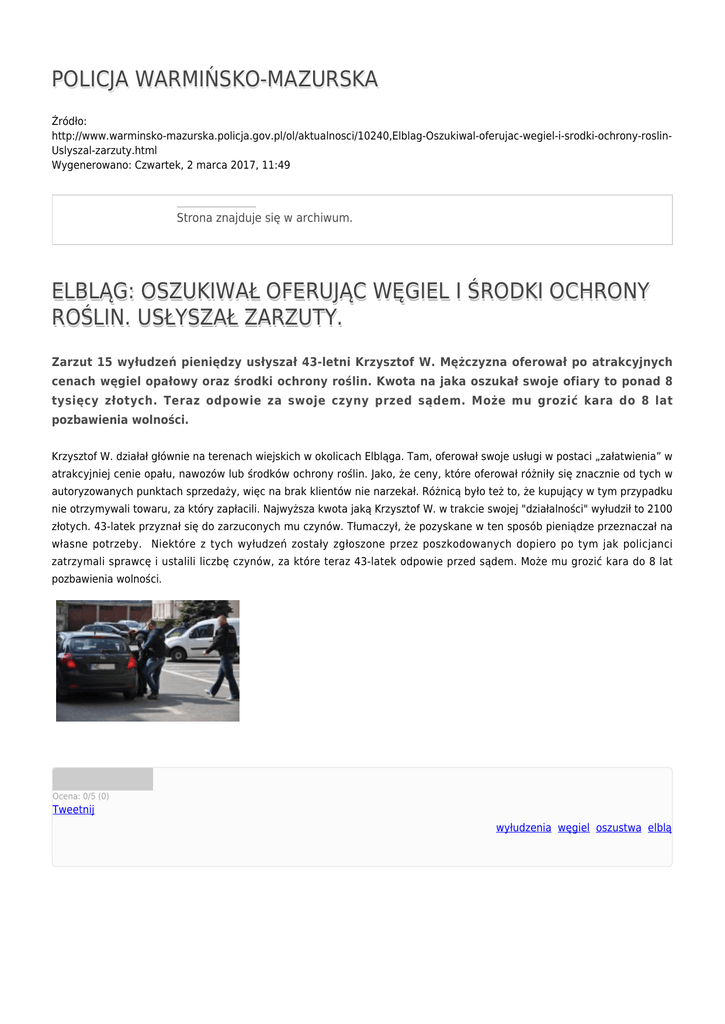 POLICJA WARMIŃSKO-MAZURSKA Źródło: http://www.warminsko-mazurska.policja.gov.pl/ol/aktualnosci/10240,Elblag-Oszukiwal-oferujac-wegiel-i-srodki-ochrony-roslinUslyszal-zarzuty.html Wygenerowano: Czwartek, 2 marca 2017, 11:49 Strona znajduje się w archiwum. ELBLĄG: OSZUKIWAŁ OFERUJĄC WĘGIEL I ŚRODKI OCHRONY ROŚLIN. USŁYSZAŁ ZARZUTY. Zarzut 15 wyłudzeń pieniędzy usłyszał 43-letni Krzysztof W. Mężczyzna oferował po atrakcyjnych cenach węgiel opałowy oraz środki ochrony roślin. Kwota na jaka oszukał swoje ofiary to ponad 8 tysięcy złotych. Teraz odpowie za swoje czyny przed sądem. Może mu grozić kara do 8 lat pozbawienia wolności. Krzysztof W. działał głównie na terenach wiejskich w okolicach Elbląga. Tam, oferował swoje usługi w postaci „załatwienia” w atrakcyjniej cenie opału, nawozów lub środków ochrony roślin. Jako, że ceny, które oferował różniły się znacznie od tych w autoryzowanych punktach sprzedaży, więc na brak klientów nie narzekał. Różnicą było też to, że kupujący w tym przypadku nie otrzymywali towaru, za który zapłacili. Najwyższa kwota jaką Krzysztof W. w trakcie swojej "działalności" wyłudził to 2100 złotych. 43-latek przyznał się do zarzuconych mu czynów. Tłumaczył, że pozyskane w ten sposób pieniądze przeznaczał na własne potrzeby. Niektóre z tych wyłudzeń zostały zgłoszone przez poszkodowanych dopiero po tym jak policjanci zatrzymali sprawcę i ustalili liczbę czynów, za które teraz 43-latek odpowie przed sądem. Może mu grozić kara do 8 lat pozbawienia wolności. Ocena: 0/5 (0) Tweetnij wyłudzenia, węgiel, oszustwa, elblą