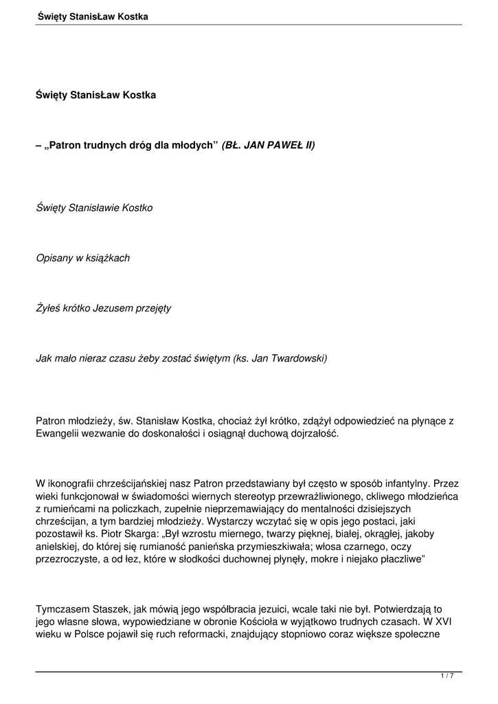 Święty StanisŁaw Kostka Święty StanisŁaw Kostka – „Patron trudnych dróg dla młodych” (BŁ. JAN PAWEŁ II) Święty Stanisławie Kostko Opisany w książkach Żyłeś krótko Jezusem przejęty Jak mało nieraz czasu żeby zostać świętym (ks. Jan Twardowski) Patron młodzieży, św. Stanisław Kostka, chociaż żył krótko, zdążył odpowiedzieć na płynące z Ewangelii wezwanie do doskonałości i osiągnął duchową dojrzałość. W ikonografii chrześcijańskiej nasz Patron przedstawiany był często w sposób infantylny. Przez wieki funkcjonował w świadomości wiernych stereotyp przewrażliwionego, ckliwego młodzieńca z rumieńcami na policzkach, zupełnie nieprzemawiający do mentalności dzisiejszych chrześcijan, a tym bardziej młodzieży. Wystarczy wczytać się w opis jego postaci, jaki pozostawił ks. Piotr Skarga: „Był wzrostu miernego, twarzy pięknej, białej, okrągłej, jakoby anielskiej, do której się rumianość panieńska przymieszkiwała; włosa czarnego, oczy przezroczyste, a od łez, które w słodkości duchownej płynęły, mokre i niejako płaczliwe” Tymczasem Staszek, jak mówią jego współbracia jezuici, wcale taki nie był. Potwierdzają to jego własne słowa, wypowiedziane w obronie Kościoła w wyjątkowo trudnych czasach. W XVI wieku w Polsce pojawił się ruch reformacki, znajdujący stopniowo coraz większe społeczne 1/7 Święty StanisŁaw Kostka poparcie. Wtedy to kilkunastoletni Stanisław Kostka tak pisał o Kościele: „Kościół zwycięża, gdy jest ranny”. „Kościół rozumie się wtedy, gdy się go poznaje”. „Kościół wychodzi naprzeciw, gdy się go pragnie”. „Nie tylko lekkomyślnością, ale zbrodnią jest wierzyć komukolwiek z ludzi, jeśli jego nauka nie jest zgodna z orzeczeniem Kościoła. Gdybyśmy byli zdani na sądy ludzi, byśmy żyli w chaosie. Trzeba byłoby porzucić wszelką prawdę i wiarę, oddać się rozpaczy i rozstać z tym światem. Odrzucić naukę Kościoła to szukać po omacku. Chrystus umarł za swą Oblubienicę – Kościół. Dał mu mądrość i prawdę”. Te słowa ukazują zupełnie inne oblicze Świętego. Wcale nie był wątłym, egzaltowanym młodzieńcem z wypiekami na twarzy. Był mężny, a na dodatek wysportowany. Chcąc zrealizować swe powołanie, św. Stanisław wybrał się pieszo najpierw do Dylingi w Bawarii, a następnie dotarł – przez Alpy i Apeniny – aż do Rzymu. Przeszedł zatem 1500 km. To raczej dojrzały, świadomy i pewny swych racji młody człowiek, który potrafił uważnie obserwować świat i Kościół oraz wyciągać mądre wnioski, a potem wcielać je w życie. Dlatego „żyjąc krótko, przeżył czasów wiele” (Księga Mądrości). Z Rostkowa do Wiednia Stanisław Kostka przyszedł na świat w 1550 r. w Rostkowie pod Przasnyszem na Mazowszu, które w trudnych czasach reformacji pozostało wierne Kościołowi katolickiemu. Rodzice chłopca pochodzili ze znakomitych rodów. Ojciec był kasztelanem zakroczymskim, a matka – siostrą wojewody mazowieckiego i posła. Tuż po otrzymaniu sakramentu chrztu Staszek został położony na stopniach ołtarza przed Najświętszym Sakramentem i ofiarowany Bogu. 2/7 Święty StanisŁaw Kostka Paweł, brat Staszka, tak wspominał dom rodzinny: „Rodzice chcieli, byśmy byli wychowani w wierze katolickiej, zaznajomieni z katolickimi dogmatami, a nie oddawali się rozkoszom. Postępowali z nami ostro i twardo, napędzali nas zawsze – sami, jak i przez domowników – do wielkiej pobożności, skromności, uczciwości, tak żeby nikt z otoczenia, z licznej również służby, nie mógł się na nas skarżyć o rzecz nawet najmniejszą. Wszystkim tak jak rodzicom wolno było nas napominać, wszystkich tak jak rodziców czciliśmy”. Stanisław był niezwykle wrażliwym i pobożnym dzieckiem. Zdarzało się, że z tego powodu doznawał szykan ze strony rówieśników. Było to – jak pisze ks. Skarga – „domowe męczeństwo”. Ojciec Staszka często napominał gości, by w obecności syna uważali na słowa, bo wrażliwy chłopiec nie znosił wulgaryzmów oraz nieprzyzwoitych żartów i gdy je słyszał, mógł stracić przytomność. W domu rodzinnym Staszek przebywał do czternastego roku życia. Następnie rodzice postanowili wysłać synów na studia za granicę. Staszek i Paweł wyjechali do Wiednia, gdzie niedawno jezuici założyli szkołę, która szybko zyskiwała dobrą sławę wśród polskiej szlachty. Po kilkumiesięcznym pobycie w jezuickim internacie bracia musieli się przenieść na stancję. Właściciel nowej kwatery był luteraninem i nie życzył sobie w swoim domu wizyt księży katolickich. Staszkowi było trudno przystosować się do tego wymagania. W jezuickiej szkole Staszek mógł się rozwijać zgodnie ze swoimi poglądami. Regulamin gimnazjum wyraźnie przypominał: „Taką pobożnością, taką skromnością i takim poznaniem przedmiotów niech się uczniowie starają ozdobić swój umysł, aby się mogli podobać Bogu i ludziom pobożnym, a w przyszłości ojczyźnie i sobie samym przynieść także korzyść”. Jezuicka młodzież poddana była surowemu rygorowi: dzień rozpoczynał się o 5 rano i aż do wieczora wypełniony był nauką i modlitwą. Zupełnie inaczej niż to jest dzisiaj wśród młodzieży. Ale z pewnością wspólne jest to, że Staszek miał podobne trudności w zdobywaniu wiedzy jak jego liczni koledzy. Początkowo był słaby, miał duże zaległości z łaciny i greki oraz problemy z językiem niemieckim. Jego wypracowania roiły się od błędów. Można je zobaczyć w zeszytach, jakie po nim pozostały. Nie poddając się zniechęceniu z powodu trudności, systematycznie pracował, sumiennie prowadził notatki i szybko znalazł się w gronie najlepszych uczniów. Jednocześnie prowadził bogate życie duchowe, często się modlił, praktykował ascezę, czyli ustawiczną pracę nad sobą, wysiłek, ćwiczenie, walkę „traceni