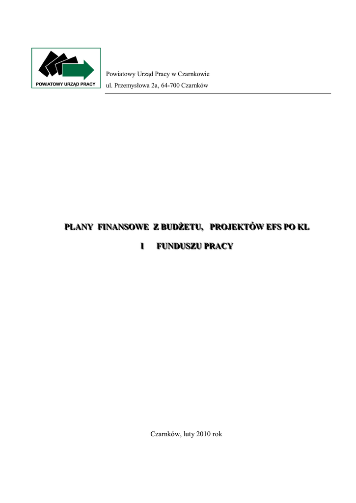 Powiatowy Urząd Pracy w Czarnkowie ul. Przemysłowa 2a, 64-700 Czarnków PPL LA AN NY Y FFIIN NA AN NSSO OW WE EZ ZB BU UD DŻ ŻE ET TU U,, PPR RO OJJE EK KT TÓ ÓW WE EFFSS PPO OK KL L II FFU UN ND DU USSZ ZU U PPR RA AC CY Y Czarnków, luty 2010 rok Powiatowy Urząd Pracy w Czarnkowie realizuje zadania na podstawie ustawy z dnia 20 kwietnia 2004 roku o promocji zatrudnienia i instytucjach rynku pracy ( Dz. U. Nr 69, poz.415 z 2008 r.), stosując ustawę z dnia 27 sierpnia 2009 r. o finansach publicznych (Dz.U. Nr 157,poz.1240 z późn.zm.). Fundusz Pracy jest państwowym funduszem celowym przeznaczonym na zasiłki dla bezrobotnych i aktywizację zawodową osób bezrobotnych. Głównym dysponentem środków Funduszu Pracy jest Minister Pracy i Polityki Społecznej , który przekazuje samorządom powiatowym środki obligatoryjnie do wysokości potrzeb związanych z wypłatą zasiłków dla bezrobotnych i dodatków aktywizacyjnych , natomiast na wydatki związane z realizacją programów na rzecz promocji zatrudnienia, łagodzenia skutków bezrobocia i aktywizacji zawodowej osób bezrobotnych, środki są limitowane do wysokości wynikającej z algorytmu ich podziału, który uwzględnia poziom i strukturę bezrobotnych w poszczególnych powiatach. Powiatowy Urząd Pracy w Czarnkowie na dzień 23.02.2010r dysponuje kwotą środków w wysokości 6.594.359 zł. z tego: I. Budżet - Uchwała Rady Powiatu Nr XXXIX/276/2009 z dnia 26.01.2010 r. 5.168.459 zł. uwzględniająca zmiany. - środki na utrzymanie urzędu - 2.014.717 zł. - finansowanie kosztów wynagrodzeń i składki na ubezpieczenie społeczne pracowników urzędu - 399.200 zł. - finansowanie składki na ubezpieczeni zdrowotne osób bezrobotnych bez prawa do zasiłku – 2.633.600 zł. - Projekt EFS PO KL 6.1.2 – dotacja rozwojowa - 120.942 zł. II. Środki Funduszu Pracy na realizację programów na rzecz promocji zatrudnienia, łagodzenia skutków bezrobocia i aktywizacji zawodowej osób bezrobotnych w tym: - do czasu wydania decyzji na podstawie ustawy budżetowej na rok 2010 , Minister Pracy i Polityki Społecznej określił kwotę środków Funduszu Pracy na pierwsze półrocze 2010 roku w wysokości 1.425.900 zł. III. Środki Funduszu Pracy na finansowanie innych fakultatywnych zadań - I. 1.425.900 zł. - brak decyzji Ministra Pracy i Polityki Społecznej o przyznaniu środków na Fundusz Pracy dot. finansowania innych fakultatywnych zadań. Środki budżetowe w wysokości : 5.168.459 zł. Plan finansowy budżetu działalności podstawowej Powiatowego Urzędu Pracy w Czarnkowie na 2010rok Paragraf Nazwa paragrafu Plan finansowy 2010 rok 3020 Nagrody i wydatki osobowe nie zaliczane do wynagrodzeń 3.920 4010 Wynagrodzenia osobowe pracowników 4040 Dodatkowe wynagrodzenie roczne 119.010 4110 Składki na ubezpieczenie społeczne 191.161 1.292.233 4120 Składka na Fundusz Pracy 31.016 4210 Zakup materiałów i wyposażenia 4260 Zakup energii 86.800 4270 Zakup usług remontowych 12.250 4280 Zakup usług zdrowotnych 700 4300 Zakup usług pozostałych 17.300 4360 Opłaty z tyt. zakupu usług telekomunikacyjnych telefonii komórkowe 2.800 4370 Opłaty z tyt. zakupu usług telekomunikacyjnych telefonii stacjonarnej 12.000 4440 Opłaty za administrowanie i czynsze za budynki, lokale i pomieszczenia garażowe 68.400 4410 Podróże służbowe krajowe 15.000 4430 Różne opłaty i składki 4440 Odpisy na ZFŚS 4480 Podatek od nieruchomości 4520 Opłaty na rzecz budżetów jst 4700 Szkolenia pracowników niebędących członkami korpusu służby cywilnej 4750 Zakup akcesoriów do komputerów Razem : 101.225 4.400 45.002 8.700 200 2.100 500 2.014.717 Powiatowy Urząd Pracy w Czarnkowie oprócz środków finansowych przeznaczonych na utrzymanie urzędu otrzymał również środki finansowe na: 1. Finansowanie kosztów wynagrodzenia i składek na ubezpieczenie społeczne pracowników urzędu. 2. Projekt EFS PO KL/06.02-30-025/09 pod nazwą „Stawiamy na jakość – Priorytet VI – Rynek pracy otwarty dla wszystkich, działanie 6.1 – Poprawa dostępu do zatrudnienia oraz wspieranie aktywności zawodowej w regionie, poddziałanie 6.1.2 – Wsparcie powiatowych i wojewódzkich urzędów pracy w realizacji zadań na rzecz aktywizacji zawodowej osób bezrobotnych w regionie. 3. Zadania zlecone - składka na ubezpieczenie zdrowotne osób bezrobotnych bez prawa do zasiłku. 1. Finansowanie kosztów wynagrodzenia i składek na ubezpieczenie społeczne pracowników urzędu. W planie finansowym wydatków budżetowych, Powiatowy Urząd Pracy w Czarnkowie otrzymał środki na finansowanie wynagrodzeń dla pracowników urzędu. Środki finansowe zostały zagwarantowane urzędom pracy na podstawie art.9 ust.2a-2c ustawy z dnia 20 kwietnia 2004r. o promocji zatrudnienia i instytucjach rynku pracy ( Dz.U. z 2008 Nr 69, poz.415 z późn.zm.) i stanowią 7% kwoty środków Funduszu Pracy ustalonej na rok poprzedni na realizację programów na rzecz promocji zatrudnienia, łagodzenia skutków bezrobocia i aktywizacji zawodowej z wyłączeniem kwot przyznanych z rezerwy dysponenta Funduszu Pracy. Kwota środków na wynagrodzenia i składki na ubezpieczenie społeczne od wynagrodzeń przekazywana jest przez Ministerstwo Pracy i Polityki Społecznej w okresach miesięcznych w wysokości 1/12 kwoty ustalonej na dany rok - na rachunek bankowy Starostwa Powiatowego, następnie Starostwo Powiatowe przekazuje powyższe środki urzędowi pracy. Plan finansowy na 2010 rok Plan finansowy Paragraf Nazwa paragrafu na 2010 rok w zł. 4010 Wynagrodzenia osobowe pracowników 4110 Składki na ubezpieczenie społeczne 346.800 52.400 Razem : 399.200 2. Projekt współfinansowany ze środków budżetu Unii Europejskiej w ramach Europejskiego Funduszu Społecznego - Program Operacyjny Kapitał Ludzki, realizowany przez Powiatowy Urząd Pracy w Czarnkowie pod nazwą „Stawiamy na jakość” - poddziałanie 6.1.2. Termin realizacji: od 01.01.2010 roku do 31.12.2012 r