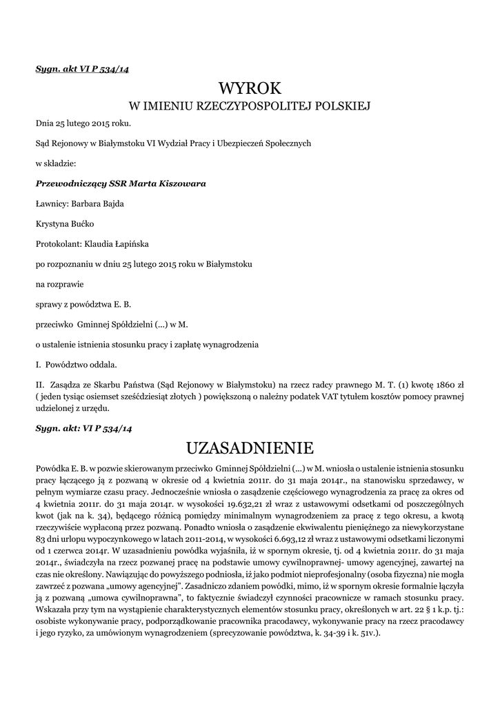 Sygn. akt VI P 534/14 WYROK W IMIENIU RZECZYPOSPOLITEJ POLSKIEJ Dnia 25 lutego 2015 roku. Sąd Rejonowy w Białymstoku VI Wydział Pracy i Ubezpieczeń Społecznych w składzie: Przewodniczący SSR Marta Kiszowara Ławnicy: Barbara Bajda Krystyna Bućko Protokolant: Klaudia Łapińska po rozpoznaniu w dniu 25 lutego 2015 roku w Białymstoku na rozprawie sprawy z powództwa E. B. przeciwko Gminnej Spółdzielni (...) w M. o ustalenie istnienia stosunku pracy i zapłatę wynagrodzenia I. Powództwo oddala. II. Zasądza ze Skarbu Państwa (Sąd Rejonowy w Białymstoku) na rzecz radcy prawnego M. T. (1) kwotę 1860 zł ( jeden tysiąc osiemset sześćdziesiąt złotych ) powiększoną o należny podatek VAT tytułem kosztów pomocy prawnej udzielonej z urzędu. Sygn. akt: VI P 534/14 UZASADNIENIE Powódka E. B. w pozwie skierowanym przeciwko Gminnej Spółdzielni (...) w M. wniosła o ustalenie istnienia stosunku pracy łączącego ją z pozwaną w okresie od 4 kwietnia 2011r. do 31 maja 2014r., na stanowisku sprzedawcy, w pełnym wymiarze czasu pracy. Jednocześnie wniosła o zasądzenie częściowego wynagrodzenia za pracę za okres od 4 kwietnia 2011r. do 31 maja 2014r. w wysokości 19.632,21 zł wraz z ustawowymi odsetkami od poszczególnych kwot (jak na k. 34), będącego różnicą pomiędzy minimalnym wynagrodzeniem za pracę z tego okresu, a kwotą rzeczywiście wypłaconą przez pozwaną. Ponadto wniosła o zasądzenie ekwiwalentu pieniężnego za niewykorzystane 83 dni urlopu wypoczynkowego w latach 2011-2014, w wysokości 6.693,12 zł wraz z ustawowymi odsetkami liczonymi od 1 czerwca 2014r. W uzasadnieniu powódka wyjaśniła, iż w spornym okresie, tj. od 4 kwietnia 2011r. do 31 maja 2014r., świadczyła na rzecz pozwanej pracę na podstawie umowy cywilnoprawnej- umowy agencyjnej, zawartej na czas nie określony. Nawiązując do powyższego podniosła, iż jako podmiot nieprofesjonalny (osoba fizyczna) nie mogła zawrzeć z pozwana „umowy agencyjnej”. Zasadniczo zdaniem powódki, mimo, iż w spornym okresie formalnie łączyła ją z pozwaną „umowa cywilnoprawna”, to faktycznie świadczył czynności pracownicze w ramach stosunku pracy. Wskazała przy tym na wystąpienie charakterystycznych elementów stosunku pracy, określonych w art. 22 § 1 k.p. tj.: osobiste wykonywanie pracy, podporządkowanie pracownika pracodawcy, wykonywanie pracy na rzecz pracodawcy i jego ryzyko, za umówionym wynagrodzeniem (sprecyzowanie powództwa, k. 34-39 i k. 51v.). Pozwana Gminna Spółdzielnia (...) w M. wniosła o oddalenie powództwa w całości i zasądzenie od powódki na jej rzecz kosztów postępowania, w tym kosztów zastępstwa procesowego według norm przepisanych. W uzasadnieniu swojego stanowiska pozwana nie kwestionowała, że zawarta między stronami umowa z dnia 4 kwietnia 2011r., ze względu na ograniczenia podmiotowe, nie jest umową agencyjną. Podkreśliła jednak, że ze względu na zgodne oświadczenia woli obu stron, cechy tejże umowy, a także sposób jej wykonywania, jest to nadal umowa cywilnoprawna, a stosunek prawny powstały w wyniku jej zawarcia nie może być zakwalifikowany jako stosunek pracy. Strona pozwana wskazała przykładowo, że powódka samodzielnie dysponowała swoim czasem pracy, nie była zobowiązana do osobistego świadczenia pracy, jak również nie wystąpił element bieżącego podporządkowania pracownika pracodawcy (k. 64-66). Sąd Rejonowy ustalił i zważył, co następuje: Bezsporne jest, że powódka w dniu 4 kwietnia 2011 r. zawarła z pozwaną umowę agencyjną, w ramach której podjęła się prowadzenia sprzedaży w Punkcie Sprzedaży Pomocniczej (skrót: (...)) w W., tj. w lokalu handlowym należącym do Gminnej Spółdzielni (...) w M. (k. 5-9). Zawarcie przedmiotowej umowy poprzedzone było podaniem powódki, w którym zwróciła się do pozwanej z prośba o zatrudnienie na podstawie umowy agencyjnej, w charakterze sprzedawcy, w sklepie w W. (k. 19). Faktem pozostaje przy tym, że w dniu podpisania w/w umowy E. B. skierowała do Zarządu Gminnej Spółdzielni (...) w M. pismo, w którym zgłaszała chęć samodzielnego regulowania czasu swojej pracy, w „zależności od rotacji klientów sklepu”. Przedmiotowe pismo uzyskało akceptację Zarządu (k. 20). Z tytułu zawartej umowy powódka podlegała dobrowolnemu ubezpieczeniu chorobowemu, oraz obowiązkowym ubezpieczeniom rentowym oraz emerytalnemu, a pozwana odprowadzała z tego tytułu składki do ZUS (por. § 11 umowy, k. 7). Poza sporem pozostaje również, że w dniach 16- 20 maja 2014r. u pozwanej przeprowadzona została kontrola Państwowej Inspekcji Pracy, Okręgowego Inspektora Pracy w B.. W wyniku przeprowadzonej kontroli nie stwierdzono, aby warunki wykonywania zadań w ramach zawartej między stronami umowy agencyjnej nosiły cechy stosunku pracy. Strony postępowania nie kwestionowały przy tym, że do rozwiązania umowy agencyjnej, będącej przedmiotem niniejszego postępowania, doszło z inicjatywy powódki, która w dniu 19 maja 2014r. złożyła do Zarządu Gminnej Spółdzielni (...) w M. podanie, z prośbą o „rozwiązanie umowy agencyjnej na prowadzenie sklepu w trybie szybkim, najpóźniej do 31 maja 2014r.” Jednocześnie w treści podania zastrzegła, że „nie wnosi żadnych pretensji do spółdzielni, odnośnie rozwiązania umowy” (k. 22). Spór w rozpoznawanej sprawie sprowadzał się do oceny jaki charakter miał stosunek łączący strony w okresie od 4 kwietnia 2011r. do 31 maja 2014r.– czy jak twierdzi pozwany było to stosunek cywilnoprawny, czy stosownie do stanowiska powódki był to stosunek pracy, zawarty na podstawie umowy o pracę, na stanowisku sprzedawcy, w pełnym wymiarze czasu pracy. Ustalenie podstawy zatrudnienia powódki rozstrzygnie z kolei czy zasadne są jej pozostałe roszczenia, tj. o zapłatę wynagrodzenia za pracę oraz o ekwiwalentu pieniężnego za niewykorzystany urlop wypoczynkowy. Przed przystąpieniem do w