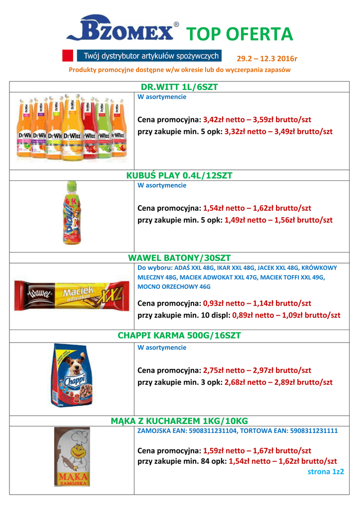 TOP OFERTA 29.2 – 12.3 2016r Produkty promocyjne dostępne w/w okresie lub do wyczerpania zapasów DR.WITT 1L/6SZT W asortymencie Cena promocyjna: 3,42zł netto – 3,59zł brutto/szt przy zakupie min. 5 opk: 3,32zł netto – 3,49zł brutto/szt KUBUŚ PLAY 0.4L/12SZT W asortymencie Cena promocyjna: 1,54zł netto – 1,62zł brutto/szt przy zakupie min. 5 opk: 1,49zł netto – 1,56zł brutto/szt WAWEL BATONY/30SZT Do wyboru: ADAŚ XXL 48G, IKAR XXL 48G, JACEK XXL 48G, KRÓWKOWY MLECZNY 48G, MACIEK ADWOKAT XXL 47G, MACIEK TOFFI XXL 49G, MOCNO ORZECHOWY 46G Cena promocyjna: 0,93zł netto – 1,14zł brutto/szt przy zakupie min. 10 displ: 0,89zł netto – 1,09zł brutto/szt CHAPPI KARMA 500G/16SZT W asortymencie Cena promocyjna: 2,75zł netto – 2,97zł brutto/szt przy zakupie min. 3 opk: 2,68zł netto – 2,89zł brutto/szt MĄKA Z KUCHARZEM 1KG/10KG ZAMOJSKA EAN: 5908311231104, TORTOWA EAN: 5908311231111 Cena promocyjna: 1,59zł netto – 1,67zł brutto/szt przy zakupie min. 84 opk: 1,54zł netto – 1,62zł brutto/szt strona 1z2 VIFON ZUPA 70G W asortymencie Cena promocyjna: 1,04zł netto – 1,09zł brutto/szt przy zakupie min. 120 szt: 0,99zł netto – 1,04zł brutto/szt PUCHATEK KAKAO 300G/10SZT EAN: 5900909000420 Cena promocyjna: 3,47zł netto – 4,27zł brutto/szt przy zakupie min. 5 opk: 3,39zł netto – 4,17zł brutto/szt PUCHATEK KAKAO 150G/10SZT EAN: 5900909000512 Cena promocyjna: 2,32zł netto – 2,85zł brutto/szt przy zakupie min. 5 opk: 2,25zł netto – 2,77zł brutto/szt EKLAND 300G TORBA/12SZT Do wyboru: malina, cytryna, multiwitamina, owoce leśne Cena promocyjna: 2,54zł netto – 2,74zł brutto/szt przy zakupie min. 5 opk: 2,49zł netto – 2,69zł brutto/szt FINESIA OLEJ UNIWERSALNY 3L/4SZT EAN: 5906823001512 Cena promocyjna: 11,29zł netto – 11,85zł brutto/szt przy zakupie min. 5 opk: 11,09zł netto – 11,64zł brutto/szt