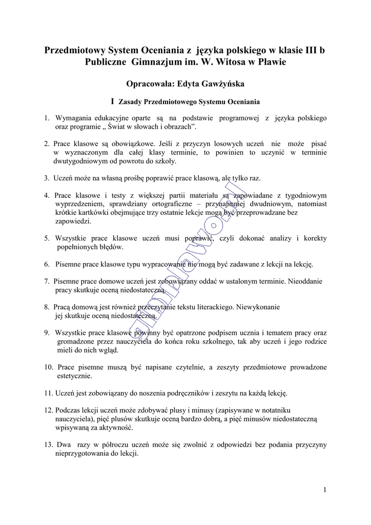 Przedmiotowy System Oceniania z języka polskiego w klasie III b Publiczne Gimnazjum im. W. Witosa w Pławie Opracowała: Edyta Gawżyńska I Zasady Przedmiotowego Systemu Oceniania 1. Wymagania edukacyjne oparte są na podstawie programowej z języka polskiego oraz programie „ Świat w słowach i obrazach”. 2. Prace klasowe są obowiązkowe. Jeśli z przyczyn losowych uczeń nie może pisać w wyznaczonym dla całej klasy terminie, to powinien to uczynić w terminie dwutygodniowym od powrotu do szkoły. 3. Uczeń może na własną prośbę poprawić prace klasową, ale tylko raz. 4. Prace klasowe i testy z większej partii materiału są zapowiadane z tygodniowym wyprzedzeniem, sprawdziany ortograficzne – przynajmniej dwudniowym, natomiast krótkie kartkówki obejmujące trzy ostatnie lekcje mogą być przeprowadzane bez zapowiedzi. 5. Wszystkie prace klasowe uczeń musi poprawić, czyli dokonać analizy i korekty popełnionych błędów. 6. Pisemne prace klasowe typu wypracowanie nie mogą być zadawane z lekcji na lekcję. 7. Pisemne prace domowe uczeń jest zobowiązany oddać w ustalonym terminie. Nieoddanie pracy skutkuje oceną niedostateczną. 8. Pracą domową jest również przeczytanie tekstu literackiego. Niewykonanie jej skutkuje oceną niedostateczną. 9. Wszystkie prace klasowe powinny być opatrzone podpisem ucznia i tematem pracy oraz gromadzone przez nauczyciela do końca roku szkolnego, tak aby uczeń i jego rodzice mieli do nich wgląd. 10. Prace pisemne muszą być napisane czytelnie, a zeszyty przedmiotowe prowadzone estetycznie. 11. Uczeń jest zobowiązany do noszenia podręczników i zeszytu na każdą lekcję. 12. Podczas lekcji uczeń może zdobywać plusy i minusy (zapisywane w notatniku nauczyciela), pięć plusów skutkuje oceną bardzo dobrą, a pięć minusów niedostateczną wpisywaną za aktywność. 13. Dwa razy w półroczu uczeń może się zwolnić z odpowiedzi bez podania przyczyny nieprzygotowania do lekcji. 1 II Obszary aktywności ucznia podlegające ocenie W przedmiotowym systemie oceniania będą oceniane następujące elementy wiedzy i umiejętności ucznia: 1. Wiedza o języku • składnia, fleksja, fonetyka, słowotwórstwo • części mowy i ich funkcje w zdaniu • nieodmienne części mowy • znaczenie i stosowanie związków frazeologicznych 2. Wiedza o literaturze • znajomość treści omawianych utworów literackich • zróżnicowanie gatunków literackich, wskazywanie ich cech charakterystycznych • elementy analizy i interpretacji • właściwe posługiwanie się terminologią • pogłębianie wiedzy poprzez docieranie do różnych źródeł (nie tylko literackich) 3. Formy wypowiedzi • poprawne redagowanie różnych form wypowiedzi: opowiadanie, opis, list, charakterystyka, rozprawka, streszczenie, notatka, wywiad, przemówienie, sprawozdanie, recenzja, protokół, wybrane formy użytkowe (życzenia, ogłoszenie, zaproszenie, dedykacja, podanie, CV) • konstruowanie wypowiedzi ustnej i doskonalenie form komunikacji • ortografia i interpunkcja • poprawność językowa, bogate słownictwo III Metody sprawdzania osiągnięć 1. • • • • • Prace pisemne podczas lekcji: co najmniej dwa sprawdziany z nauki o języku w ciągu półrocza co najmniej jedna praca klasowa w półroczu sprawdziany ortograficzno – interpunkcyjne sprawdziany gramatyczno – literackie ( w oparciu o tekst lektury) testy z kompetencji czytelniczych zawierające zadania otwarte i zamknięte (krótkiej odpowiedzi, rozszerzonej odpowiedzi, z luką, wielokrotnego wyboru, prawda – fałsz) • testy ze znajomości lektury • bieżące kartkówki sprawdzające wiadomości z nie więcej niż trzech ostatnich lekcji 2. Prace domowe: • wypracowania • ćwiczenia gramatyczne • notatki • pozostałe prace według rozkładu materiału nauczania nauczyciela 3. Udział w konkursach (klasowych, szkolnych, pozaszkolnych) 4. Dłuższe wypowiedzi ustne (na ocenę) 5. Recytacja utworów lub ich fragmentów 6. Samodzielność w zdobywaniu informacji (słowniki, encyklopedie w media) 7. Oryginalność i pomysłowość w prezentowaniu swych działań twórczych (inscenizacje, audycje, działalność plastyczna) 8. Zaangażowanie w tok lekcji, aktywność, kreatywność, umiejętność pracy zespołowej 9. Estetyka prac, zeszytu 10. Kultura języka 2 IV Kryteria oceniania wypowiedzi pisemnych 1. • • • • • 2. • • • 3. • • • • 4. • • • 5. Temat: zgodność z tematem oryginalny pomysł, trafna koncepcja pracy dobór materiału poprawność merytoryczna uwzględnienie kontekstów Kompozycja: posługiwanie się określoną formą wypowiedzi trójdzielność kompozycji spójność tekstu Język i styl: trafne i poprawne słownictwo poprawna budowa zdań poprawna odmiana wyrazów funkcjonalność stylu Ortografia, interpunkcja, zapis: poprawność ortograficzna i interpunkcyjna tekstu estetyka pracy stosowanie akapitów W przypadku błędów ortograficznych należy uwzględnić ich podział na błędy zasadnicze i drugorzędne oraz usterki. 6. Przy ocenie pracy pisemnej należy uwzględnić opinię poradni pedagogicznopsychologicznej dotyczącą specyficznych trudności w uczeniu się u dyslektyków i dysgrafików. 7. Prace klasowe z literatury oraz zadania rozszerzonej odpowiedzi należy opatrzyć komentarzem zawierającym zarówno pozytywne jak i negatywne aspekty zagadnienia. V Zróżnicowanie źródeł informacji o postępach ucznia 1. • • • Decydujący wpływ na ocenę końcową ucznia mają: samodzielne prace pisemne (prace klasowe, testy, sprawdziany, wypracowania) odpowiedzi ustne i zaangażowanie w tok lekcji oryginalność i pomysłowość w prezentowaniu działań twórczych (inscenizacje) 2. • • • • • Inne czynniki wpływające na ocenę: prace domowe estetyka zeszytu estetyka prac kultura języka recytacja 3. Sposób przekazywania informacji zwrotnej: • w skali ocen wyrażonej stopniami od 1 do