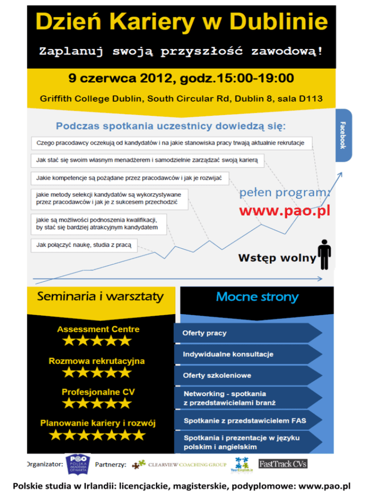 Polskie studia w Irlandii: licencjackie, magisterskie, podyplomowe: www.pao.pl Największa niepubliczna uczelnia akademicka w Polsce W ocenie Pracodawców trzecia najlepsza uczelnia w Polsce 2010 STUDIA W IRLANDII: - studia licencjackie na kierunku zarządzanie (3-letnie, po polsku, dyplom licencjata SAN), - studia magisterskie uzupełniające na kierunku Business Management we współpracy z amerykańskim Clark University (2-letnie, po polsku i angielsku, dyplom mgr SAN oraz Master Clark University), - studia podyplomowe z tłumaczeń (1 rok, dyplom studiów podyplomowych SAN), - studia podyplomowe z pedagogiki (1 rok, dyplom studiów podyplomowych SAN). Społeczna Akademia Nauk (do stycznia 2012 r. Społeczna Wyższa Szkoła Przedsiębiorczości i Zarządzania) należy do najbardziej renomowanych polskich uczelni - jest najczęściej wybieraną uczelnią niepubliczną w Polsce1 oraz pod względem liczby studentów największą niepubliczną uczelnią akademicką w Polsce 2 kształcąc obecnie 21,5 tys. osób. Uczelnia w styczniu 2012 r. zmieniła nazwę, ponieważ uzyskania możliwość nadawania stopni doktorskich na większej liczbie kierunków – została przyjęta do grona akademii. Od dawna realizuje też studia przez Internet poprzez Polską Akademię Otwartą (PAO, www.PAO.pl). PAO realizuje naukę przez Internet od 2007 r., od 2009 r. poprzez Zamiejscowy Ośrodek Dydaktyczny w Londynie, a od 2011 r. w Dublinie. Słuchacze PAO, którzy przechodzą naukę trybem blended learning twierdzą, że poziom studiów jest tak samo wysoki jak na studiach stacjonarnych. Student otrzymuje dostęp do treści edukacyjnych zamieszczonych w Internecie. Studenci mają obowiązek logowania się i brania udziału w forach oraz czatach z wykładowcą. Na forach wykładowca moderuje dyskusje dotyczące przerabianego materiału. Praca na platformie jest punktowana, a czaty mają charakter konsultacji i prowadzone są na żywo we wcześniej ustalonych terminach. Wykładowcy przeprowadzają egzaminy podczas zjazdów w sposób tradycyjny. Studenci pobierają naukę przez Internet, jednak przedmioty zaliczają częściowo tradycyjnie, pojawiają się na weekendowych zjazdach podczas których mają kontakt z kadrą dydaktyczną, przygotowują też prace dyplomowe i przystępują do egzaminu dyplomowego przed komisją nauczycieli akademickich. Po obronie pracy otrzymuje tytuł licencjata Społecznej Akademii Nauk lub magistra SAN i jednocześnie Mastera amerykańskiego Clark University. 1 wg danych Departamentu Nadzoru i Organizacji Szkolnictwa Wyższego MNiSW w Warszawie, z dn. 22 grudnia 2010 r. 2 wg raportu przygotowanego przez przez Fundacje Edukacyjna "Perspektywy" i Konferencje Rektorów Zawodowych Szkół Polskich, cytowanego w Dzienniku Gazecie Prawnej, 05.07.2011 r. MAGISTER + MASTER Prowadzony jest też wspólny program SAN i Clark University dający możliwości uzyskania dwóch dyplomów II stopnia: polskiego magistra wraz z amerykańskim Master (program realizowany jest w języku polskim i angielskim). Clark University jest jedną z trzech uczelni w Nowej Anglii, obok Harvardu i Yale, które zapoczątkowały istnienie prestiżowego stowarzyszenia uniwersytetów amerykańskich - Association of American Universities. Zamiejscowy Ośrodek Dydaktyczny SAN w Dublinie od miesięcy aktywnie wspiera Polaków w Irlandii oraz Polsce m. in. poprzez współorganizację cyklu szkoleń z rozwoju osobistego oraz dla poszukujących pracy, poprzez sponsorowanie sprzętu komputerowego dla polskiej biblioteki Biblary, organizację spotkań informacyjnych nt. BHP i odszkodowań po wypadkach w Cork, a także warsztatów z technik zapamiętywania i komunikacji. Uczelnia wraz z Ambasadą RP w Dublinie cyklicznie organizuje też seminaria nt. zakładania firmy w Irlandii (Dublin, Cork 2011, Limerick 2012). W 2012 r. SAN wsparła także Wielką Orkiestrę Świątecznej Pomocy w Dublinie sponsorując kalendarz WOŚP. UZNANIE PRACODAWCÓW I BIZNESU Chcąc umożliwić studentom pełen rozwój oraz doskonałe wejście na rynek pracy, podjęliśmy w Irlandii współpracę w organizacji praktyk studenckich w polskich szkołach, współpracujemy z Centre For Creative Practices, Ireland Poland Business Association oraz innymi organizacjami. SAN współpracuje w tym zakresie w Polsce z ponad 1000 firm, a w ubiegłym roku uzyskała wyróżnienie w projekcie Uczelnia Przyjazna Pracodawcom3, który określa stopień dopasowania oferty kształcenia uczelni do potrzeb rynku pracy oraz ocenia kompetencje absolwentów. W ocenie Pracodawców SAN jest trzecią najlepszą uczelnią w Polsce i została wyróżniona m. in. obok Politechniki Warszawskiej, Szkoły Głównej Handlowej oraz Uniwersytetu Warszawskiego, a jej rektor zdobył wiele prestiżowych tytułów i wyróżnień, m. in. w dziedzinie biznesu i nauki. Prezydent Rzeczypospolitej Polskiej Bronisław Komorowski uhonorował Romana Patorę Krzyżem Oficerskim Orderu Odrodzenia Polski, Business Centre Club w 2007 r. nadał uczelni tytuł Lidera Polskiego Biznesu, a w 2011 r. rektorowi do tegoż tytułu wręczył diament. Więcej informacji: Artur Banaszkiewicz, Kierownik Zamiejscowego Ośrodka Dydaktycznego Społecznej Akademii Nauk (Polska Akademia Otwarta) Tel. +353 83 415 7700 | Email: [email protected] | www.pao.pl 3 W ocenie Pracodawców SAN jest trzecią najlepszą uczelnią w Polsce (po Szkole Głównej Handlowej w Warszawie i Uniwersytecie Ekonomicznym w Poznaniu). Szczegóły: http://www.uczelniaprzyjaznapracodawcom.pl/raport-uczelnia-przyjazna-pracodawcom, s. 26. Dzień Kariery Career Day Data / Date: 9.6.2012, 15:00-19:00 Adres / Address: Griffith College Dublin, South Circular Rd, Dublin 8, room D113 Organizator / Organiser: Polska Akademia Otwarta (www.pao.pl) 15:00 Welcome 15.10 10 steps to an effective CV that will get your hired Elaine Lawless (FastTrackCVs) IN ENGLISH 15.30 Interviewing to win, how to stand out from the crowd - Carmel Morrissey (Clearview Coachi