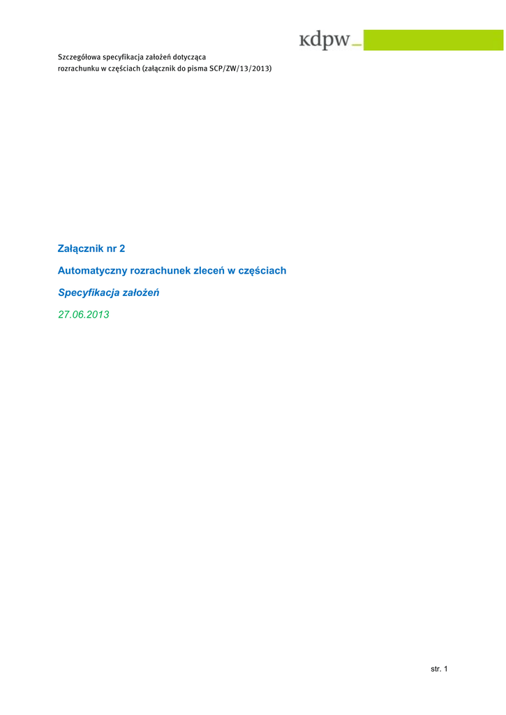 Szczegółowa specyfikacja założeń dotycząca rozrachunku w częściach (załącznik do pisma SCP/ZW/13/2013) Załącznik nr 2 Automatyczny rozrachunek zleceń w częściach Specyfikacja założeń 27.06.2013 str. 1 Szczegółowa specyfikacja założeń dotycząca rozrachunku w częściach (załącznik do pisma SCP/ZW/13/2013) Spis treści Wstęp ...................................................................................................................................... 3 Założenia funkcjonalne ............................................................................................................ 4 I. Założenia podstawowe ................................................................................................. 4 II. Założenia dodatkowe ................................................................................................ 6 III. Obsługa rozrachunku w częściach ................................................................................. 6 Opis procesu RwC (diagram) .............................................................................................. 7 Komunikaty systemu kdpw_stream związane z procesem rozrachunku ................................ 10 IV. Wymiana komunikatów rozrachunkowych .................................................................... 10 V. Obsługa komunikatów rozrachunkowych w przypadku RwC ......................................... 13 1. Zlecenie rozrachunku transakcji .............................................................................. 13 2. Status zlecenia rozrachunku ................................................................................... 13 3. Potwierdzenie rozrachunku zlecenia ....................................................................... 13 3. Komunikat modyfikacji wartości parametru rozrachunku w częściach ..................... 13 4. Komunikat anulowania instrukcji rozrachunku ......................................................... 14 5. Komunikat wyciąg z konta rozrachunkowego .......................................................... 14 str. 2 Szczegółowa specyfikacja założeń dotycząca rozrachunku w częściach (załącznik do pisma SCP/ZW/13/2013) Wstęp Automatyczny rozrachunek w częściach jest standardową usługą oferowaną przez izby rozrachunkowe w ramach optymalizacji procesu rozrachunku. Automatyczny rozrachunek zlecenia w częściach jest to rozrachunek instrukcji w części wyznaczonej wysokością dostępnego salda na koncie w systemie rozrachunkowym w danym dniu rozrachunku i rozrachunek pozostałej części podczas kolejnego przetwarzania w danym dniu lub w dniach następnych z uwzględnieniem założonych limitów podziału instrukcji. Obsługa zlecenia rozrachunku, na który brakuje papierów wartościowych, czyli dokonanie automatycznego rozrachunku zlecenia w częściach, ma na celu optymalizację rozrachunku oraz redukcję negatywnych skutków zawieszenia rozrachunku w dniu ustalenia praw do pożytków z papierów wartościowych. Ponadto, wprowadzenie automatycznego rozrachunku w częściach będzie szczególnie istotne w związku z planami KDPW_CCP związanymi z projektem nettingu w papierach wartościowych, a co za tym idzie przekazywaniem przez KDPW_CCP do rozrachunku w KDPW zleceń rozrachunku wynikających z wynettowanych pozycji. str. 3 Szczegółowa specyfikacja założeń dotycząca rozrachunku w częściach (załącznik do pisma SCP/ZW/13/2013) Założenia funkcjonalne Funkcjonalność rozrachunku w częściach jest elementem procesu optymalizacji rozrachunku. Poniżej zostaną przedstawione założenia dotyczące realizacji procesu optymalizacji, ze szczególnym uwzględnieniem mechanizmu rozrachunku w częściach. I. Założenia podstawowe 1. Rozrachunek w częściach (dalej RwC) będzie elementem procesu optymalizacji rozrachunku transakcji rynku kasowego w trybie sesyjnym. Obecnie proces optymalizacji jest realizowany poprzez funkcje: nettingu technicznego oraz udzielanie automatycznych pożyczek papierów wartościowych. Docelowo system rozrachunkowy w procesie optymalizacji będzie stosował kombinację trzech funkcjonalności: netting techniczny, automatyczne pożyczki papierów wartościowych oraz rozrachunek w częściach. 2. Proces optymalizacji rozrachunku powinien zapewnić rozrachunek maksymalnej liczby transakcji i maksymalnego wolumenu. 3. W przypadku instrukcji zestawianych, wystawca instrukcji rozrachunku będzie informował o pozwoleniu na dokonanie rozrachunku w częściach, wypełniając odpowiednio wartość określonego pola w instrukcji rozrachunku. Przyjmuje się na podstawie konsultacji z uczestnikami, iż domyślnie rozrachunek w częściach jest niedozwolony, co oznacza, że RwC będzie stosowany wyłącznie do zleceń rozrachunku, dla których wystawca instrukcji wskazał zgodę na rozrachunek w częściach. 4. Uczestnik KDPW będzie miał także możliwość wskazania swojej zgody na RwC dla konta rozrachunku (domyślnie przyjmuje się że nie udziela się zgody na prowadzenie rozrachunku w częściach). Dla instrukcji rozrachunku, w której wystawca nie wskazał jawnie zgody (lub jej braku) na RwC KDPW uzupełnia tą wartość na podstawie charakterystyki konta odpowiedniej strony transakcji (w przypadku instrukcji nie wymagającej zestawiania będzie to konto rozrachunku strony dostarczającej papiery). Oznacza to, że decyzja o możliwości zastosowania rozrachunku w częściach będzie leżała po stronie dostawcy papierów wartościowych. 5. W przypadku instrukcji wystawianych przez KDPW_CCP (lub BondSpot dla transakcji z rynku Treasury BondSpot Poland) zgoda na RwC nie będzie jawnie wskazywana w instrukcji rozrachunku. Decyzja o możliwości stosowania rozrachunku w częściach będzie leżała po stronie dostarczającej papiery wartościowe, w zakresie instrukcji, w których jest stroną debetowaną. Takie instrukcje zostaną wzbogacone o informacje zawarte w oznaczeniu konta rozrachunkowego