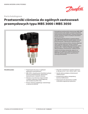 MAKING MODERN LIVING POSSIBLE Karta katalogowa Przetworniki ciśnienia do ogólnych zastosowań przemysłowych typu MBS 3000 i MBS 3050 Kompaktowe przetworniki ciśnienia typu MBS 3000 przeznaczone są do użytku w prawie wszystkich zastosowaniach przemysłowych i oferują niezawodny pomiar ciśnienia, nawet w trudnych warunkach środowiskowych. Wbudowany tłumik pulsacji w przetwornikach typu MBS 3050 zapewnia wysoki stopień ochrony przed kawitacją i uderzeniami hydraulicznymi. Szeroka oferta przetworników ciśnienia obejmuje różne sygnały wyjściowe, pomiar ciśnienia absolutnego i względnego (nadciśnienie), zakres pomiaru od 0–1 bar do 0–600 bar oraz bogatą ofertę przyłączy ciśnieniowych i elektrycznych. Solidna konstrukcja doskonale odporna na drgania oraz zakłócenia elektromagnetyczne EMC/EMI spełnia najbardziej rygorystyczne wymogi przemysłowe. Charakterystyka yy Przeznaczone do pracy w ogólnych aplikacjach przemysłowych yy Wszystkie standardowe sygnały wyjściowe: 4–20 mA, 0–5 V, 1–5 V, 1–6 V, 0–10 V, 1–10 V yy MBS 3050 z wbudowanym tłumikiem pulsacji. Ochrona przed kawitacją, uderzeniami hydraulicznymi i skokami ciśnienia yy Szeroki zakres przyłączy ciśnieniowych i elektrycznych yy Obudowa oraz elementy mające kontakt z medium wykonane z kwasoodpornej stali nierdzewnej (AISI 316L) yy Pomiar ciśnienia względnego i absolutnego w zakresie do 600 bar © Danfoss A/S (IA-MS/IM) 2014-02 IC.PD.P20.A5.49 / 520B6005 yy Kompensacja wpływu temperatury, laserowo kalibrowane yy Dopuszczone do stosowania w strefie 2 atmosfery zagrożonej wybuchem 1 Karta katalogowa Przetworniki ciśnienia do ogólnych zastosowań przemysłowych typu MBS 3000 i MBS 3050 MBS 3050 z tłumikiem pulsacji Zastosowanie Parametry medium Kawitacja, uderzenia hydrauliczne i skoki ciśnienia mogą mieć miejsce w układach hydraulicznych, w których występują gwałtowne zmiany przepływu, np. szybkie zamykanie zaworu lub załączanie/ wyłączanie pompy. Lepkość mediów tylko w niewielkim stopniu wpływa na czas reakcji. Czas reakcji nie przekracza 4 ms nawet przy lepkości mediów sięgającej 100 cSt. Tłumik pulsacji Dane techniczne Zjawiska te mogą się pojawić zarówno po stronie tłocznej, jak i ssącej pompy oraz za lub przed zaworem, nawet przy stosunkowo niskim ciśnieniu roboczym. Charakterystyka (EN 60770) ≤ ±0,5% zakresu (typ.) Dokładność (zawiera nieliniowość, histerezę i powtarzalność) ≤ ±1% zakresu (maks.) Nieliniowość BFSL ≤ ±0,2% zakresu Histereza i powtarzalność ≤ ±0,1% zakresu ≤ ±0,1% zakresu/10K (typ.) Przesunięcie termiczne punktu zerowego ≤ ±0,2% zakresu/10K (maks.) ≤ ±0,1% zakresu/10K (typ.) Przesunięcie termiczne czułości (zakresu) Czas reakcji ≤ ±0,2% zakresu/10K (maks.) Ciecze o lepkości < 100 cSt < 4 ms Powietrze i gazy (MBS 3050) < 35 ms Przeciążenie ciśnienia (statyczne) 6 × zakres (maks. 1500 bar) Ciśnienie niszczące 6 × zakres (maks. 2000 bar) Żywotność, P: 10–90% zakresu >10 × 106 cykli Charakterystyka elektryczna Sygnał wyjściowy (zabezpieczony przeciwzwarciowo) Napięcie zasilające [UB], (ochrona przed zmianą biegunowości) Pobór prądu 4–20 mA 0–5, 1–5, 1–6 V 0–10 V, 1–10 V 9–32 V 9–30 V 15–30 V – ≤ 5 mA ≤ 8 mA Wpływ napięcia zasilającego Prąd graniczny Impedancja wyjściowa Obciążenie [RL] (podłączone do 0 V) © Danfoss A/S (IA-MS/IM) 2014-02 IC.PD.P20.A5.49 / 520B6005 ≤ ±0,1% zakresu/10 V 28 mA (typ.) – – ≥ 25 kΩ RL ≤ (UB- 9V)/0,02 A RL ≥ 10 kΩ RL ≥ 15 kΩ Karta katalogowa Przetworniki ciśnienia do ogólnych zastosowań przemysłowych typu MBS 3000 i MBS 3050 Dane techniczne (ciąg dalszy) Warunki pracy Zakres temperatury czujnika Normalny -40 – 85 °C ATEX strefy 2 -40 – 85 °C Zakres temperatury medium 115–(0,35 × temperatura otoczenia) Zakres temperatury otoczenia (w zależności od podłączenia elektrycznego) Patrz strona 6 Kompensacja wpływu temperatury 0 – 80 °C Temperatura przechowywania -50 – 85 °C Emisja zakłóceń elektromagnetycznych EN 61000-6-3 Odporność na zakłócenia elektromagnetyczne EN 61000-6-2 Odporność izolacji na przebicie > 100 MΩ przy zasilaniu 100 V Test częstotliwości zasilania Wg. normy SEN 361503 Sinusoidalne Odporność na drgania Odporność na uderzenia 15,9 mm-pp, 5 Hz–25 Hz 20 g, 25 Hz–2 kHz IEC 60068-2-6 Losowe 7,5 grms , 5 Hz–1 kHz IEC 60068-2-64 Uderzenie 500 g/1 ms IEC 60068-2-27 Spadanie swobodne 1m IEC 60068-2-32 Stopień ochrony (w zależności od podłączenia elektrycznego) Patrz strona 6 Atmosfera zagrożona wybuchem Zastosowanie w strefie 2 EN60079-0; EN60079-15 W aplikacjach ATEX strefy 2 przy temperaturach <-10 °C kabel i wtyczka muszą być chronione przed uderzeniami. Charakterystyka mechaniczna Materiały Elementy mające kontakt z medium EN 10088-1; 1,4404 (AISI 316 L) Obudowa EN 10088-1; 1,4404 (AISI 316 L) Podłączenie elektryczne Patrz strona 6 Masa (zależy od przyłącza ciśnieniowego i podłączenia elektrycznego) © Danfoss A/S (IA-MS/IM) 2014-02 IC.PD.P20.A5.49 / 520B6005 0,2–0,3 kg Karta katalogowa Przetworniki ciśnienia do ogólnych zastosowań przemysłowych typu MBS 3000 i MBS 3050 Zamawianie MBS 30.. – Standardowy 00 Z tłumikiem pulsacji 50 – Przyłącze ciśnieniowe Zakres pomiaru Możliwe są konfiguracje niestandardowe, jednak ich zamówienie może być uzależnione od minimalnej ilości sztuk. G ¼ A (EN 837) (tylko MBS 3000) AB06 G 3⁄8 A (EN 837) (tylko MBS 3000) AB08 G ½ A (EN 837) 0 – 1 bar 10 AC04 ¼ – 18 NPT 0 – 1,6 bar 12 AC08 ½–14 NPT (tylko MBS 3000) 0 – 2,5 bar 14 GB04 DIN 3852-E-G ¼, uszczelnienie: DIN 3869-14 NBR 0 – 4 bar 16 0 – 6 bar 18 FA09 DIN 3852-E-M14 × 1,5, uszczelnienie: DIN3869-14-NBR (tylko MBS 3050) 0 – 10 bar 20 0 – 16 bar 22 0 – 25 bar 0 – 40 bar 0 – 60 bar 24 26 28 0 – 100 bar 30 0 – 160 bar 32 0 – 250 bar 34 0 – 400 bar 36 0 – 600 bar 38 Podłączenie elek