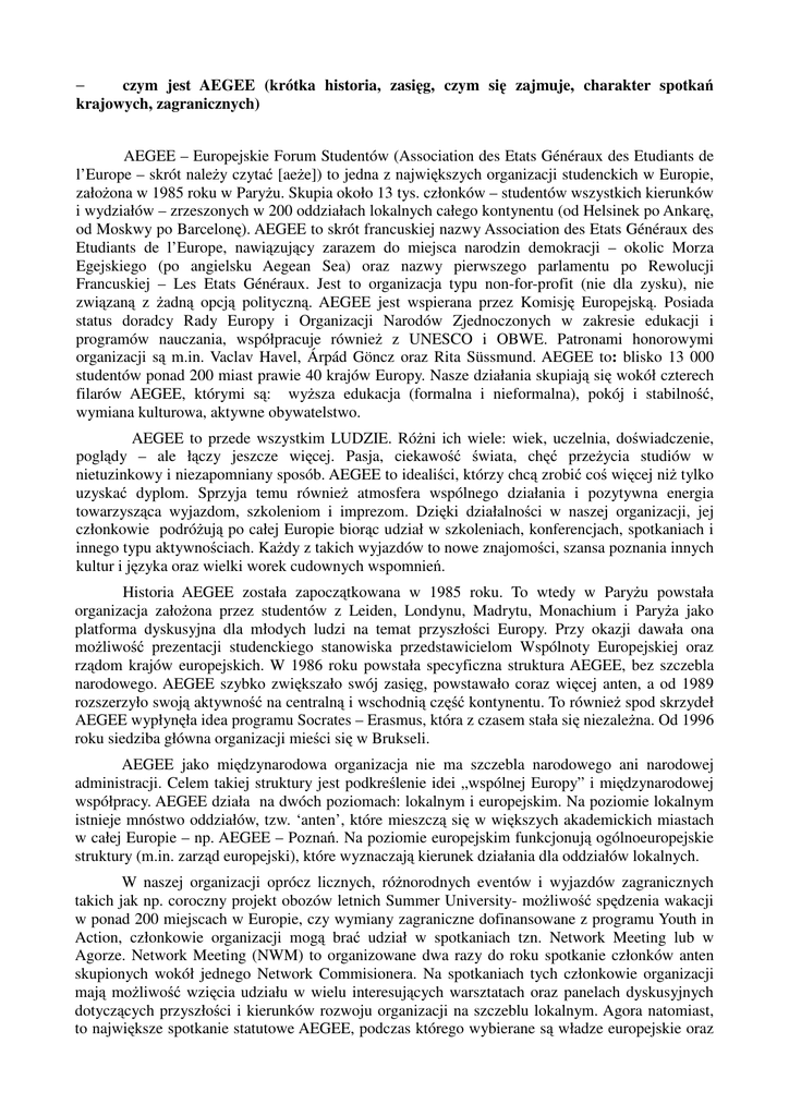 − czym jest AEGEE (krótka historia, zasięg, czym się zajmuje, charakter spotkań krajowych, zagranicznych) AEGEE – Europejskie Forum Studentów (Association des Etats Généraux des Etudiants de l’Europe – skrót należy czytać [aeże]) to jedna z największych organizacji studenckich w Europie, założona w 1985 roku w Paryżu. Skupia około 13 tys. członków – studentów wszystkich kierunków i wydziałów – zrzeszonych w 200 oddziałach lokalnych całego kontynentu (od Helsinek po Ankarę, od Moskwy po Barcelonę). AEGEE to skrót francuskiej nazwy Association des Etats Généraux des Etudiants de l’Europe, nawiązujący zarazem do miejsca narodzin demokracji – okolic Morza Egejskiego (po angielsku Aegean Sea) oraz nazwy pierwszego parlamentu po Rewolucji Francuskiej – Les Etats Généraux. Jest to organizacja typu non-for-profit (nie dla zysku), nie związaną z żadną opcją polityczną. AEGEE jest wspierana przez Komisję Europejską. Posiada status doradcy Rady Europy i Organizacji Narodów Zjednoczonych w zakresie edukacji i programów nauczania, współpracuje również z UNESCO i OBWE. Patronami honorowymi organizacji są m.in. Vaclav Havel, Árpád Göncz oraz Rita Süssmund. AEGEE to: blisko 13 000 studentów ponad 200 miast prawie 40 krajów Europy. Nasze działania skupiają się wokół czterech filarów AEGEE, którymi są: wyższa edukacja (formalna i nieformalna), pokój i stabilność, wymiana kulturowa, aktywne obywatelstwo. AEGEE to przede wszystkim LUDZIE. Różni ich wiele: wiek, uczelnia, doświadczenie, poglądy – ale łączy jeszcze więcej. Pasja, ciekawość świata, chęć przeżycia studiów w nietuzinkowy i niezapomniany sposób. AEGEE to idealiści, którzy chcą zrobić coś więcej niż tylko uzyskać dyplom. Sprzyja temu również atmosfera wspólnego działania i pozytywna energia towarzysząca wyjazdom, szkoleniom i imprezom. Dzięki działalności w naszej organizacji, jej członkowie podróżują po całej Europie biorąc udział w szkoleniach, konferencjach, spotkaniach i innego typu aktywnościach. Każdy z takich wyjazdów to nowe znajomości, szansa poznania innych kultur i języka oraz wielki worek cudownych wspomnień. Historia AEGEE została zapoczątkowana w 1985 roku. To wtedy w Paryżu powstała organizacja założona przez studentów z Leiden, Londynu, Madrytu, Monachium i Paryża jako platforma dyskusyjna dla młodych ludzi na temat przyszłości Europy. Przy okazji dawała ona możliwość prezentacji studenckiego stanowiska przedstawicielom Wspólnoty Europejskiej oraz rządom krajów europejskich. W 1986 roku powstała specyficzna struktura AEGEE, bez szczebla narodowego. AEGEE szybko zwiększało swój zasięg, powstawało coraz więcej anten, a od 1989 rozszerzyło swoją aktywność na centralną i wschodnią część kontynentu. To również spod skrzydeł AEGEE wypłynęła idea programu Socrates – Erasmus, która z czasem stała się niezależna. Od 1996 roku siedziba główna organizacji mieści się w Brukseli. AEGEE jako międzynarodowa organizacja nie ma szczebla narodowego ani narodowej administracji. Celem takiej struktury jest podkreślenie idei „wspólnej Europy” i międzynarodowej współpracy. AEGEE działa na dwóch poziomach: lokalnym i europejskim. Na poziomie lokalnym istnieje mnóstwo oddziałów, tzw. ‘anten’, które mieszczą się w większych akademickich miastach w całej Europie – np. AEGEE – Poznań. Na poziomie europejskim funkcjonują ogólnoeuropejskie struktury (m.in. zarząd europejski), które wyznaczają kierunek działania dla oddziałów lokalnych. W naszej organizacji oprócz licznych, różnorodnych eventów i wyjazdów zagranicznych takich jak np. coroczny projekt obozów letnich Summer University- możliwość spędzenia wakacji w ponad 200 miejscach w Europie, czy wymiany zagraniczne dofinansowane z programu Youth in Action, członkowie organizacji mogą brać udział w spotkaniach tzn. Network Meeting lub w Agorze. Network Meeting (NWM) to organizowane dwa razy do roku spotkanie członków anten skupionych wokół jednego Network Commisionera. Na spotkaniach tych członkowie organizacji mają możliwość wzięcia udziału w wielu interesujących warsztatach oraz panelach dyskusyjnych dotyczących przyszłości i kierunków rozwoju organizacji na szczeblu lokalnym. Agora natomiast, to największe spotkanie statutowe AEGEE, podczas którego wybierane są władze europejskie oraz dokonywane są zmiany w statucie AEGEE-Europe. − warunki członkostwa, z uwzględnieniem członków z Łodzi - czyli czy obowiązkowe uczestnictwo w zebraniach Warunkiem członkostwa w AEGEE jest przede wszystkim chęć działania osób przystępujących do organizacji. Formalnie członkiem zwyczajnym AEGEE-Poznań może zostać każdy student lub absolwent wyższej uczelni, bez względu na rodzaj uczelni oraz kierunek studiów, który w momencie przystąpienia do AEGEE nie ukończył 35 roku życia, identyfikuje się z celami i działalnością AEGEE-Poznań. Warto nadmienić, iż oddział AEGEE-Poznań nie prowadzi rekrutacji, co stanowi wyróżnik naszej organizacji spośród innych. − obowiązki członków (m.in. opłaty) Członkowie organizacji mogą aktywnie udzielać się w naszej organizacji - brać udział w pracach nad projektami, nie ponosząc żadnych opłat. Członek AEGEE nie ma narzuconych obowiązków. Jest to działalność wolontariacka opierająca się na zasadzie dobrowolności. Jedynie powierzone mu zadania, których się podejmuje uczestnicząc w spotkaniach grup roboczych lub projektowych mogą być traktowane jako pewne obowiązki. W naszej organizacji każdy może w dowolnym momencie zacząć się udzielać lub przestać się udzielać. Uczestnictwo w spotkaniach głównych, czy w spotkaniach grup roboczych lub projektowych nie jest obowiązkowe. Składka członkowska wynosi 40 zł i jest ona opłacana na rok. Dokonanie opłaty jest niezbędne w przypa