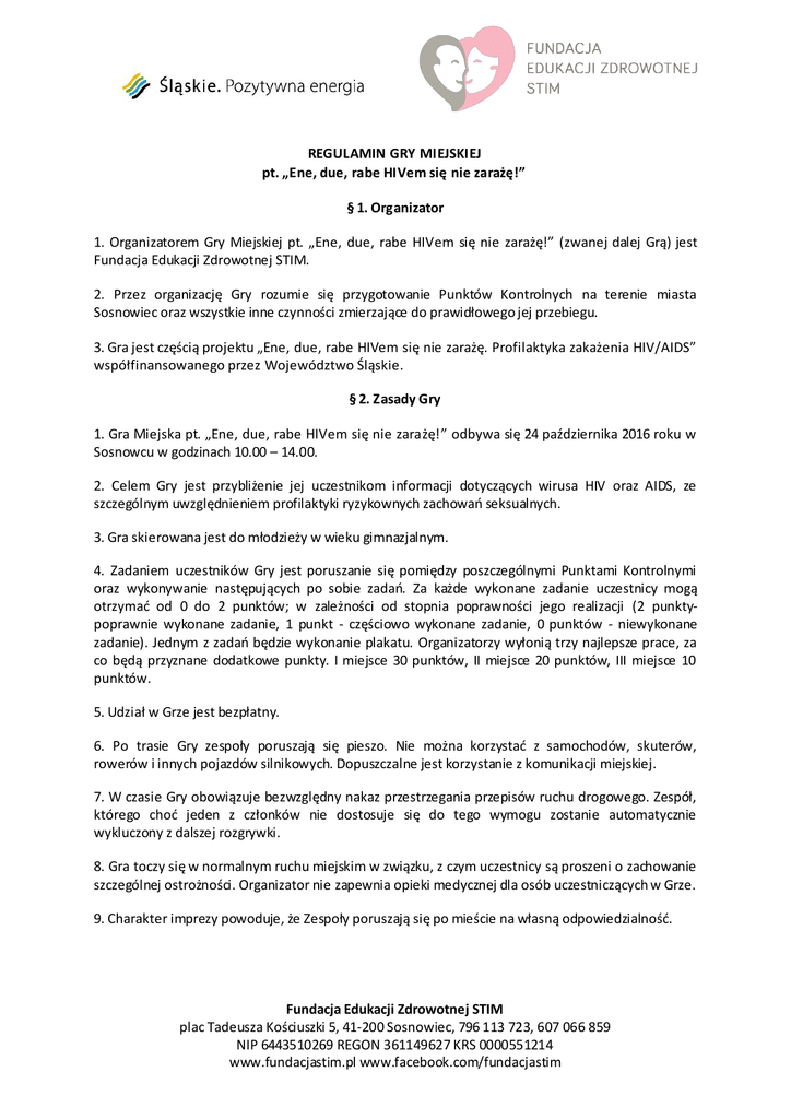 REGULAMIN GRY MIEJSKIEJ pt. „Ene, due, rabe HIVem się nie zarażę!” § 1. Organizator 1. Organizatorem Gry Miejskiej pt. „Ene, due, rabe HIVem się nie zarażę!” (zwanej dalej Grą) jest Fundacja Edukacji Zdrowotnej STIM. 2. Przez organizację Gry rozumie się przygotowanie Punktów Kontrolnych na terenie miasta Sosnowiec oraz wszystkie inne czynności zmierzające do prawidłowego jej przebiegu. 3. Gra jest częścią projektu „Ene, due, rabe HIVem się nie zarażę. Profilaktyka zakażenia HIV/AIDS” współfinansowanego przez Województwo Śląskie. § 2. Zasady Gry 1. Gra Miejska pt. „Ene, due, rabe HIVem się nie zarażę!” odbywa się 24 października 2016 roku w Sosnowcu w godzinach 10.00 – 14.00. 2. Celem Gry jest przybliżenie jej uczestnikom informacji dotyczących wirusa HIV oraz AIDS, ze szczególnym uwzględnieniem profilaktyki ryzykownych zachowao seksualnych. 3. Gra skierowana jest do młodzieży w wieku gimnazjalnym. 4. Zadaniem uczestników Gry jest poruszanie się pomiędzy poszczególnymi Punktami Kontrolnymi oraz wykonywanie następujących po sobie zadao. Za każde wykonane zadanie uczestnicy mogą otrzymad od 0 do 2 punktów; w zależności od stopnia poprawności jego realizacji (2 punktypoprawnie wykonane zadanie, 1 punkt - częściowo wykonane zadanie, 0 punktów - niewykonane zadanie). Jednym z zadao będzie wykonanie plakatu. Organizatorzy wyłonią trzy najlepsze prace, za co będą przyznane dodatkowe punkty. I miejsce 30 punktów, II miejsce 20 punktów, III miejsce 10 punktów. 5. Udział w Grze jest bezpłatny. 6. Po trasie Gry zespoły poruszają się pieszo. Nie można korzystad z samochodów, skuterów, rowerów i innych pojazdów silnikowych. Dopuszczalne jest korzystanie z komunikacji miejskiej. 7. W czasie Gry obowiązuje bezwzględny nakaz przestrzegania przepisów ruchu drogowego. Zespół, którego chod jeden z członków nie dostosuje się do tego wymogu zostanie automatycznie wykluczony z dalszej rozgrywki. 8. Gra toczy się w normalnym ruchu miejskim w związku, z czym uczestnicy są proszeni o zachowanie szczególnej ostrożności. Organizator nie zapewnia opieki medycznej dla osób uczestniczących w Grze. 9. Charakter imprezy powoduje, że Zespoły poruszają się po mieście na własną odpowiedzialnośd. Fundacja Edukacji Zdrowotnej STIM plac Tadeusza Kościuszki 5, 41-200 Sosnowiec, 796 113 723, 607 066 859 NIP 6443510269 REGON 361149627 KRS 0000551214 www.fundacjastim.pl www.facebook.com/fundacjastim 10. Uczestnicy przystępując do Gry biorą na siebie pełną odpowiedzialnośd prawno-cywilną na cały czas trwania Gry. W przypadku osób niepełnoletnich odpowiedzialnośd za taką osobę ponosi opiekun z ramienia Szkoły. 11. W przypadku naruszenia przez uczestnika lub zespół niniejszego regulaminu, złamania zasad fair play bądź utrudniania Gry innym uczestnikom, w dowolnym momencie Gry Organizator ma prawo do wykluczenia go z Gry. Decyzja Organizatora w tej kwestii jest ostateczna. 12. Zespoły zobowiązane są do przestrzegania kolejności wykonywanych zadao w Punktach Kontrolnych zgodnie z harmonogramem. 13. Organizator nie ponosi odpowiedzialności za zachowania uczestników Gry mogące naruszyd porządek publiczny lub dobra osobiste osób trzecich. 14. Organizator nie jest stroną między uczestnikami, a osobami trzecimi, których dobra mogą byd naruszone w czasie Gry. § 3. Uczestnicy Gry i Zgłoszenia 1. Warunkiem uczestnictwa w Grze jest rejestracja Zespołu liczącego 3 uczniów wraz z 1 opiekunem z ramienia szkoły. 2. Rejestracji dokonad można do dnia 17 października 2016 roku włącznie poprzez kompletne i poprawne wypełnienie odpowiedniego formularza zgłoszeniowego będącego załącznikiem nr 1 do regulaminu gry oraz przesłanie formularza drogą poczty elektronicznej na adres: [email protected], a także dostarczenie oryginału w dniu 24.10.2016 przy rejestracji Zespołu. 3. Członkiem każdego z Zespołów musi byd przynajmniej jedna osoba pełnoletnia - opiekun Zespołu. Osoby niepełnoletnie mogą brad udział w Grze tylko pod jego opieką. Niepełnoletni członkowie Zespołu muszą posiadad pisemną zgodę rodziców/prawnych opiekunów na udział w Grze (Załącznik nr 2). Zgody należy dostarczyd wraz z formularzem zgłoszeniowym. Za zebranie zgód od uczestników niepełnoletnich odpowiedzialny jest nauczyciel danej szkoły. 4. Każda z osób biorących udział w Grze powinna byd w dobrym stanie zdrowia, umożliwiającym udział w Grze. 5. Poprzez rejestrację i udział w Grze uczestnik wyraża zgodę na: - wzięcie udziału w Grze na warunkach określonych w niniejszym regulaminie; - przetwarzanie przez Organizatora danych osobowych uczestników w zakresie niezbędnym dla przeprowadzenia Gry (zgodnie z ustawą o ochronie danych osobowych z dnia 29.09.1997 roku Dz. U. Nr 133 poz. 883); - opublikowanie przez Organizatora na łamach stron internetowych, portali społecznościowych oraz w informacjach medialnych wizerunku uczestnika, oraz w uzasadnionym przypadku, imienia i nazwiska uczestnika. Fundacja Edukacji Zdrowotnej STIM plac Tadeusza Kościuszki 5, 41-200 Sosnowiec, 796 113 723, 607 066 859 NIP 6443510269 REGON 361149627 KRS 0000551214 www.fundacjastim.pl www.facebook.com/fundacjastim 6. W trakcie Gry członkowie poszczególnych Zespołów nie mogą się rozdzielad. Liczba członków Zespołu będzie weryfikowana w poszczególnych Punktach Kontrolnych. W razie niezgodności Zespół będzie mógł przystąpid do realizacji danego zdania dopiero wtedy, kiedy wszyscy jego członkowie znajdą się w Punkcie Kontrolnym. 7. W trakcie Gry członkowie poszczególnych Zespołów nie mogą używad telefonów komórkowych lub innych urządzeo w celu poszukiwao odpowiedzi na zadania znajdujące się na Punktach Kontrolnych. Dopuszcza się używanie nawigacji w celu dobrego zaplanowania trasy. 8. Liczba zespołów, które mogą wziąd udział w Grze jest ograniczona (10). Decyduje kolejnośd w