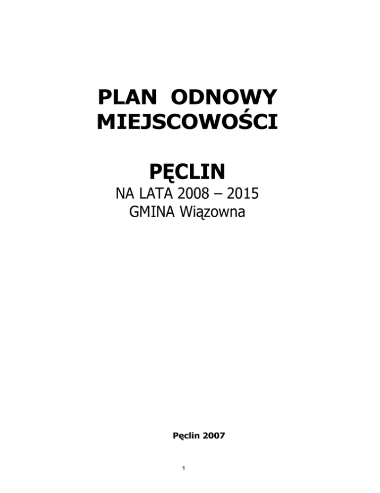 PLAN ODNOWY MIEJSCOWOŚCI PĘCLIN NA LATA 2008 – 2015 GMINA Wiązowna Pęclin 2007 1 Spis treści : I . Opis stanu istniejącego i kierunki rozwoju 1. Charakterystyka wsi 2. Zasoby miejscowości Pęclin 3. Diagnoza stanu istniejącego 4. Ocena mocnych i słabych stron wsi 5. Kierunki rozwoju II. Opis planowanych przedsięwzięć 2 I. OPIS STANU ISTNIEJĄCEGO I KIERUNKI ROZWOJU 1. Charakterystyka miejscowości Pęclin – wieś w Polsce połoŜona w województwie mazowieckim, w powiecie otwockim, w gminie Wiązowna. W latach 1975-1998 miejscowość administracyjnie naleŜała do województwa warszawskiego. Pęclin jest jednostką pomocniczą Gminy Wiązowna, lokalną wspólnotą samorządową mieszkańców sołectwa, której podstawowym celem działania jest organizacja Ŝycia publicznego na swoim terytorium i zapewnienie jego mieszkańcom udziału w realizacji zadań publicznych Gminy Wiązowna. Obszarem realizacji Planu Rozwoju Miejscowości Pęclin jest obszar tej miejscowości, a czas jego realizacji obejmuje lata 2007 – 2015. a) Lokalizacja mapka z załącznika Statutu sołectwa 3 b) Historia Nazwa podwarszawskiej wsi Pęclin pochodzi bezpośrednio od nazwy miasteczka niemieckiego Penzlin w Maklenburgi skąd wywodzą się załoŜyciele tej wsi. Powstała ona (wg. zapisków z ksiąŜki Krzysztofa Oktabińskiego) w 1823 roku. Z przekazywanych przez mieszkańców podań wiemy, iŜ mieszkali tu osadnicy niemieccy trudniący się wypalaniem węgla drzewnego, którym następnie handlowali w Warszawie. Podobno na terenie Pęclina była teŜ w pewnym czasie olejarnia, w której tłoczono olej. U schyłku XIX w na obszarze gminy Wiązowna mieszkało 811 protestantów. W Pęclinie na terenie obecnego Domu Nauczyciela istniał cmentarz ewangelicki. Podczas II Wojny Światowej na przełomie 1939/40 roku powstała na tym terenie pierwsza grupa konspiratorów SZP – Związek Walki Zbrojnej. U państwa Kostrzyńskich odbywały się pierwsze szkolenia, przysięgi, a takŜe tajne lekcje i wykłady. W lutym 1942 roku ZWZ zmieniło nazwę na Armia Krajowa. śołnierze mieszkający na terenie gminy szukali zakopanej broni z września 1939 roku. Konserwacją i naprawą przewaŜnie zajmowali się chłopcy z Pęclina. Zwykle dorabiano kolby do mauzerów i czyszczono z rdzy następnie chowano do skrytek w stodołach i zagajnikach. W lesie pod Pęclinem odbywały się ćwiczenia i musztra. Dowództwo AK wyznaczyło zapasowe lądowisko pod kryptonimem "Pierzyna" w lesie pomiędzy Malcanowem, Pęclinem i Kąckiem na tzw. Piskorzu. 30.07.1944 roku duŜe oddziały hitlerowskie maszerujące z czołgami od strony Glinianki natknęły się na kolumnę czołgów sowieckich. Walka rozgorzała w Pęclinie. Jedna z maszyn sowieckich została trafiona obok domu p. Wicików. Czołg rozerwał się z taka silą, Ŝe jego części znaleziono w odległości 500 m od miejsca trafienia. Cała załoga spłonęła, a wraz z nią pobliski dom. Niemcy w popłochu wycofywali się ze wsi, przez Dziechciniec wycofywali się do śanęcina." Wkraczające wojska radzieckie zaskoczyły dowództwo Armii Krajowej. Był sierpień i w Warszawie trwało powstanie. Dowódca por. M. Mazowiecki nawiązał kontakt z oficerami wojska sowieckiego. W Pęclinie koło kapliczki nakazano koncentrację oddziału. Odprawiono polową Mszę Świętą, którą koncelebrował kapelan AK ks. Jan Raczkowski. Stawili się prawie wszyscy z IV kompanii z całego terenu z opaskami. Po mszy odbyła się defilada. Wspomniana kapliczka znajduje się nadal w środkowej części wsi. Umieszczono na niej tabliczkę pamiątkową. Mieszkańcy bardzo o nią dbają, a w majowe wieczory spotykają się przy niej na majówki – modlitwy i śpiewy poświęcone Matce BoŜej. W kilka dni później NKWD rozpoczęła wyłapywanie Ŝołnierzy AK, część z nich znalazła się w gułagach. W Pęclinie stacjonował tzw. Batalion Zaporowy NKWD. Wyłapywano i przesłuchiwano podejrzanych, którzy trafiali do wojska, Rembertowa, lub na Sybir. Ludowe Wojsko Polskie utworzyło magazyny amunicji koło szkoły. śołnierze kopali rowy przeciwczołgowe i okopy, które dotąd są bardzo widoczne w pobliskim lesie. Po 12 stycznia 1945r. Ŝołnierze opuścili Pęclin. 4 W okresie międzywojennym XX wieku w Pęclinie na terenie wspólnoty wiejskiej powstała szkoła, w budynku po niej znajdują się obecnie mieszkania komunalne tzw. Dom Nauczyciela. W latach sześćdziesiątych w Pęclinie, dzięki ofiarności i pomocy mieszkańców wsi, wybudowano Szkołę Podstawową tzw “Tysiąclatkę”. Po likwidacji szkoły podstawowej, na początku lat siedemdziesiątych XX wieku, na jej terenie utworzono Państwowy Dom Dziecka, który został zlikwidowany w 1984, a w okresie od 1985 do 1999 roku w budynku ponownie funkcjonowała szkoła. Po likwidacji szkoły do budynku przeniesiono Przedszkole Gminne z Radiówka, które w tym miejscu funkcjonuje do dnia dzisiejszego. 2. Zasoby miejscowości Pęclin Pęclin jest wsią, w której występują głównie grunty rolne VI i V klasy. Na części terenów rolnych, tam gdzie jest wysoki poziom wód gruntowych znajdują się łąki i pastwiska. Pierwotna rolnicza funkcja terenu stopniowo zanika głównie z uwagi na niskie klasy gruntów. Grunty rolne okolone są terenami leśnymi. Ponad 50% powierzchni gruntów tworzących sołectwo Pęclin stanowią lasy, są to głównie lasy prywatne. Dzięki wspaniałym walorom przyrodniczym i zdrowotnym w latach siedemdziesiątych XX wieku na terenie sołectwa powstały dwa kompleksy działek rekreacyjnych, które istnieją do dnia dzisiejszego, część domków rekreacyjnych została przebudowana na budynki mieszkalne i jest na stałe zamieszkała. We wsi znajduje się kilka gospodarstw rolnych i zakład betoniarski, firma transportowa. W chwili obecnej w Pęclinie dominuje funkcja mieszkaniowa, sukcesywnie grunty rolne zabudowywane są domami mieszkalnymi. W ostatnich latach na terenie sołectwa nastąpił dynamicz