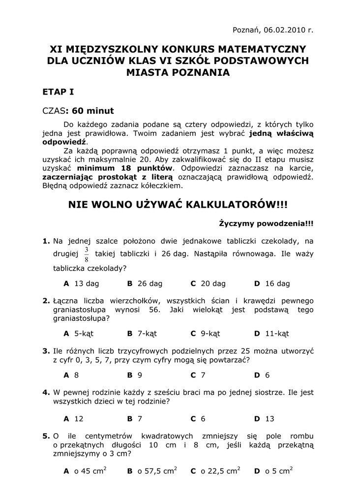 Poznań, 06.02.2010 r. XI MIĘDZYSZKOLNY KONKURS MATEMATYCZNY DLA UCZNIÓW KLAS VI SZKÓŁ PODSTAWOWYCH MIASTA POZNANIA ETAP I CZAS: 60 minut Do kaŜdego zadania podane są cztery odpowiedzi, z których tylko jedna jest prawidłowa. Twoim zadaniem jest wybrać jedną właściwą odpowiedź. Za kaŜdą poprawną odpowiedź otrzymasz 1 punkt, a więc moŜesz uzyskać ich maksymalnie 20. Aby zakwalifikować się do II etapu musisz uzyskać minimum 18 punktów. Odpowiedzi zaznaczasz na karcie, zaczerniając prostokąt z literą oznaczającą prawidłową odpowiedź. Błędną odpowiedź zaznacz kółeczkiem. NIE WOLNO UśYWAĆ KALKULATORÓW!!! śyczymy powodzenia!!! 1. Na jednej szalce połoŜono dwie jednakowe tabliczki czekolady, na 3 drugiej takiej tabliczki i 26 dag. Nastąpiła równowaga. Ile waŜy 8 tabliczka czekolady? A 13 dag B 26 dag C 20 dag D 16 dag 2. Łączna liczba wierzchołków, wszystkich ścian i krawędzi pewnego graniastosłupa wynosi 56. Jaki wielokąt jest podstawą tego graniastosłupa? A 5-kąt B 7-kąt C 9-kąt D 11-kąt 3. Ile róŜnych liczb trzycyfrowych podzielnych przez 25 moŜna utworzyć z cyfr 0, 3, 5, 7, przy czym cyfry mogą się powtarzać? A 8 B 9 C 7 D 6 4. W pewnej rodzinie kaŜdy z sześciu braci ma po jednej siostrze. Ile jest wszystkich dzieci w tej rodzinie? A 12 B 7 C 6 D 13 5. O ile centymetrów kwadratowych zmniejszy się pole rombu o przekątnych długości 10 cm i 8 cm, jeśli kaŜdą przekątną zmniejszymy o 3 cm? A o 45 cm2 B o 57,5 cm2 C o 22,5 cm2 D o 5 cm2 6. Suma połowy pewnej liczby i połowy połowy tej liczby oraz połowy połowy połowy tej liczby jest o 2 mniejsza od dziewięciu. Co to za liczba? A 9 B 6 C 7 D 8 7. Liczby na poniŜszych rysunkach wpisano według pewnej zasady. Znajdź tę zasadę i odpowiedz, jaka liczba powinna się znaleźć na miejscu znaku zapytania? A 3 B 6 C 5 D 4 8. Smerf Ciamajda chciał odwiedzić swojego przyjaciela Puchacza. Dzięcioł wytłumaczył mu jak do niego trafić. Będziesz szedł prosto drogą. Przy drodze rosną drzewa posadzone w następujący sposób: brzoza, sosna, świerk, dąb, olcha, dąb, świerk, sosna, brzoza, sosna, świerk, dąb, olcha, dąb, świerk, sosna, brzoza itd. Puchacz mieszka na 110 drzewie. To bardzo skomplikowane – zmartwił się Ciamajda. Na szczęście umiał dobrze liczyć i trafił do przyjaciela. Jak myślisz, na jakim drzewie mieszkał Puchacz? A brzoza B świerk C dąb D olcha 9. PodróŜ pociągiem z Warszawy do ParyŜa trwa 30 godzin i 42 minuty. Pan Jaworski wyjechał z Warszawy w czwartek o godzinie 2134. O której godzinie i w jakim dniu tygodnia dojedzie do ParyŜa? A piątek 346 B niedziela 502 C sobota 416 D niedziela 234 10. Na rysunku obok czworokąt ABCD jest kwadratem, zaś trójkąt ABE trójkątem równobocznym. Jaka jest miara kąta DEC? A 1600 B 1500 C 1400 D 1200 11. W wyścigu startuje 31 zawodników. Liczba zawodników, którzy dobiegli do mety przed Jasiem jest 4 razy mniejsza od liczby zawodników, którzy ukończyli wyścig po nim. Które miejsce w wyścigu zajął Jaś? A 6 B 9 C 8 D 7 12. Zbyszek idąc na spacer, rzucał co 10 kroków mały kamyk na drogę. W sumie rzucił 523 kamyki. Jaką drogę przebył (od rzucenia pierwszego kamyka do 523), maszerując krokami długości 50 cm? A 26100 cm B 2,615 dm C 2615 m D 2610 m 13. Czterokilogramowy worek ziemniaków kosztuje 3,60zł, zaś dwuipółkilogramowy worek kosztuje 3 zł. O ile droŜszy jest kilogram ziemniaków w mniejszym opakowaniu? A 45 gr B 60 gr C 30 gr D 90 gr 14. Jeśli z siatki pokazanej poniŜej skleimy sześcienną kostkę, to jaka będzie suma liczb oczek na dwóch ścianach sąsiadujących jednocześnie ze ścianą z 3 oczkami i ze ścianą z 2 oczkami? A 6 B 7 C 10 D 9 15. Aby kwadrat był magiczny w puste pole trzeba wstawić liczbę? A CX B LX C LCX D CL 16. Kwadrat ma obwód 32 cm. Środki dwu kolejnych boków tego kwadratu połączono ze sobą i z wierzchołkiem nie naleŜącym do tych boków. Oblicz pole otrzymanego w ten sposób trójkąta? A 16 cm2 B 8 cm2 C 24 cm2 D 12 cm2 17. Średnia wieku jedenastu piłkarzy to 22 lata. Gdy jeden gracz został kontuzjowany i zszedł z boiska, średnia wieku pozostałych wynosiła 21 lat. Ile lat ma ten, który opuścił boisko? A 22 lata B 32 lata C 28 lat D 21 lat 18. Ile wynosi wartość x zaznaczona na rysunku poniŜej? A 5 B 6 C 3 D 4 19. Tomek otrzymał na imieniny pudełko z identycznymi klockami. UŜył ich wszystkich, aby zbudować dwie budowle jak na rysunku. Łączna waga wszystkich klocków wynosi 600 gramów. Lewa budowla waŜy 200 gramów i na rysunku widać wszystkie uŜyte do jej budowy klocki. Jaka liczba klocków w prawej budowli jest na rysunku niewidoczna? A 8 B 2 C 4 D 6 20. Wybierz brakującą figurę w miejsce znaku zapytania. Odpowiedzi: 1-D, 2-C, 3-B, 4-B, 5-C, 6-D, 7-B, 8-C, 9-C, 10-B, 11-D, 12-D, 13-C, 14-D, 15-A, 16-C, 17-B, 18-B, 19-D, 20-A
