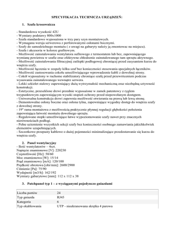 SPECYFIKACJA TECHNICZA URZĄDZEŃ: 1. Szafa krosownicza - Standardowa wysokość 42U - Wymiary podstawy 800x1000 - Szafa standardowo wyposaŜona w trzy pary szyn montaŜowych. - Wymagana wersja serwerowa z perforowanymi osłonami bocznymi. - Szafy do samodzielnego montaŜu ( z uwagi na gabaryty naleŜy ją zmontowac na miejscu). - Szafa i akcesoria w kolorze grafitowym. - MoŜliwość zainstalowania wentylatora sufitowego z termostatem lub bez, zapewniającego wymianę powietrza w szafie oraz efektywne chłodzenie zainstalowanego tam sprzętu aktywnego. - MoŜliwość zainstalowania filtracyjnej zaślepki podłogowej chroniącej przed zasysaniem kurzu do wnętrza szafy. - MoŜliwość łączenia w zespoły kilku szaf bez konieczności stosowania specjalnych łączników. - MoŜliwość zastosowania cokołu umoŜliwiającego wprowadzenie kabli z dowolnej strony. - Cokół wyposaŜony w ruchome stabilizatory chroniące szafę przed przewróceniem podczas wysuwania zainstalowanego wewnątrz serwera. - Lekki szkielet stalowy zapewniający duŜą wytrzymałość mechaniczną oraz niezbędną sztywność konstrukcji. - Estetyczne, przeszklone drzwi przednie wyposaŜone w zamek patentowy z ryglem trzypunktowym zapewniającym wysoki stopień ochrony przed niepowołanym dostępem. - Uniwersalna konstrukcja drzwi zapewnia moŜliwość otwierania na prawą lub lewą stronę. - Demontowalne osłony boczne oraz osłona tylna, zapewniające wygodny dostęp do wnętrza szafy z dowolnej strony. - 19" rama montaŜowa z moŜliwością praktycznie płynnej regulacji głębokości połoŜenia zapewniająca łatwość montaŜu dowolnego sprzętu. - Regulowane stopki umoŜliwiające łatwe wypoziomowanie szafy nawet przy znacznych nierównościach podłogi. - Pełne uziemienie wszystkich sekcji szafy bez konieczności osobnego zamawiania jakichkolwiek elementów uzupełniających. - Szczotkowe przepusty kablowe o duŜej pojemności minimalizujące przedostawanie się kurzu do wnętrza szafy. 2. Panel wentylacyjny - Ilość wentylatorów – 4szt. Napięcie znamionowe [V]: 220230 Częstotliwość [Hz]: 50/60 Moc znamionowa [W]: 15/14 Prąd znamionowy [mA]: 120/100 Prędkość obrotowa [obr/min]: 2600/2900 Ciśnienie [Pa]: 75/90 Wydajność [m3/h]: 162/192 Wymiary gabarytowe [mm]: 112 x 112 x 38 3. Patchpanel typ 1 – z wyciąganymi pojedynczo gniazdami Liczba portów Typ gniazda Kategoria Typ okablowania 24 RJ45 6 UTP - nieekranowana skrętka 4 parowa Dodatkowe funkcje • moŜliwość wymiany pojedynczego portu w przypadku uszkodzenia • porty wyposaŜone w przesłonę przeciwkurzową WyposaŜenie standardowe • tacki do porządkowania przebiegów kablowych • opaski zaciskowe • śruby montaŜowe Wysokość • 1U Kolor grafitowy 4. Patchpanel typ 2 Liczba portów Typ gniazda Kategoria Typ okablowania Wysokość Kolor 24 RJ45 6 UTP - nieekranowana skrętka 4 parowa • 1U grafitowy 5. Przewód logiczny TYP PRZEWODU: UTP kat. 6 PARAMETRY MECHANICZNE: Średnica przewodnika [mm]: 24 AWG ( 0.51mm) Średnica przewodnika w izolacji [mm]:≤1,0 Ekran wokół pojedyńczej pary: brak Liczba par: 4 Ekran wokół kabla: brak Zewnętrzna średnica kabla [mm]:≤ 6.60 Zakres temperatur [°C] Podczas instalacji: 0°C do +50°C W czasie pracy: -20°C do +60°C Dopuszczalny promień zagięcia: - podczas instalacji: 8 razy średnica kabla - w czasie pracy: 4 razy średnica kabla Materiał powłoki: LSZH (IEC 332.3C) Kolor powłoki: szary Kod kolorowy Para 1: biało-niebieski /niebieski Para 2: biało-pomarańczowy/pomarańczowy Para 3: biało-zielony/zielony Para 4: biało-brązowy/brązowy PARAMETRY ELEKTRYCZNE: Rezystancja [Ω/km]: 98 PARAMETRY TRANSMISYJNE: Delay[4-250 MHz] ≤ 534+36/√f ns Delay Skew[4-250 MHz] ≤ 45 ns Attenuation[4-250 MHz] ≤ 1.820•√f+0.0169•f+0.250/√f dB TCL[1-200 MHz] ≥ 40-10•log(f) dB EL TCTL[1-200 MHz] ≥ 35-20•log(f) dB PS NEXT[4-250 MHz] ≥ 72.3-15•log(f) dB PS ELFEXT[4-250 MHz] ≥ 65-20•log(f) dB RL[40-10 MHz] ≥ 20+5•log(f) dB RL[10-20 MHz] ≥ 25 dB RL[20-250 MHz] ≥ 25-7•log(f/20) dB 6. Listwa zasilająca Liczba gniazd wyjściowych Typ gniazda wejściowego Długość przewodu zasilającego Wbudowany filtr dla linii telefonicznej RJ-11 Napięcie znamionowe Prąd znamionowy Częstotliwość Filtr przeciwzakłóceniowy (EMI/RFI) Bezpiecznik nadprądowy MoŜliwość zamontowania w szafie rack 19" WyposaŜenie standardowe Długość Wysokość 8 szt. kabel z wtykiem PL (10A) 2 Metr Nie 230 V AC 16 A 50 Hz Nie Nie Tak Uchwyty do szafy 19” 19 cali 1U 7. Listwy instalacyjne - Systemowe, z modułami gniazd poza obrysem listwy, (puszki przylistwowe) - kolor – biały - wymagane stosowanie kształtek kątowych - Listwy wykonane z twardego PCW, klasa palności V-0 - listwy o wysokiej odporności na uderzenia - temeratura pracy -25/+60stopni 8. Moduł gniazd - systemowe, zgodne z systemem listew - gniazda logiczne kategorii 6 UTP - gniazda logiczne beznarzędziowe - gniazda zasilające 230V, modułowe - Listwy wykonane z twardego PCW, klasa palności V-0 - temeratura pracy -25/+60stopni 9. Switch Architektura sieci LAN Liczba portów 1000BaseT (RJ45) Liczba gniazd MiniGBIC (SFP) GigabitEthernet 48 szt. 4 szt. Porty komunikacji Zarządzanie, monitorowanie i konfiguracja Protokoły uwierzytelniania i kontroli dostępu Obsługiwane protokoły routingu Obsługiwane protokoły i standardy 10/100/1000BaseTX (RJ45) • SNMPv1 - Simple Network Management Protocol ver. 1 • zarządzanie przez przeglądarkę WWW • Telnet • RMON - Remote Monitoring • RMON II - Remote Monitoring ver. 2 • CLI - Command Line Interface • SNMPv2 - Simple Network Management Protocol ver. 2 • SNMPv3 - Simple Network Management Protocol ver. 3 • IEEE 802.1x - Network Login (MAC-based Access Control) • IEEE 802.1x - Network Login (Port-based Access Control) • ACL bazyjący na numerach portów TCP/UDP • SSH v.1 - Secure Shall ver. 1 • SSH v.2 - Secure Shall ver. 2 • EAP - Extens