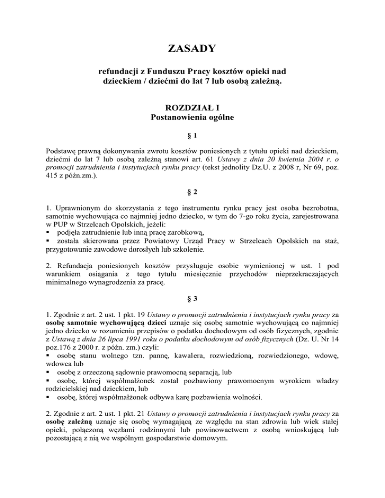 ZASADY refundacji z Funduszu Pracy kosztów opieki nad dzieckiem / dziećmi do lat 7 lub osobą zależną. ROZDZIAŁ I Postanowienia ogólne §1 Podstawę prawną dokonywania zwrotu kosztów poniesionych z tytułu opieki nad dzieckiem, dziećmi do lat 7 lub osobą zależną stanowi art. 61 Ustawy z dnia 20 kwietnia 2004 r. o promocji zatrudnienia i instytucjach rynku pracy (tekst jednolity Dz.U. z 2008 r, Nr 69, poz. 415 z późn.zm.). §2 1. Uprawnionym do skorzystania z tego instrumentu rynku pracy jest osoba bezrobotna, samotnie wychowująca co najmniej jedno dziecko, w tym do 7-go roku życia, zarejestrowana w PUP w Strzelcach Opolskich, jeżeli: podjęła zatrudnienie lub inną pracę zarobkową, została skierowana przez Powiatowy Urząd Pracy w Strzelcach Opolskich na staż, przygotowanie zawodowe dorosłych lub szkolenie. 2. Refundacja poniesionych kosztów przysługuje osobie wymienionej w ust. 1 pod warunkiem osiągania z tego tytułu miesięcznie przychodów nieprzekraczających minimalnego wynagrodzenia za pracę. §3 1. Zgodnie z art. 2 ust. 1 pkt. 19 Ustawy o promocji zatrudnienia i instytucjach rynku pracy za osobę samotnie wychowującą dzieci uznaje się osobę samotnie wychowującą co najmniej jedno dziecko w rozumieniu przepisów o podatku dochodowym od osób fizycznych, zgodnie z Ustawą z dnia 26 lipca 1991 roku o podatku dochodowym od osób fizycznych (Dz. U. Nr 14 poz.176 z 2000 r. z późn. zm.) czyli: osobę stanu wolnego tzn. pannę, kawalera, rozwiedzioną, rozwiedzionego, wdowę, wdowca lub osobę z orzeczoną sądownie prawomocną separacją, lub osobę, której współmałżonek został pozbawiony prawomocnym wyrokiem władzy rodzicielskiej nad dzieckiem, lub osobę, której współmałżonek odbywa karę pozbawienia wolności. 2. Zgodnie z art. 2 ust. 1 pkt. 21 Ustawy o promocji zatrudnienia i instytucjach rynku pracy za osobę zależną uznaje się osobę wymagającą ze względu na stan zdrowia lub wiek stałej opieki, połączoną węzłami rodzinnymi lub powinowactwem z osobą wnioskującą lub pozostającą z nią we wspólnym gospodarstwie domowym. 3. Zatrudnienie, zgodnie z art. 2 ust. 1 pkt. 43 Ustawy o promocji zatrudnienia i instytucjach rynku pracy, oznacza wykonywanie pracy na podstawie stosunku pracy, stosunku służbowego oraz umowy o pracę nakładczą. 4. Inna praca zarobkowa, zgodnie z art. 2 ust. 1 pkt. 11 Ustawy o promocji zatrudnienia i instytucjach rynku pracy, oznacza wykonywanie pracy lub świadczenie usług na podstawie umów cywilnoprawnych, w tym umowy agencyjnej, umowy zlecenia, umowy o dzieło albo w okresie członkostwa w rolniczej spółdzielni produkcyjnej, spółdzielni kółek rolniczych lub spółdzielni usług rolniczych. §4 Kwota stanowiąca zwrot kosztów opieki nad dzieckiem, dziećmi lub osobą zależną, zgodnie z art. 21 ust.1 pkt. 26 b Ustawy o podatku dochodowym od osób fizycznych, jest kwotą wolną od podatku dochodowego ROZDZIAŁ II Postanowienia szczegółowe §5 1. Refundacja kosztów opieki następuje na wniosek osoby uprawnionej na okres: do 6 miesięcy w przypadku podjęcia pracy, odbywania stażu, przygotowania zawodowego dorosłych lub szkolenia. 2. Na wniosek osoby uprawnionej może być wypłacona zaliczka na refundację kosztów opieki na podstawie art. 61 ust. 4 Ustawy o promocji zatrudnienia i instytucjach rynku pracy. §6 Refundacji podlegają wyłącznie udokumentowane poniesione koszty opieki nad dzieckiem lub dziećmi do lat 7 lub osobą zależną w wysokości uzgodnionej, nie wyższej jednak niż połowa zasiłku, o którym mowa w art. 72 ust. 1 Ustawy o promocji zatrudnienia i instytucjach rynku pracy, na każde dziecko / osobę zależną. §7 Osoba uprawniona, ubiegająca się o refundację kosztów opieki, zobowiązana jest złożyć następujące dokumenty: 1. Wniosek o refundację kosztów opieki nad dzieckiem, dziećmi do lat 7 lub osobą zależną (formularz do pobrania na stronie internetowej www.pup-strzelce.pl bądź w siedzibie PUP – ul. Gogolińska 2 a), 2. Umowę o pracę, umowę cywilno–prawną o wykonywanie pracy lub świadczenie usług, umowę lub dokument potwierdzający członkostwo w rolniczej spółdzielni produkcyjnej, spółdzielni kółek rolniczych lub spółdzielni usług rolniczych, w przypadku zatrudnienia bądź posiadania takiego członkostwa, 3. Postanowienie Sądu o orzeczonej separacji, rozwodzie lub akt zgonu współmałżonka, 4. Skrócony akt urodzenia dziecka/ dzieci, 5. Dokument poświadczający ponoszenie kosztów z tytułu opieki nad dzieckiem/dziećmi do lat 7 lub osobą zależną, 6. Dokument poświadczający konieczność ponoszenia kosztów z tytułu opieki nad dzieckiem/ dziećmi do lat 7 lub osobą zależną (oświadczenie o braku możliwości sprawowania opieki przez inną osobę pozostającą we wspólnym gospodarstwie domowym), §8 1.Kompletny i czytelny wniosek o przyznanie refundacji kosztów opieki jest rozpatrywany pisemnie w terminie 30 dni od daty jego złożenia w siedzibie Powiatowego Urzędu Pracy w Strzelcach Opolskich. 2.W przypadku pozytywnego rozpatrzenia Wniosku o refundację kosztów opieki, bezrobotny w okresach miesięcznych, do 5 dnia roboczego każdego następnego miesiąca, za miesiąc którego refundacja dotyczy składa do PUP Rozliczenie poniesionych kosztów opieki, wraz z załącznikami warunkującymi przyznanie refundacji, każdorazowo dołączając dowód poniesienia kosztów, 3.Rozliczenie nie spełniające warunków z ust. 2 nie będzie podlegało refundacji. 4.Refundacja poniesionych kosztów może być przyznana, od miesiąca, w którym złożono kompletny wniosek. §9 Refundacja kosztów opieki nad dzieckiem, dziećmi lub osobą zależną nie przysługuje w przypadku: 1.Zatrudnienia lub wykonywania innej pracy zarobkowej za wynagrodzeniem powyżej kwoty minimalnego wynagrodzenia z pracę, 2.Przerwania zatrudnienia, innej pracy zarobkowej, stażu, przygotowania zawodowego dorosłych, szkolenia. § 10 1.Refundac