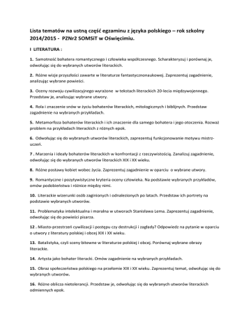 Lista tematów na ustną część egzaminu z języka polskiego – rok szkolny 2014/2015 - PZNr2 SOMSiT w Oświęcimiu. I LITERATURA : 1. Samotność bohatera romantycznego i człowieka współczesnego. Scharakteryzuj i porównaj je, odwołując się do wybranych utworów literackich. 2. Różne wizje przyszłości zawarte w literaturze fantastycznonaukowej. Zaprezentuj zagadnienie, analizując wybrane powieści. 3. Oceny rozwoju cywilizacyjnego wyrażone w tekstach literackich 20-lecia międzywojennego. Przedstaw je, analizując wybrane utwory. 4. Rola i znaczenie snów w życiu bohaterów literackich, mitologicznych i biblijnych. Przedstaw zagadnienie na wybranych przykładach. 5. Metamorfoza bohaterów literackich i ich znaczenie dla samego bohatera i jego otoczenia. Rozważ problem na przykładach literackich z różnych epok. 6. Odwołując się do wybranych utworów literackich, zaprezentuj funkcjonowanie motywu mistrzuczeń. 7 . Marzenia i ideały bohaterów literackich w konfrontacji z rzeczywistością. Zanalizuj zagadnienie, odwołując się do wybranych utworów literackich XIX i XX wieku. 8. Różne postawy kobiet wobec życia. Zaprezentuj zagadnienie w oparciu o wybrane utwory. 9. Romantyczne i pozytywistyczne kryteria oceny człowieka. Na podstawie wybranych przykładów, omów podobieństwa i różnice między nimi. 10. Literackie wizerunki osób zaginionych i odnalezionych po latach. Przedstaw ich portrety na podstawie wybranych utworów. 11. Problematyka intelektualna i moralna w utworach Stanisława Lema. Zaprezentuj zagadnienie, odwołując się do powieści pisarza. 12 . Miasto-przestrzeń cywilizacji i postępu czy destrukcji i zagłady? Odpowiedz na pytanie w oparciu o utwory z literatury polskiej i obcej XIX i XX wieku. 13. Batalistyka, czyli sceny bitewne w literaturze polskiej i obcej. Porównaj wybrane obrazy literackie. 14. Artysta jako bohater literacki. Omów zagadnienie na wybranych przykładach. 15. Obraz społeczeństwa polskiego na przełomie XIX i XX wieku. Zaprezentuj temat, odwołując się do wybranych utworów. 16. Różne oblicza nietolerancji. Przedstaw je, odwołując się do wybranych utworów literackich odmiennych epok. 17. Władza i władca jako motyw literacki. Przedstaw jego funkcjonowanie w wybranych utworach różnych epok. 18. Omów problem winy, niewinności i odkupienia winy na wybranych przykładach literackich. 19. Rola tradycji w życiu jednostki i zbiorowości. Omów zagadnienie, odwołując się do wybranych utworów. 20. Bunt jako wyraz niezgody na rzeczywistość. Odwołując się do wybranych utworów , zaprezentuj bohaterów literackich, którzy bunt uznali za konieczność. 21. Scharakteryzuj ideał obywatela ukazany w literaturze staropolskiej i oceń jego aktualność. Odwołaj się do wybranych utworów. 22. Omów różne postawy człowieka wobec cierpienia. Odwołaj się do wybranych tekstów literackich. 23. Relacje między człowiekiem a Bogiem . Zaprezentuj zagadnienie, odwołując się do literatury średniowiecza, renesansu i baroku. 24. Biografia jako klucz do zrozumienia twórczości pisarza. Omów temat na wybranych przykładach z literatury polskiej i obcej. 25. Symbol, alegoria, parabola, czyli sposoby niedosłownego mówienia o rzeczywistości w literaturze. Zanalizuj w tym kontekście trzy wybrane utwory literackie. 26. Porównaj sposoby kreacji obrazów tańca i jego funkcji w literaturze polskiej i obcej XIX i XX wieku. 27. Zaprezentuj literackie ujęcie problemu zła w wybranych utworach epoki baroku,” Fauście” J. W. Goethego oraz „Mistrzu i Małgorzacie” M. Bułhakowa. 28. Obrazy młodego pokolenia oraz stosunek młodych do pokolenia ojców. Zaprezentuj zagadnienie, odwołując się do konkretnych utworów literackich różnych epok. 29. Jaki obraz Polaków wyłania się z literatury? Punktem wyjścia swoich rozważań uczyń analizę utworów epoki średniowiecza, renesansu i baroku. 30. Różne koncepcje miłości i różne sposoby mówienia o niej. Rozwiń temat w oparciu o utwory literatury sentymentalizmu, romantyzmu i Młodej Polski. 31. Konsekwencje buntu człowieka wobec zasad moralności chrześcijańskie. Zaprezentuj zagadnienie na wybranych utworach literackich. 32. Scharakteryzuj sytuację pokolenia Kolumbów na podstawie utworów Krzysztofa Kamila Baczyńskiego, Tadeusza Gajcego i Tadeusza Borowskiego. 33. Odwołując się do utworów Zbigniewa Herberta, przedstaw różne postawy człowieka wobec wartości moralnych i wyjaśnij, na czym według poety polega heroizm moralny. 34. Obrazy prowincji. Porównaj sposoby ich kreacji w wybranych utworach literatury polskiej i obcej. 35. „ Jam jest tą siłą, która zła pragnąc, wiecznie czyni dobro”. Przedstaw różne oblicza szatana w literaturze. 36. Powstania narodowe i konspiracja jako temat literatury polskiej. Zaprezentuj zagadnienie, odwołując się do wybranych utworów. 37. Konflikt pokoleniowy. Omów różne ujęcie tego motywu w literaturze polskiej XIX i XX wieku. 38. Idealiści i marzyciele-zmieniają świat czy świat ich zmienia? Rozważ problem na przykładach wybranych bohaterów literackich. 39. Kresy w literaturze polskiej XIX i XX wieku. Zaprezentuj temat na wybranych przykładach. 40. Aluzja literacka. Odwołując się do wybranych utworów literackich, określ sposób i funkcję zawartych w nich różnorodnych odwołań do innych tekstów literackich. 41. Literackie kreacje rycerza, spiskowca, żołnierza. Porównaj funkcjonowanie tego typu postaci w wybranych tekstach literackich. 42. „ Dobro i zło muszą istnieć obok siebie, a człowiek powinien dokonywać wyboru”. Słowa Mahatmy Ghandiego uczyń punktem rozważań na temat odpowiedzialności w życiu bohaterów literackich. 43. Niezwykłość świata w wierszach Bolesława Leśmiana. Rozwiń temat, odwołując się do wybranych utworów poety. 44. Istota ludowego widzenia i wartościowania świata. Omów zagadnienie, odwołując się do wybranych utworów 