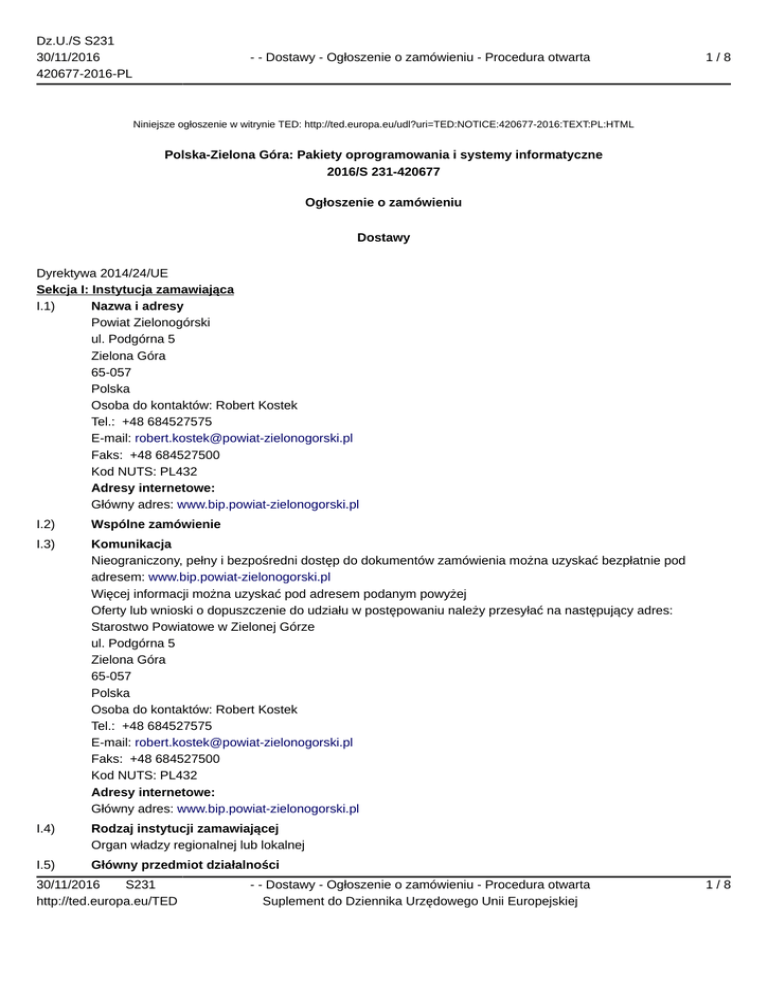 Dz.U./S S231 30/11/2016 420677-2016-PL - - Dostawy - Ogłoszenie o zamówieniu - Procedura otwarta 1/8 Niniejsze ogłoszenie w witrynie TED: http://ted.europa.eu/udl?uri=TED:NOTICE:420677-2016:TEXT:PL:HTML Polska-Zielona Góra: Pakiety oprogramowania i systemy informatyczne 2016/S 231-420677 Ogłoszenie o zamówieniu Dostawy Dyrektywa 2014/24/UE Sekcja I: Instytucja zamawiająca I.1) Nazwa i adresy Powiat Zielonogórski ul. Podgórna 5 Zielona Góra 65-057 Polska Osoba do kontaktów: Robert Kostek Tel.: +48 684527575 E-mail: [email protected] Faks: +48 684527500 Kod NUTS: PL432 Adresy internetowe: Główny adres: www.bip.powiat-zielonogorski.pl I.2) Wspólne zamówienie I.3) Komunikacja Nieograniczony, pełny i bezpośredni dostęp do dokumentów zamówienia można uzyskać bezpłatnie pod adresem: www.bip.powiat-zielonogorski.pl Więcej informacji można uzyskać pod adresem podanym powyżej Oferty lub wnioski o dopuszczenie do udziału w postępowaniu należy przesyłać na następujący adres: Starostwo Powiatowe w Zielonej Górze ul. Podgórna 5 Zielona Góra 65-057 Polska Osoba do kontaktów: Robert Kostek Tel.: +48 684527575 E-mail: [email protected] Faks: +48 684527500 Kod NUTS: PL432 Adresy internetowe: Główny adres: www.bip.powiat-zielonogorski.pl I.4) Rodzaj instytucji zamawiającej Organ władzy regionalnej lub lokalnej I.5) Główny przedmiot działalności 30/11/2016 S231 http://ted.europa.eu/TED - - Dostawy - Ogłoszenie o zamówieniu - Procedura otwarta Suplement do Dziennika Urzędowego Unii Europejskiej 1/8 Dz.U./S S231 30/11/2016 420677-2016-PL - - Dostawy - Ogłoszenie o zamówieniu - Procedura otwarta 2/8 Ogólne usługi publiczne Sekcja II: Przedmiot II.1) Wielkość lub zakres zamówienia II.1.1) Nazwa: E-Geodezja Powiatu Zielonogórskiego. Numer referencyjny: OR.273.7.2016 II.1.2) Główny kod CPV 48000000 II.1.3) Rodzaj zamówienia Dostawy II.1.4) Krótki opis: Przedmiotem zamówienia jest: a. Dostawa biblioteki zdigitalizowanego Państwowego Zasobu Geodezyjnego i Kartograficznego (zwanego dalej PZGiK) z terenu Powiatu Zielonogórskiego zawierającego zbiory danych tekstowych i graficznych przeznaczonych do udostępniania przez Internet. b. Dostawa specjalistycznych aplikacji umożliwiających udostępnienie zasobu w formie e-usług. c.Dostawa sprzętu komputerowego, skanującego, kopiującego, urządzeń do serwerowni wraz z systemami operacyjnymi i oprogramowaniem. Szczegółowy opis przedmiotu zamówienia zawiera załącznik nr 1 do Specyfikacji Istotnych Warunków Zamówienia, zwanej dalej SIWZ. II.1.5) Szacunkowa całkowita wartość II.1.6) Informacje o częściach To zamówienie podzielone jest na części: nie II.2) Opis II.2.1) Nazwa: II.2.2) Dodatkowy kod lub kody CPV 30214000 30213100 30232110 30231300 30216110 30200000 II.2.3) Miejsce świadczenia usług Kod NUTS: PL432 Główne miejsce lub lokalizacja realizacji: Zielona Góra, Sulechów. II.2.4) Opis zamówienia: Przedmiotem zamówienia jest: a.Dostawa biblioteki zdigitalizowanego Państwowego Zasobu Geodezyjnego i Kartograficznego (zwanego dalej PZGiK) terenu Powiatu Zielonogórskiego zawierającego zbiory danych tekstowych i graficznych przeznaczonych do udostępniania przez Internet. b. Dostawa specjalistycznych aplikacji umożliwiających udostępnienie zasobu w formie e-usług. 30/11/2016 S231 http://ted.europa.eu/TED - - Dostawy - Ogłoszenie o zamówieniu - Procedura otwarta Suplement do Dziennika Urzędowego Unii Europejskiej 2/8 Dz.U./S S231 30/11/2016 420677-2016-PL - - Dostawy - Ogłoszenie o zamówieniu - Procedura otwarta 3/8 c. Dostawa sprzętu komputerowego, skanującego, kopiującego, urządzeń do serwerowni wraz z systemami operacyjnymi i oprogramowaniem. W szczególności: a. Dostawa licencji aplikacji. b. Wdrożenie oprogramowania aplikacyjnego realizującego wszystkie wymagane funkcjonalności opisane przez Zamawiającego. c. Przeprowadzenie szkoleń dla użytkowników w tym przeprowadzenie szkoleń dla administratora oraz użytkowników końcowych z funkcjonalności systemu. d. Świadczenie usług gwarancyjnych. e. Opracowanie dokumentacji w tym dokumentacji: szkoleniowej i użytkowej. f. Współpraca z Zamawiającym, w tym wykonywanie zadań związanych z zarządzaniem projektem. g. Przeniesienie w terminach i na zasadach określonych w Projekcie Umowy praw autorskich, licencji przysługujących Wykonawcy, lub które Wykonawca zobowiązany jest nabyć w wyniku realizacji Przedmiotu Zamówienia. Dostawa: Serwera, szafy serwerowej wraz z macierzą dyskową i oprogramowaniem (1 szt.), UPS (3 szt.), Skanerów (4 szt.), Monitorów (7 szt.), Kserokopiarki (1 szt.), UPS Serwerowych (4 szt.), Komputera przenośnego (1 szt.), Komputerów I zestaw (6 szt.), Komputerów II zestaw (10 szt.), Switchrack (2 szt.), Skaneroplotera (1 szt.), Firewall (1 szt., Pakiet oprogramowania biurowego (21 szt.), Licencja na system operacyjny (5 szt.). Usługa połączenia baz danych Zasobu Zamawiającego w Zielonej Górze oraz Sulechowie wraz z przekonwertowaniem baz danych do obowiązujących przepisów. Zakup kompleksowej rozbudowy Systemu Informacji Przestrzennej. Przedmiotem zamówienia w części dotyczącej digitalizacji państwowego zasobu geodezyjnego i kartograficznego jest przekształcenie analogowych danych do postaci cyfrowej, tj. łącznie skanowanie dokumentów i powiązanie zeskanowanego dokumentu z danymi z Systemu. Pracami będzie objęty teren Powiatu Zielonogórskiego. Czynności te będą przeprowadzone w siedzibie Zamawiającego w dwóch lokalizacjach tj. Zielona Góra oraz delegatura w Sulechowie. Ilość kart do skanowania A4 1179720 szt., ilość kart A3 80000 szt., ilość kart A2, A1, A0 15000 szt. II.2.5) Kryteria udzielenia zamówienia Kryteria określone poniżej Kryterium jakości - Nazwa: Czas trwania okresu gwarancyjnego / Waga: 20 % Kryterium jakości - Nazwa: Termin dostawy sprzętu informatycznego / Waga: 20 % Cena - Waga: 60 % II.2.6) Szacunkowa wartość II.2.7) Okre