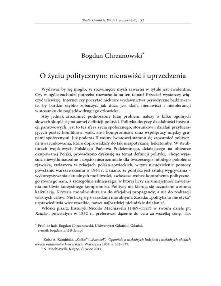 Studia Gdańskie. Wizje i rzeczywistość, t. XI Bogdan Chrzanowski∗ O życiu politycznym: nienawiść i uprzedzenia Wydawać by się mogło, że rozwinięcie myśli zawartej w tytule jest ewidentne. Czy w ogóle zachodzi potrzeba rozważania na ten temat? Przecież wystarczy włączyć telewizję, Internet czy poczytać niektóre wydawnictwa periodyczne bądź zwarte, by bardzo szybko zobaczyć, jak duża jest skala nienawiści i nietolerancji w stosunku do poglądów drugiego człowieka. Aby jednak zrozumieć podnoszony tutaj problem, należy w kilku ogólnych słowach skupić się na samej definicji polityki. Polityka dotyczy działalności instytucji państwowych, jest to też sfera życia społecznego, stosunków i działań przybierających postać konfliktów, walk, ale i kompromisów oraz współpracy między grupami społecznymi. Już podczas II wojny światowej starano się zrozumieć polityczne uwarunkowania, które doprowadziły do tak niespotykanej hekatomby. W strukturach wojskowych Polskiego Państwa Podziemnego, działającego na obszarze okupowanej Polski, prowadzono dyskusję na temat definicji polityki, chcąc wyjaśnić niewytłumaczalne i często niezrozumiałe dla ówczesnego młodego pokolenia zjawiska, zwłaszcza w relacjach polsko-sowieckich, w tym nieudzielenie pomocy powstaniu warszawskiemu w 1944 r. Uznano, że polityka jest sztuką wygrywania – wykorzystywania aktualnych możliwości, zwłaszcza wobec kontrahenta politycznego równego nam, a szczególnie silniejszego, w której liczy się umiejętność zawierania możliwie korzystnego kompromisu. Politycy nie kierują się uczuciami a zimną kalkulacją. Kryteria moralne służą im do oficjalnej propagandy, a nie do realizacji własnych celów. Nie liczą się z zasadami moralnymi. Zasada: „polityka to nie etyka” usprawiedliwia więc wszelkie, nawet najbardziej nieludzkie działania1. Włoski pisarz, historyk Nicollo Machiavelli (1469–1527) w swoim dziele pt. Książę2, powstałym w 1532 r., preferował dążenie do celu za wszelką cenę. Tak ∗ Prof. dr hab. Bogdan Chrzanowski, Uniwersytet Gdański, Gdańsk e-mail: [email protected] 1 Zob.: A. Kamiński, „Zośka” i „Parasol”. Opowieść o niektórych ludziach i niektórych akcjach dwóch batalionów harcerskich, Warszawa 1957, s. 532–537. 2 N. Machiavelli, Książę, Gliwice 2011. Bogdan Chrzanowski zwany makiawellizm stał się źródłem doktryny stosującej zasadę równej wartości środków w dojściu do zamierzonego celu (późniejszy kanon „cel uświęca środki”; aczkolwiek sam Machiavelli nigdy nie wypowiedział tych słów). Z kolei pruski generał, teoretyk wojskowości Karl von Clausewitz (1780–1831) w swoim słynnym dziele O wojnie napisał: Każdą wojnę można uważać za działanie polityczne. Uważał, iż: Wojna to przedłużenie polityki. Dalej stwierdził, że wojna jest (…) aktem przemocy mającym na celu zmuszenie przeciwnika do spełnienia naszej woli3. Prof. Franciszek Ryszka porównał wojnę do trzęsienia ziemi. Tak jak geologowie starają się przewidzieć jego groźne i tragiczne następstwa, tak polityk powinien skoncentrować swoje wysiłki na powstrzymaniu ewentualnego kataklizmu wojennego. Pewien dyplomata brytyjski powiedział, że polityk jest lepiej przygotowany do walki niż żołnierz, gdyż jego działalność to ciągła walka, natomiast żołnierz walczy jedynie w konkretnych sytuacjach. Do czego może doprowadzić nienawiść oraz nietolerancja w życiu politycznym i społecznym? Do zwalczania tzw. wrogów poprzez aresztowania, umieszczanie ich w więzieniach i różnego rodzaju obozach, wreszcie – do likwidacji fizycznej. Zatem będziemy tu mieli do czynienia ze zbrodnią a nawet z ludobójstwem. Właśnie nienawiść i uprzedzenie prowadzi do zbrodni ludobójstwa. W znanej powieści science-fiction pt. Genocide (Ludobójstwo)4 pióra pisarza amerykańskiego Thomasa M. Discha przedstawiono kosmiczne mocarstwo, które likwiduje fizycznie Ziemian w celu oczyszczenia naszej planety z tych „szkodliwych insektów”. Eksterminacja ta jest konieczna do stworzenia odpowiednich warunków dla realizacji planu rolnego. Czy to tylko fikcja? Wydarzenia następujące na przestrzeni wielu lat historii wskazują, że niestety taka była nasza rzeczywistość. W filmie Kosmos 19995 przedstawiciele cywilizacji pozaziemskiej podczas spotkania z Ziemianami nie mogli zrozumieć, dlaczego ci represjonowali innych ludzi jedynie z powodu odmiennych przekonań religijnych czy politycznych, wywoływali wojny – aż do dokonania samozniszczenia swojej planety – po to, by zabrać czyjąś ziemię lub wprowadzić na siłę własną ideologię. Dla Ziemian była to sprawa oczywista! Czy tego typu zjawiska występują tylko w XX i XXI wieku? Niestety, takie negatywne uczucia i postawy towarzyszyły ludzkości od samego początku. Wiążą się z tym zbrodnie często popełniane na masową skalę. Już w starożytności mieliśmy do czynienia z zaplanowanym ludobójstwem. Wystarczy przytoczyć tutaj losy ludności Babilonu wymordowanej w 689 r. p.n.e. 3 Cyt. za: F. Ryszka, Polityka i wojna. Świadomość potoczna a teorie XX wieku, Warszawa 1973, s. 27–31 i n. Zob. także: idem, Historia-polityka-państwo. Wybór studiów, t. I, Toruń 2002. 4 Th. M. Dish, Genocide, New York 1965. 5 Kosmos 1999, reż. R. Austin, B. Brooks i in., Wlk. Brytania, USA, Włochy 1975–1997, serial. 88 O życiu politycznym: nienawiść i uprzedzenia i ludności wyspy Melos w 416 r. p.n.e., masakry dokonywane przez żołnierzy Aleksandra Wielkiego w Persji, zburzenie Kartaginy przez Rzymian i śmierć oraz sprzedaż w niewolę blisko 150 000 jej mieszkańców w 146 r. p.n.e. W średniowieczu, w XIII w. zniknęło z mapy Bliskiego Wschodu miasto Herat, którego ludność zginęła w wyniku najazdu mongolskiego. Zabicie ponad 280 000 chrześcijan w Japonii w XVI i XVII wieku, Żydów w Hiszpanii zapisało się krwawymi zgłoskami