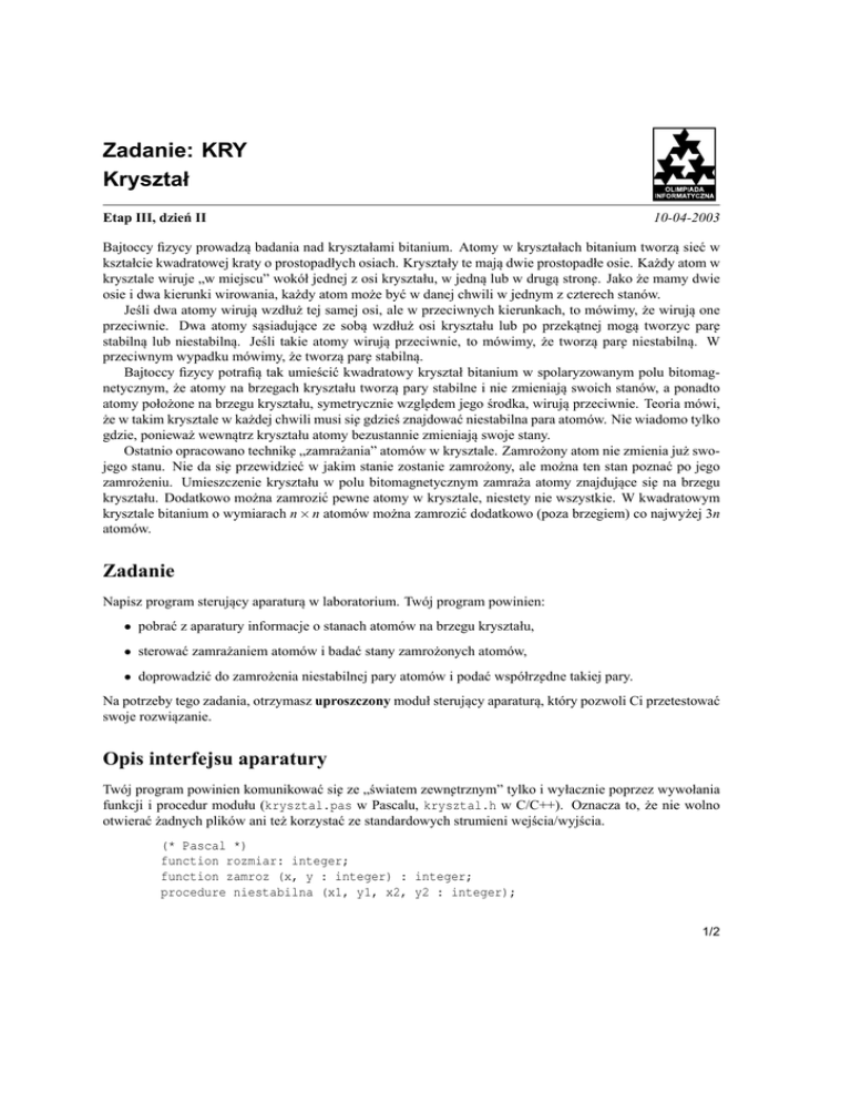 Zadanie: KRY Kryształ Etap III, dzień II 10-04-2003 Bajtoccy fizycy prowadza˛ badania nad kryształami bitanium. Atomy w kryształach bitanium tworza˛ sieć w kształcie kwadratowej kraty o prostopadłych osiach. Kryształy te maja˛ dwie prostopadłe osie. Każdy atom w krysztale wiruje „w miejscu” wokół jednej z osi kryształu, w jedna˛ lub w druga˛ stron˛e. Jako że mamy dwie osie i dwa kierunki wirowania, każdy atom może być w danej chwili w jednym z czterech stanów. Jeśli dwa atomy wiruja˛ wzdłuż tej samej osi, ale w przeciwnych kierunkach, to mówimy, że wiruja˛ one przeciwnie. Dwa atomy sasiaduj ˛ ace ˛ ze soba˛ wzdłuż osi kryształu lub po przekatnej ˛ moga˛ tworzyc par˛e stabilna˛ lub niestabilna.˛ Jeśli takie atomy wiruja˛ przeciwnie, to mówimy, że tworza˛ par˛e niestabilna.˛ W przeciwnym wypadku mówimy, że tworza˛ par˛e stabilna.˛ Bajtoccy fizycy potrafia˛ tak umieścić kwadratowy kryształ bitanium w spolaryzowanym polu bitomagnetycznym, że atomy na brzegach kryształu tworza˛ pary stabilne i nie zmieniaja˛ swoich stanów, a ponadto atomy położone na brzegu kryształu, symetrycznie wzgl˛edem jego środka, wiruja˛ przeciwnie. Teoria mówi, że w takim krysztale w każdej chwili musi si˛e gdzieś znajdować niestabilna para atomów. Nie wiadomo tylko gdzie, ponieważ wewnatrz ˛ kryształu atomy bezustannie zmieniaja˛ swoje stany. Ostatnio opracowano technik˛e „zamrażania” atomów w krysztale. Zamrożony atom nie zmienia już swojego stanu. Nie da si˛e przewidzieć w jakim stanie zostanie zamrożony, ale można ten stan poznać po jego zamrożeniu. Umieszczenie kryształu w polu bitomagnetycznym zamraża atomy znajdujace ˛ si˛e na brzegu kryształu. Dodatkowo można zamrozić pewne atomy w krysztale, niestety nie wszystkie. W kwadratowym krysztale bitanium o wymiarach n × n atomów można zamrozić dodatkowo (poza brzegiem) co najwyżej 3n atomów. Zadanie Napisz program sterujacy ˛ aparatura˛ w laboratorium. Twój program powinien: • pobrać z aparatury informacje o stanach atomów na brzegu kryształu, • sterować zamrażaniem atomów i badać stany zamrożonych atomów, • doprowadzić do zamrożenia niestabilnej pary atomów i podać współrz˛edne takiej pary. Na potrzeby tego zadania, otrzymasz uproszczony moduł sterujacy ˛ aparatura,˛ który pozwoli Ci przetestować swoje rozwiazanie. ˛ Opis interfejsu aparatury Twój program powinien komunikować si˛e ze „światem zewn˛etrznym” tylko i wyłacznie poprzez wywołania funkcji i procedur modułu (krysztal.pas w Pascalu, krysztal.h w C/C++). Oznacza to, że nie wolno otwierać żadnych plików ani też korzystać ze standardowych strumieni wejścia/wyjścia. (* Pascal *) function rozmiar: integer; function zamroz (x, y : integer) : integer; procedure niestabilna (x1, y1, x2, y2 : integer); 1/2 /* C/C++ */ int rozmiar(void); int zamroz (int x, int y); void niestabilna (int x1, int y1, int x2, int y2); Twój program powinien najpierw uruchomić aparatur˛e wywołujac ˛ funkcj˛e rozmiar, której wynikiem jest rozmiar kryształu n, 3 ≤ n ≤ 10 000. Badany kryształ ma wymiary n × n atomów. Atomy w krysztale identyfikujemy za pomoca˛ współrz˛ednych całkowitych (x, y), 1 ≤ x, y ≤ n. Wywołanie funkcji zamroz(x, y) (dla 1 ≤ x, y ≤ n) powoduje zamrożenie atomu o współrz˛ednych (x, y), a wynikiem funkcji jest stan zamrożonego atomu. Stany atomów sa˛ reprezentowane przez liczby −2, −1, 1 lub 2. Wartość bezwzgl˛edna liczby określa oś wokół której wiruje atom, a jej znak określa kierunek wirowania atomu. (Zwróć uwag˛e, że nie ma znaczenia, która oś jest reprezentowana przez liczby 1 i −1, a która przez 2 i −2, oraz który kierunek wirowania jest reprezentowany przez liczby ujemne, a który przez dodatnie.) Atomy na brzegu kryształu w momencie uruchomienia aparatury sa˛ już zamrożone. Zamrożenie już zamrożonego atomu nie zmienia jego stanu. Można co najwyżej 3n razy wywołać funkcj˛e zamroz dla atomów położonych we wn˛etrzu kryształu. Dla atomów położonych na brzegu kryształu można ja˛ wywoływać dowolnie wiele razy. Po wyznaczeniu niestabilnej pary (x1 , y1 ), (x2 , y2 ), Twój program powinien wywołać procedur˛e niestabilna (x1 , y1 , x2 , y2 ). Wywołanie tej procedury kończy działanie programu. Jeśli w krysztale jest wiele par niestabilnych atomów, to Twój program powinien wskazać jedna˛ z nich. Przykład Przykładowa interakcja z programem może wygladać ˛ nast˛epujaco: ˛ rozmiar() = 5 zamroz (1, 1) = zamroz (1, 2) = zamroz (1, 3) = zamroz (1, 4) = zamroz (1, 5) = zamroz (2, 5) = zamroz (3, 5) = zamroz (4, 5) = zamroz (3, 3) = zamroz (2, 2) = zamroz (4, 2) = zamroz (3, 2) = niestabilna (3, 1 1 1 1 2 2 2 2 2 1 -1 -2 2, 3, 3) 5 2 2 2 2 -1 4 1 ? ? ? -1 y 3 1 ? 2 ? -1 2 1 1 -2 -1 -1 1 1 -2 -2 -2 -2 1 2 3 4 5 x 2/2